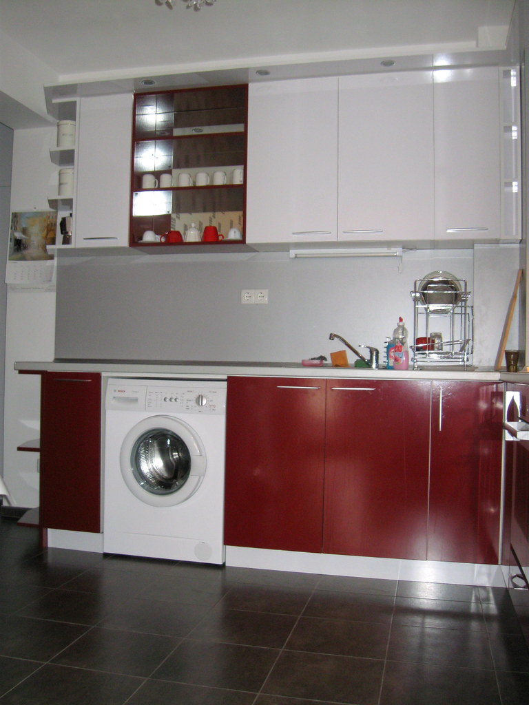 Красива и функционална кухня с изчистени линии в атрактивно бордо и нежно бяло с гланцово покритие. Електроуредите също са бели. Хоризонталния кухненски плот е с голяма работна площ, бял Термопал, а вертикалния плот е бяло ПДЧ гланц. Витрините на горния ред са от ПДЧ с матирано бяло стъкло. Отворения шкаф етажерка е с огледален гръб, който отразява светлината и разчупва линията на горния ред шкафове. Редът завършва заоблена декоративна етажерка. Горния ред е решен с пано с луни.