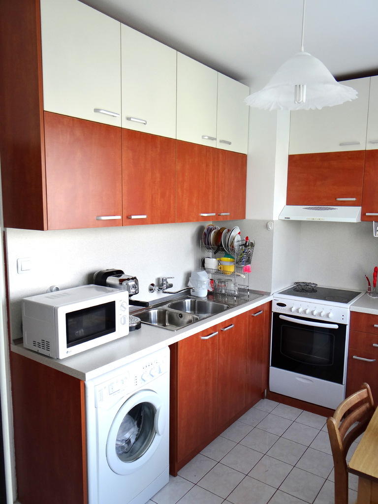 Кухнята е изработена от ламинирано ПДЧ в цветове махагон и слонова кост, плота и гърба са светли. Уредите не са за вграждане, но въпреки това пространството е усвоено максимално. Горния ред шкафове е почти до тавана за повече функционалност. Моделът може да се изработи в богата цветова гама и размери на клиента.