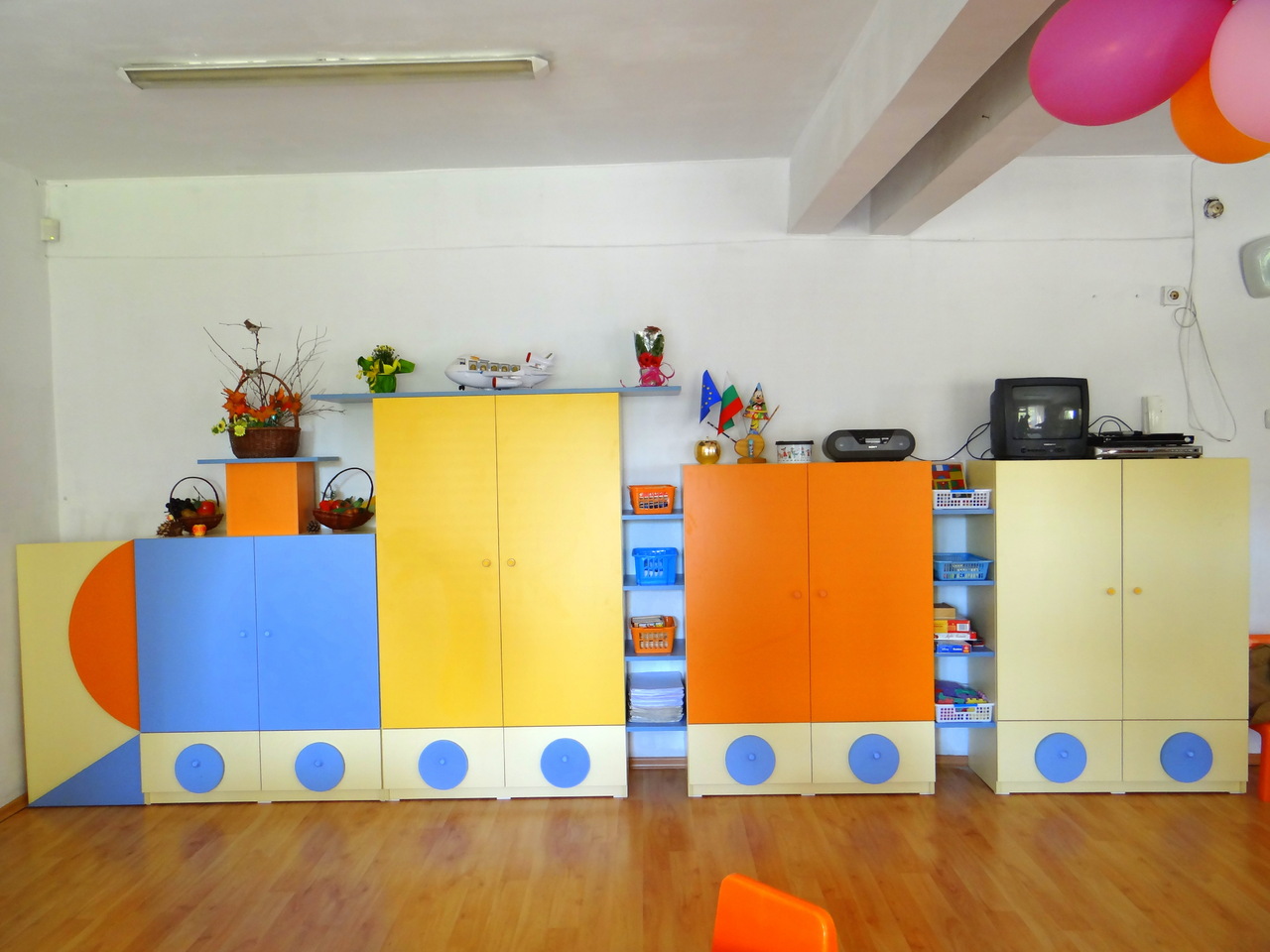 Шкафа е проектиран и изработен като влакче, създавайки настроение в групата. Той е съобразен изцяло с нуждите на градинска група, като е разделена на модули с врати изцяло затворени за прибиране на консумативи, отворени части за играчки и рафт за телевизора и останалата техника. Всички дидактични шкафове се изработват изцяло по поръчка с богат избор на цветови решения.