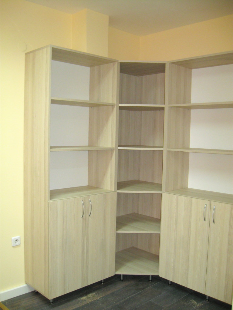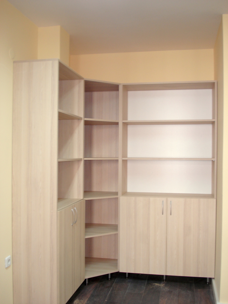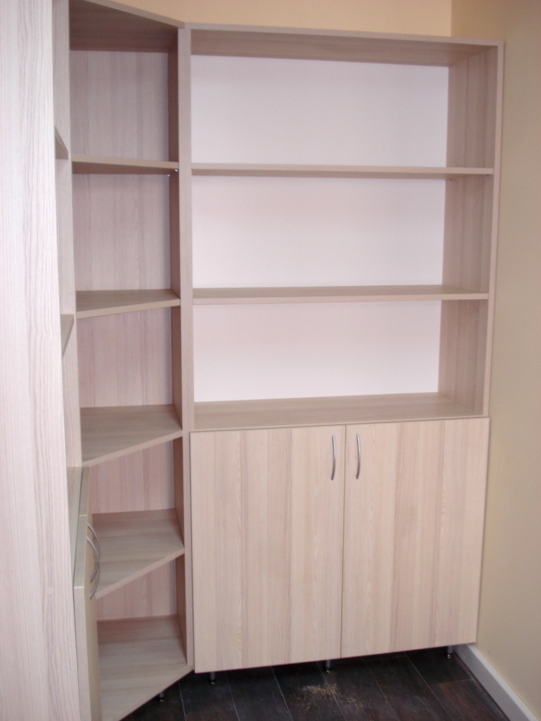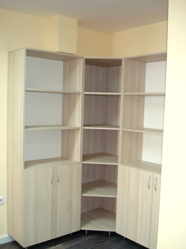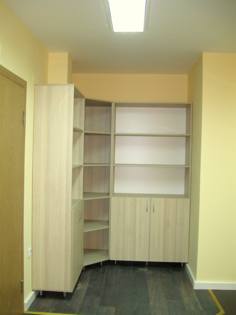 Този шкаф може да играе ролята на помощен шкаф за комсумативи и документи за офиса или като дидактичен шкаф за детска градина, може да се ползва и в дома като допълнение към обзавеждането във всекидневната или хола. Нестандартните помещения като това предполагат и нестандартни мебели, за да се използва напълно капацитета им. Най-удачния вариант естествено е поръчването на мебели по размер. Шкафа може да бъде изработем в богата цветова гама на декорите, по ваши размери.