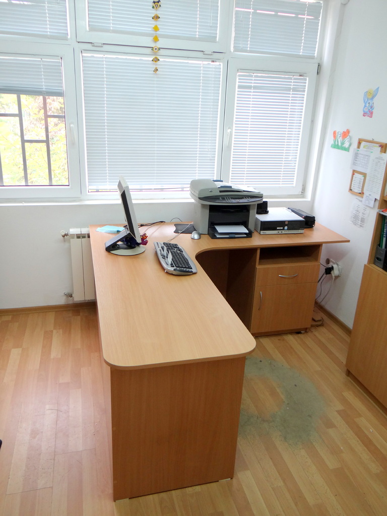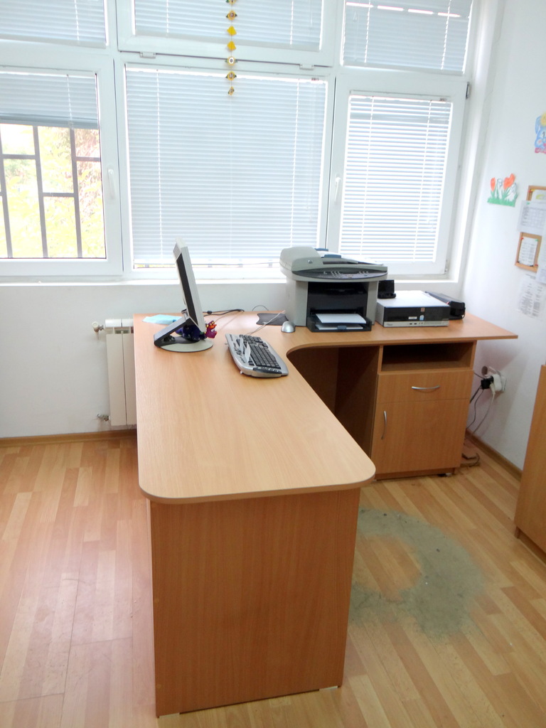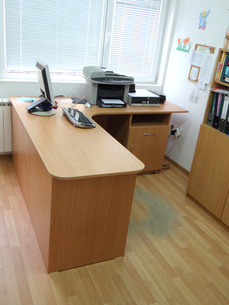 Бюрото е изработено изцяло от ламинирано ПДЧ цвят бук. Бюрото е много функционално, подходящо за офис бюро, учителско или възпитателско работно място. Работния плот е заоблен в ъглите. В единия край е предвидено шкафче и едно чекмедже, а под работния плот има обособен отворен рафт за текущи документи. Моделът се изработва в богата цветова гама и по размери на клиента.