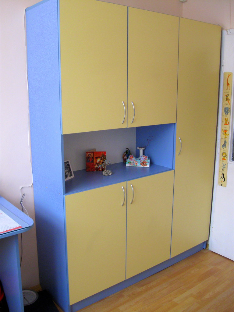 Шкафът е изработен по поръчка за лекарски кабинет в детска градина, което налага използването на нежни и уютни цветове.Шкафа се предлага в богата цветова гама и размери за клиента.