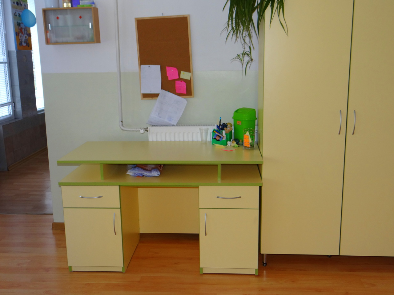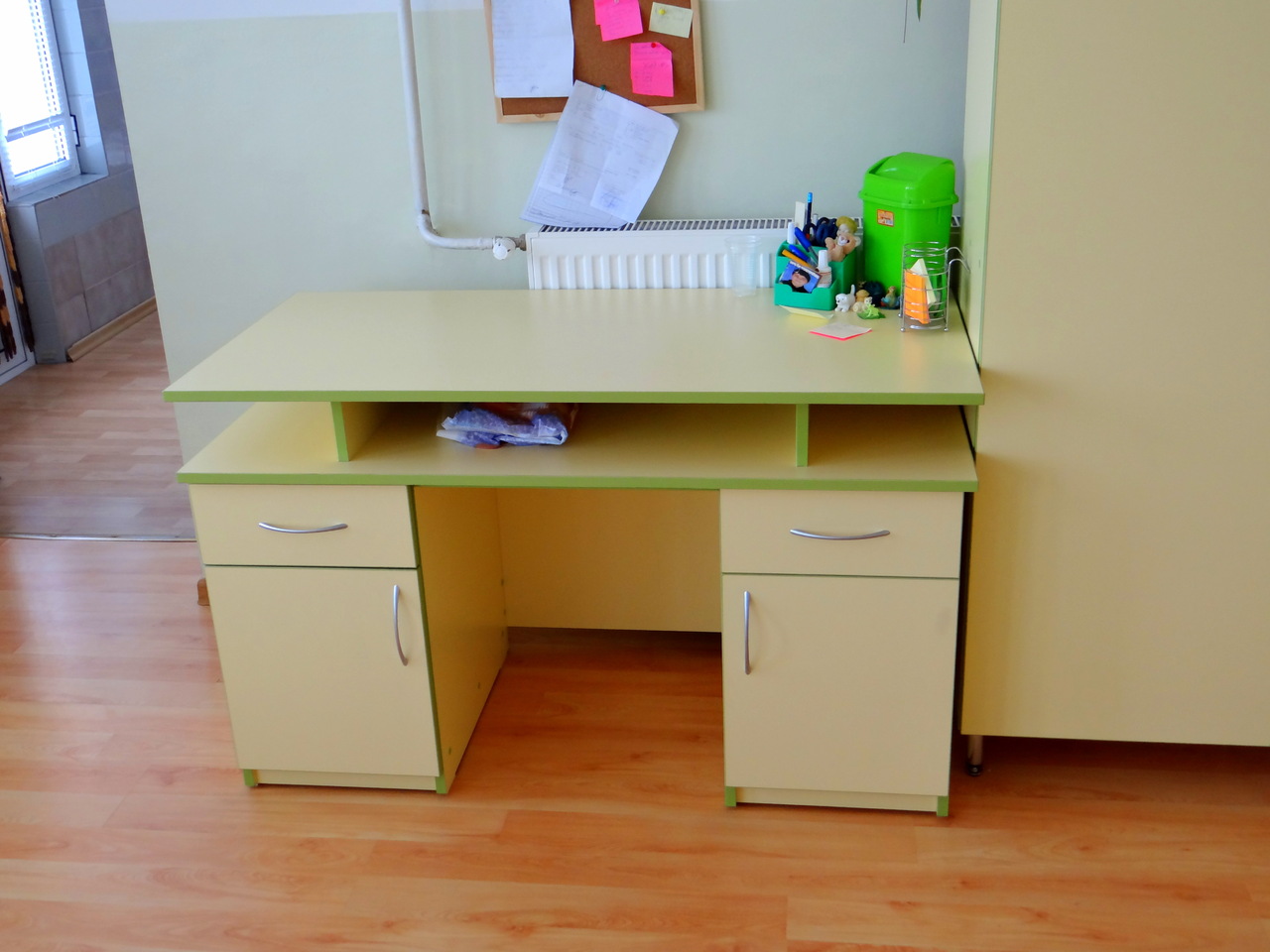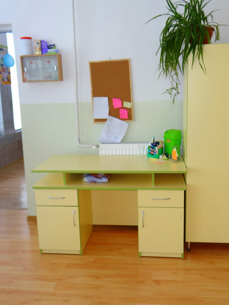 Бюрото е изработено изцяло от ламинирано ПДЧ, като основния цветя е линоново сорбе/жълт пастел/, а кантовете са бледо зелени, за да очетратя контурите, без да има натрапчиви комбинации. Бюрото е много функционално и същевременно компактно, подходящо както за детска стая, така и за учителско или възпитателско работно място. От девете страни на мястото за сядане са предвидени две шкафчета с по едно чекмедже, а под работния плот има обособен отворен рафт за текущи документи. Моделът се изработва в богата цветова гама и по размери на клиента.