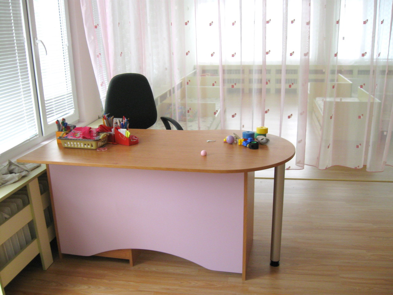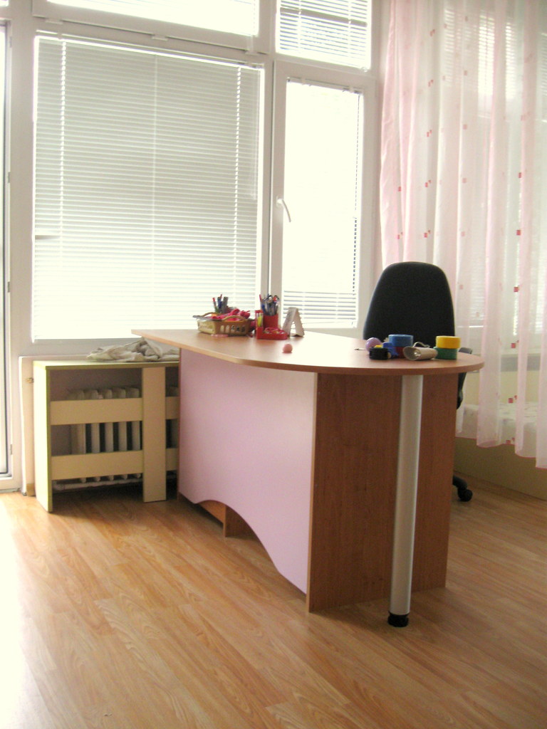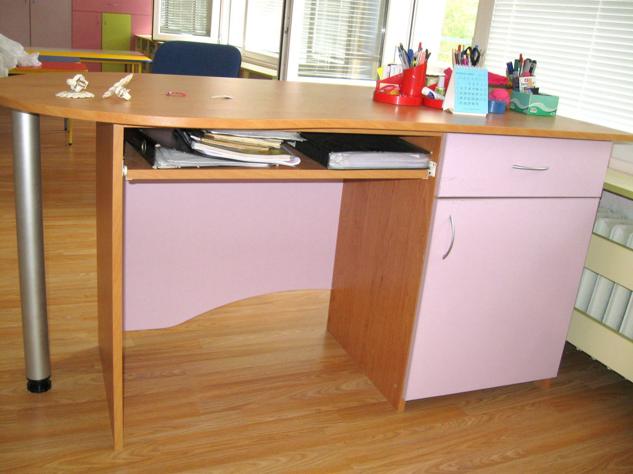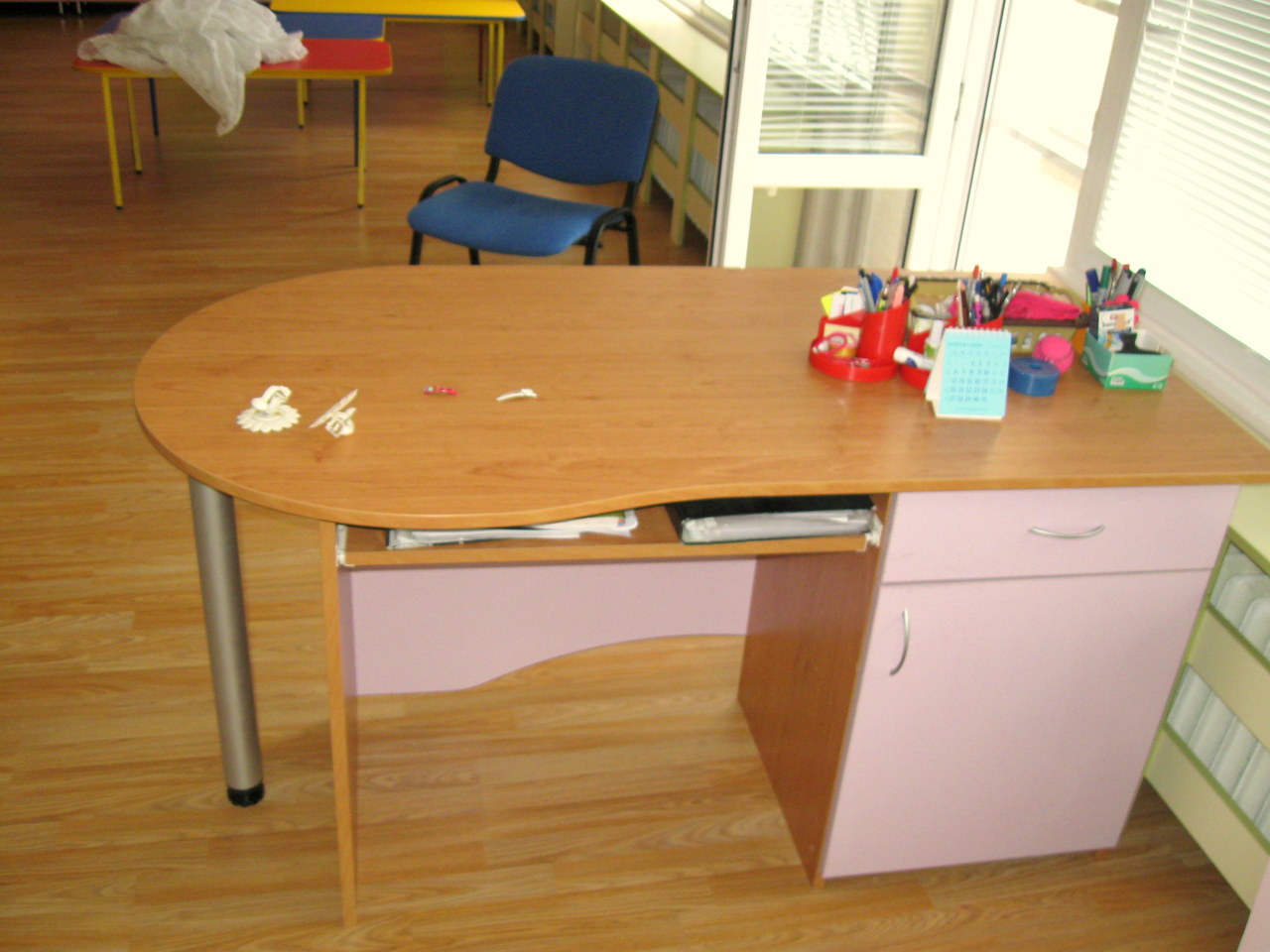 Бюрото е практично с чекмедже и шкафче и функционален заоблен плот, тъй като бюрото е проектирано за детска градина - учителско бюро. Материала е ПДЧ. Бюрото се произвежда в разнообразни цветове по размери на клиента.