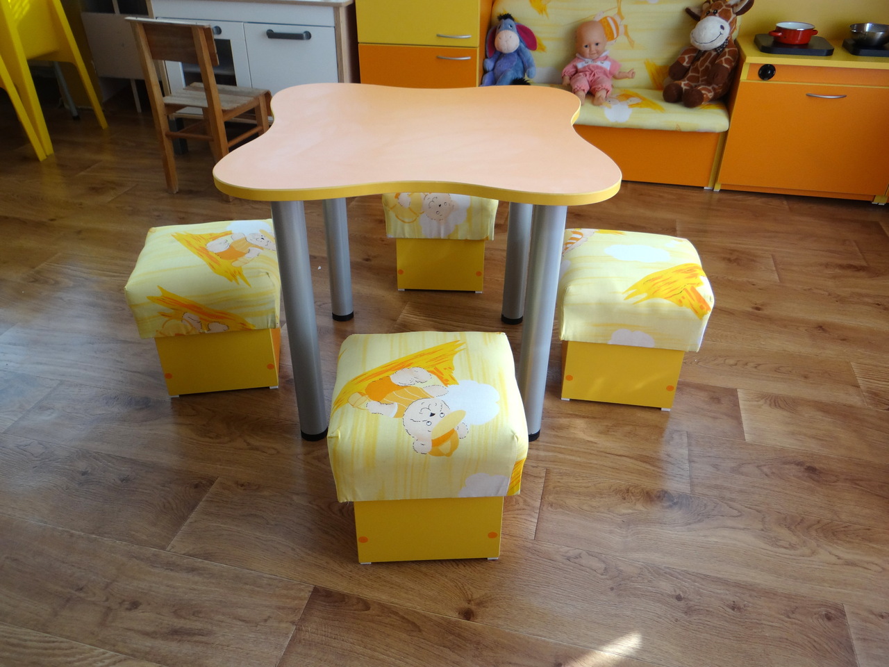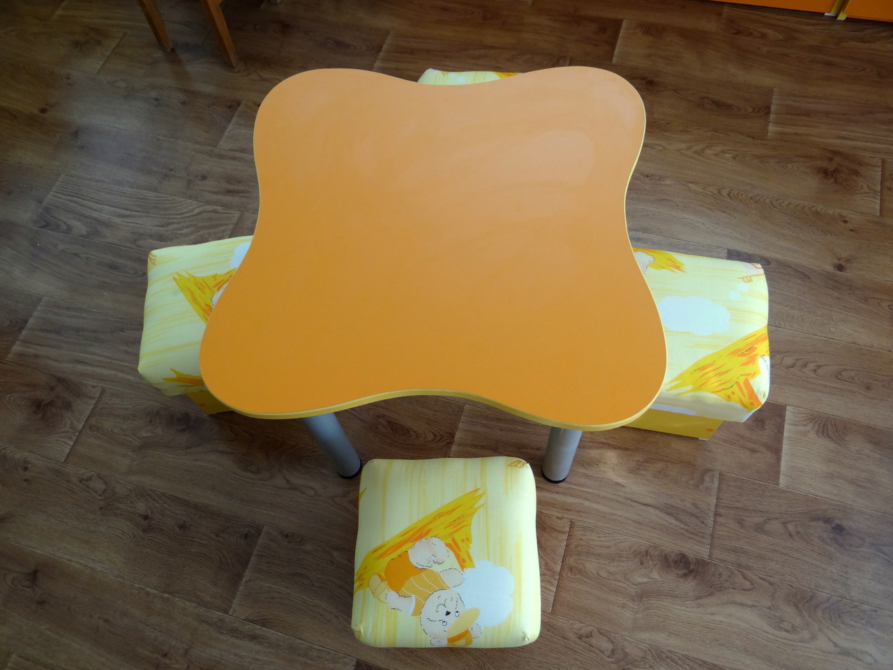 Масичка във формата на цвете с четири табуретки в комплекта. Плота на масата и основата на табуретките са от ПДЧ, а краката на масата са метални с възможност за нивелиране при неравен под. цветовите комбинации са разнообразни в зависимост от вашето желание. Размерите също могат да бъдат променяни.