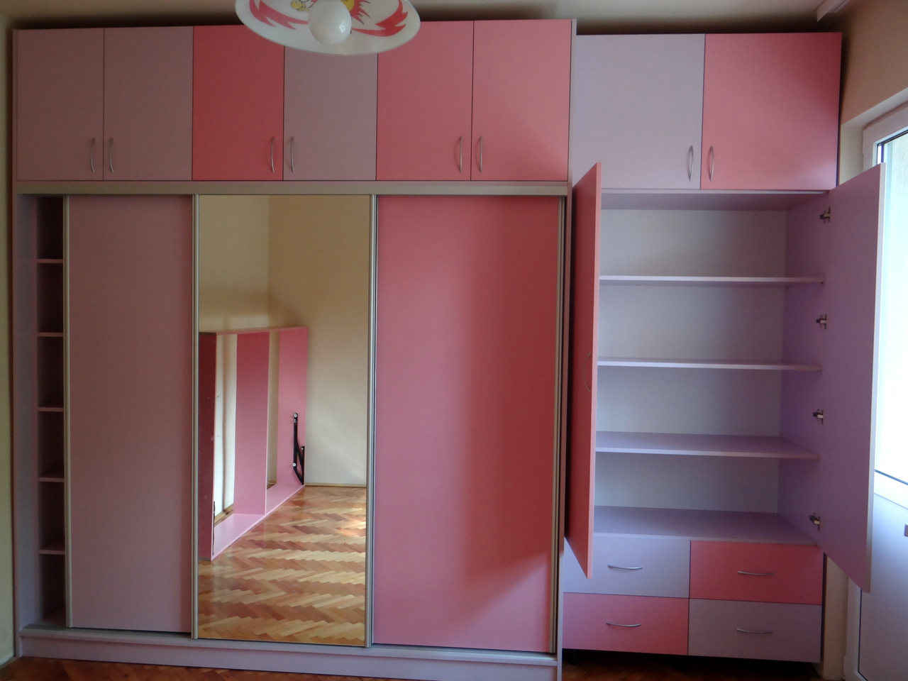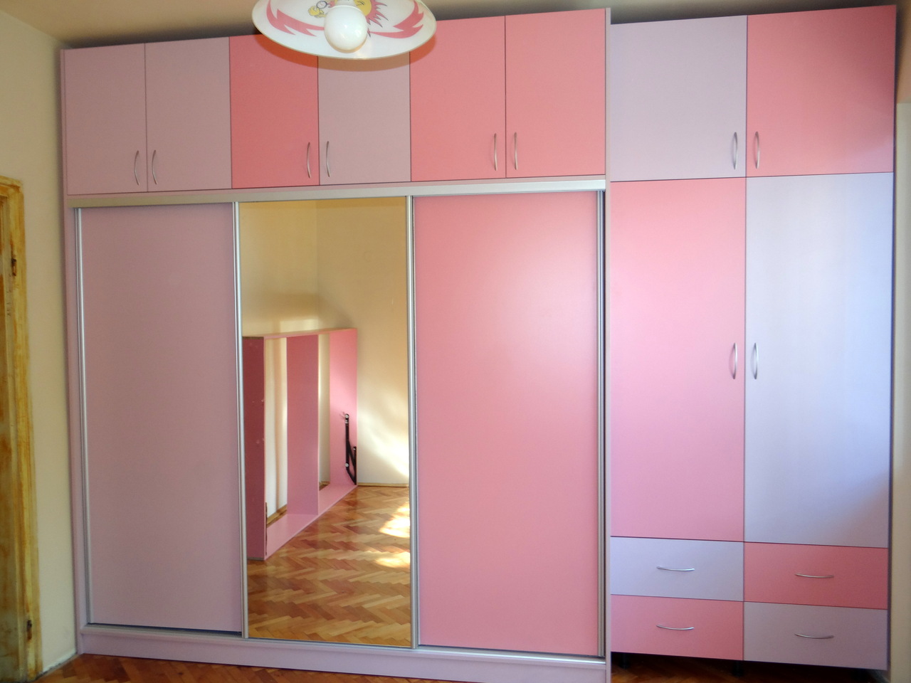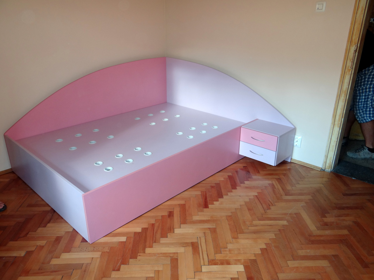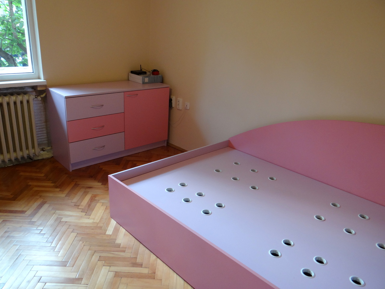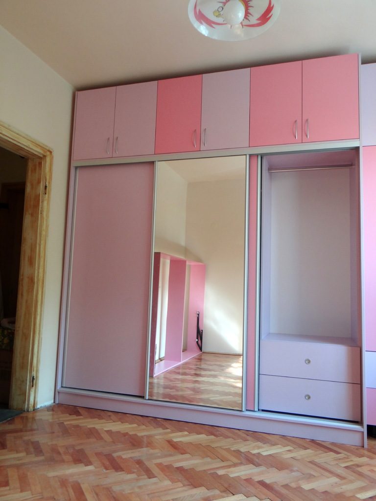 Обзавеждането се състои от гардероб в две части - еднат част е трикрилна с плъзгащи врати и огледало и вдна двукрилна част с чекмеджета и надстройка. Леглото е голямо с твърда подматрачна рамка с повдигащ механизъм, като пространството под леглото е обособено за съхранение на багаж. Към леглото има и нощно шкафче. Обзавеждането е завършено от скрин е същата цветова гама. Всички артикули в тази конфигурация се изработват и по отделно в богат цветова гама и размери на клиента.