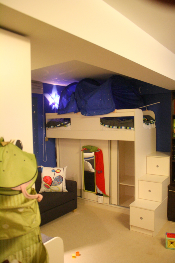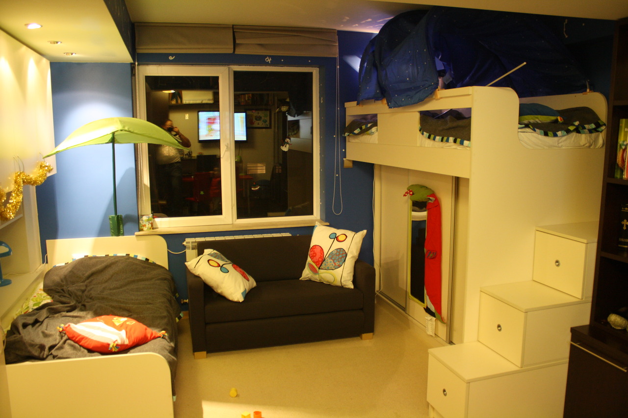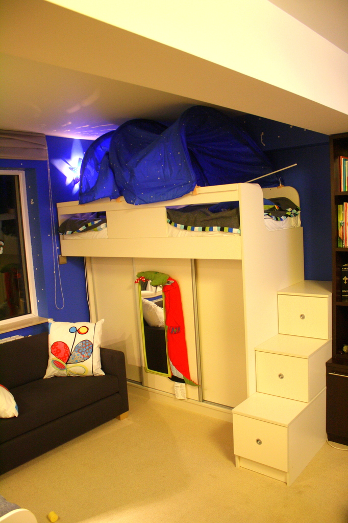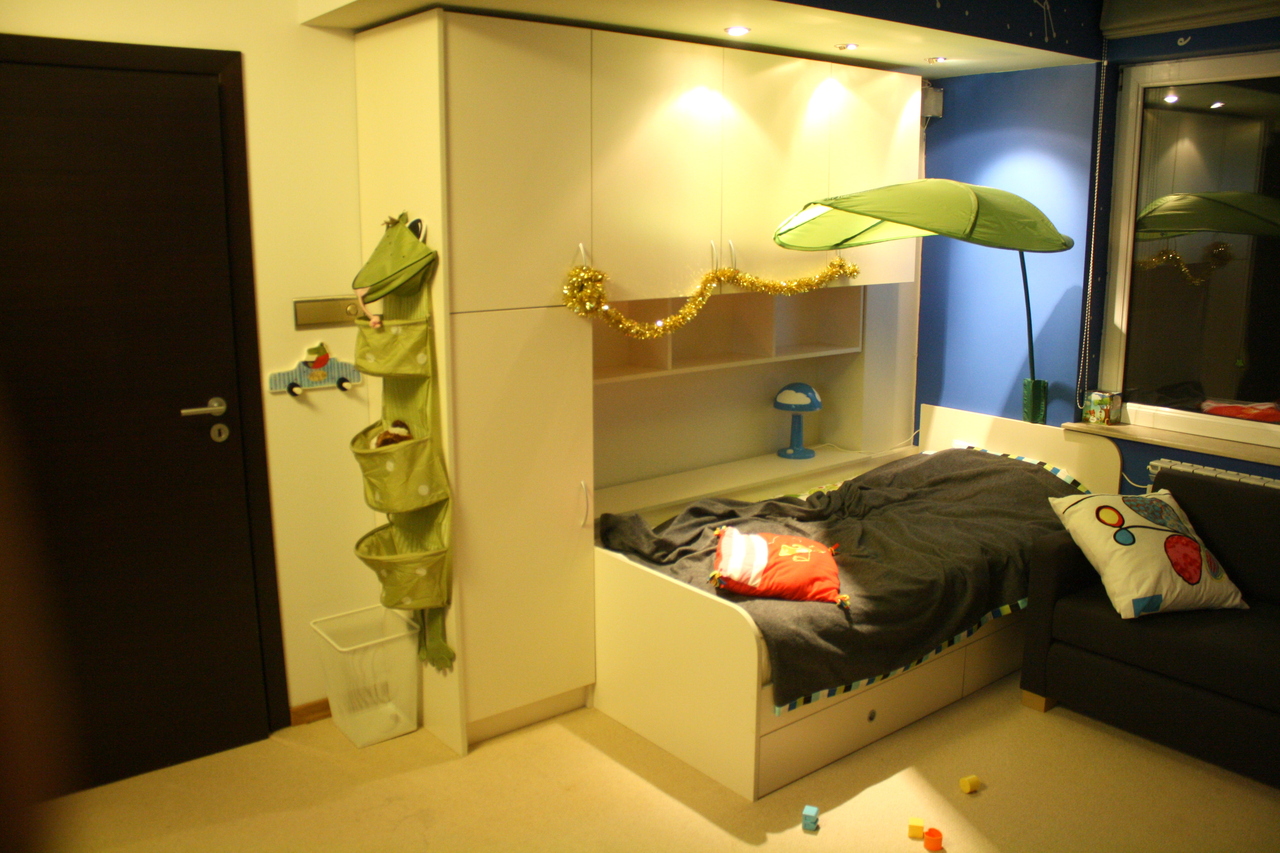 Едното легло е с чекмеджета за дрехи под метрака а над него има шкафове, второто е върху гардероба с плъзгащи врати едната от които е огледална, стълбичките са шкафчета за играчки.