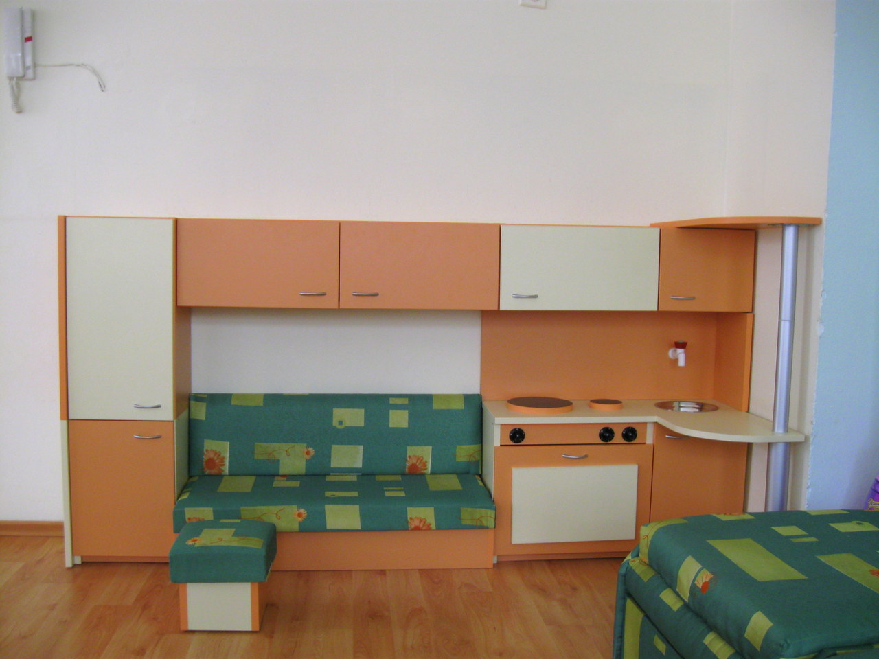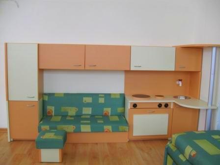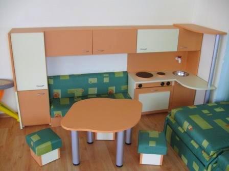 Детските кътове за игра имитиращи любими места на децата от къщата или от света на възрастните е едно от най- търсените решения. Детската кухня съдържа задължителните елементи на съвременната кухня - печка, мивка, хладилник, кухнески шкафове и работен плот, както и декоративен плот. Всеки детски кът се изработва изцяло по поръчка в богара цветова гама и индивидуални размери. В ценат не влизат масичката и табуретките.