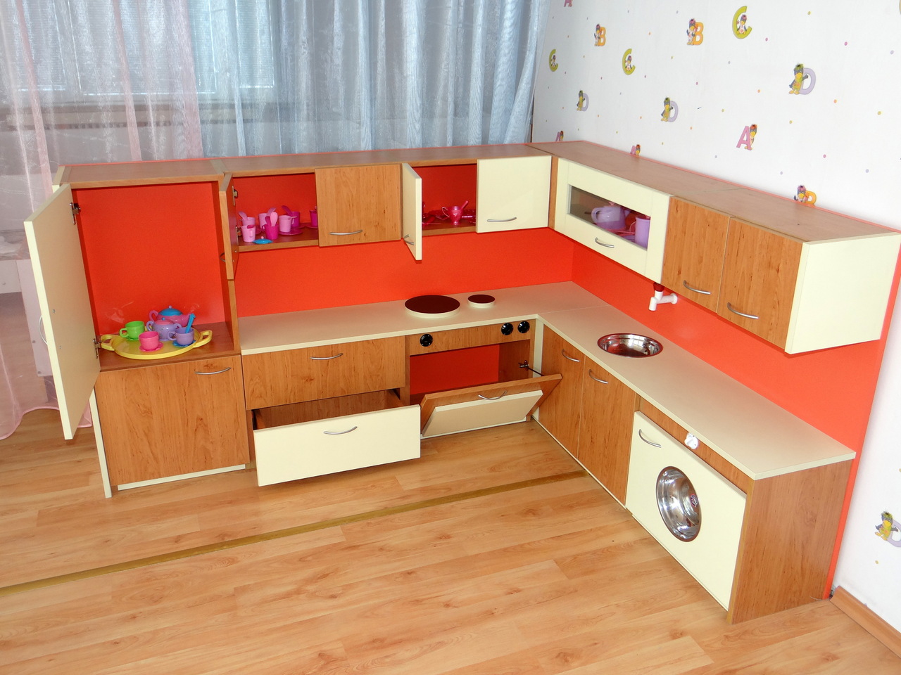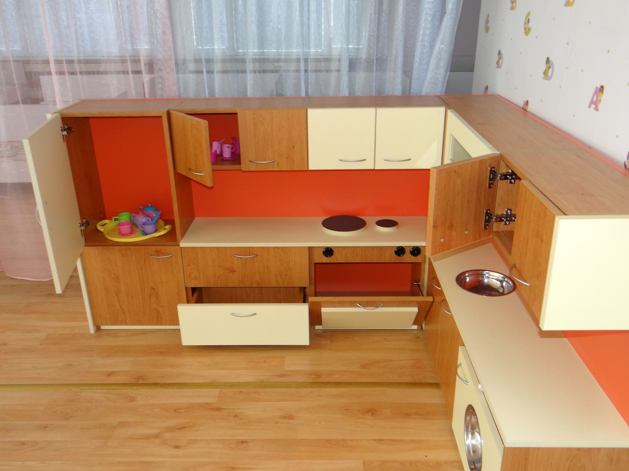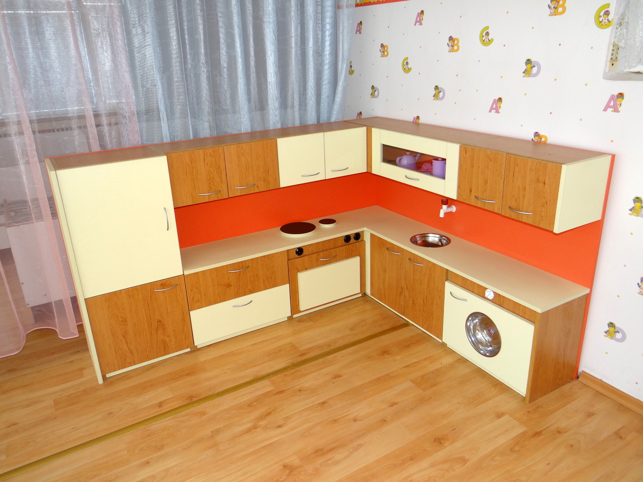Детската кухничка е едно от най-интерсните кътове за игра. Тя напълно имитира съвременната кухня в умален вариант. Свежите цветови комбинации я правят още по любима на малчуганите. Детската кухня има всички необходими елементи на кухненското обзавеждане - мивка, печка, хладилник, плот. Моделът може да бъде изработен по размери зададени от клиента в богата цветова гама. Детското обзавеждане се предлага и на разсрочено плащане.