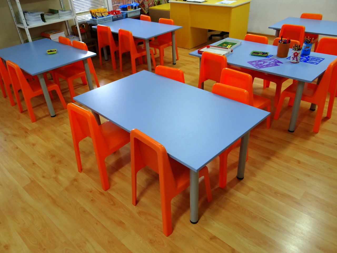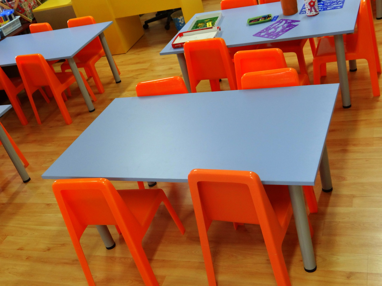 Масата е изработена от ПДЧ с алуминиеви крака, които имат възможност за много лесна нивелация. Масичките се изработват в богата цветова гама и са предвидени за 6 деца. Разбира се има възможност за изработка на плотовете със заоблени краища.