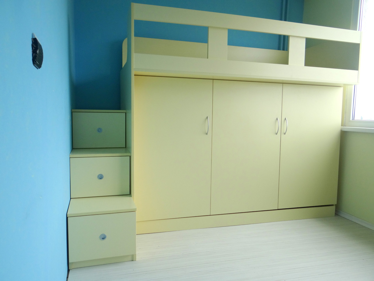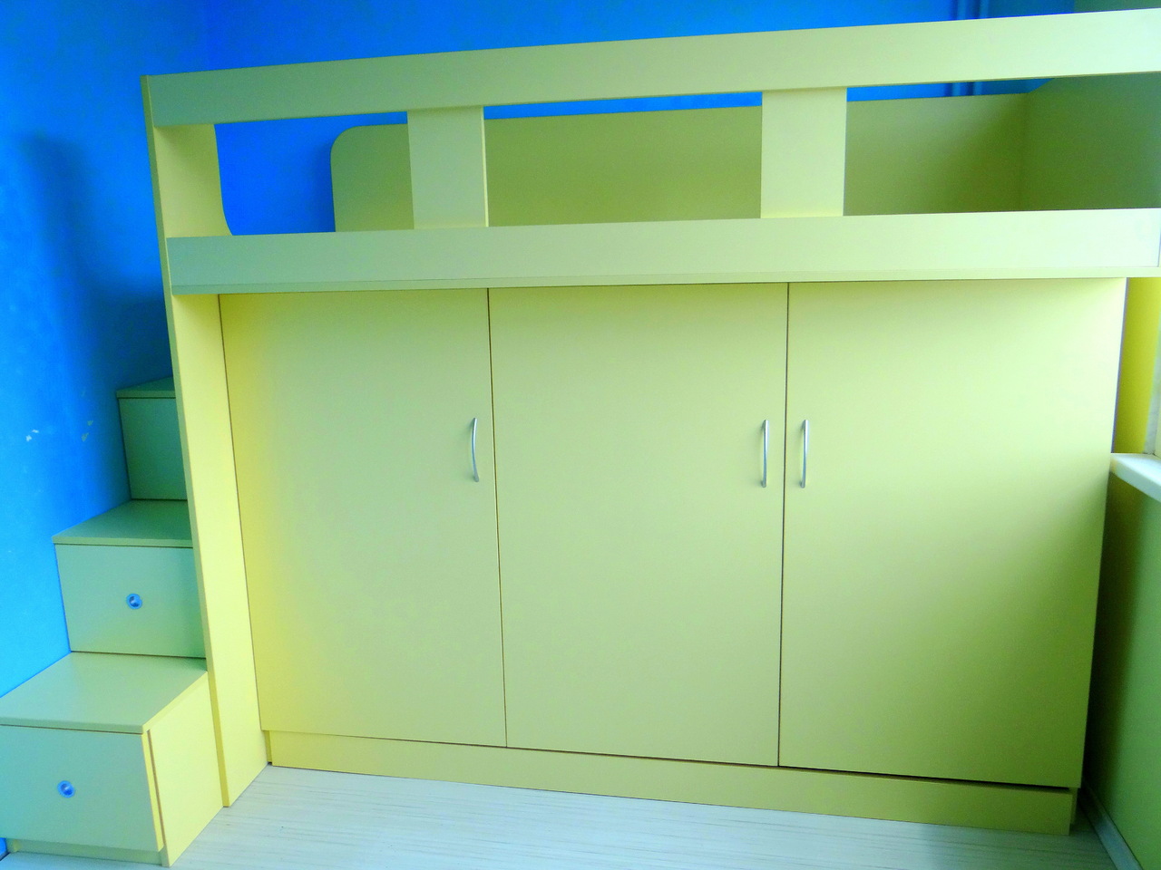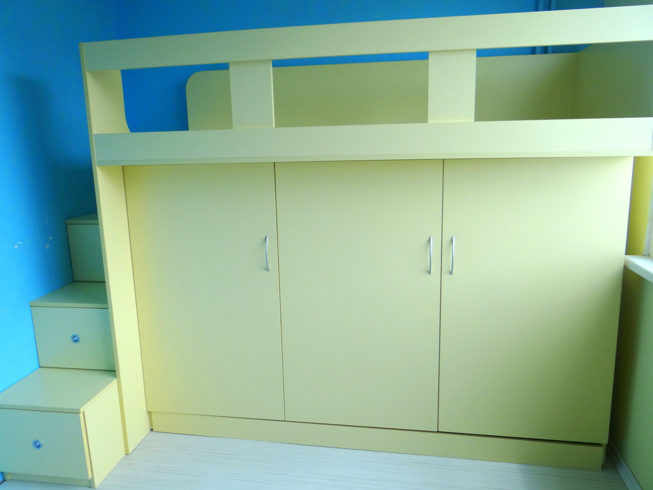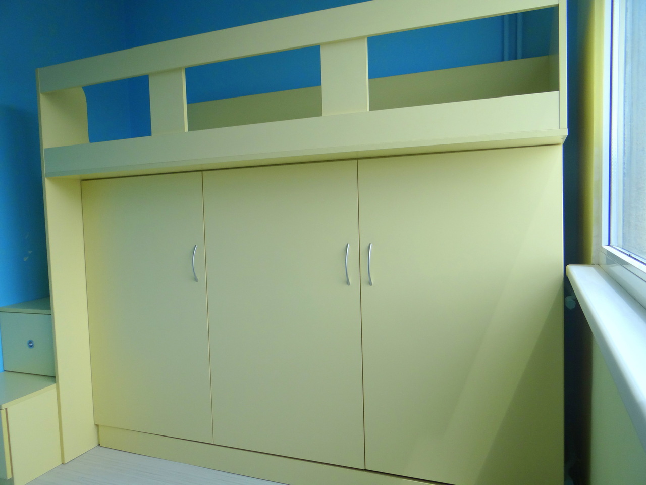 Детското легло е проектирано, така че да пести максимално пространство в детската стая и същевременно да е практично и удобно за ползване. Не на последно място важна е и визията на детското легло. Стълбичките са едновременно и чекмеджета, а пространството под леглото е усвоено като гардеробче. Моделът се изработва в богата цветова гама и индивидуални размери на клиента.