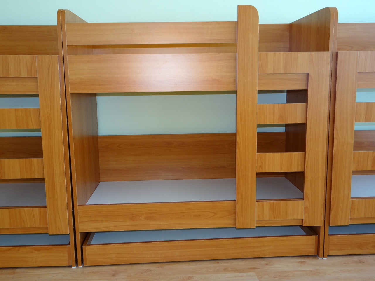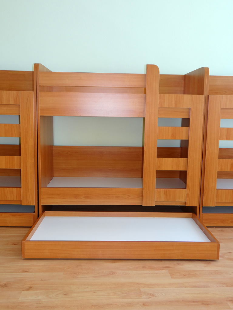 Този модел легло е много компактен и пести място в малките пространства. Комбинацията между легло тип сандвич и двуетажно легло може да се приложи, както в този вариант, така и в модел четириетажно легло. Леглото се изработва от ПДЧ с твърда помматрачна рамка също от ПДЧ. Леглата могат да бъдат изработени в богата цветова гама и по размери на клиента.