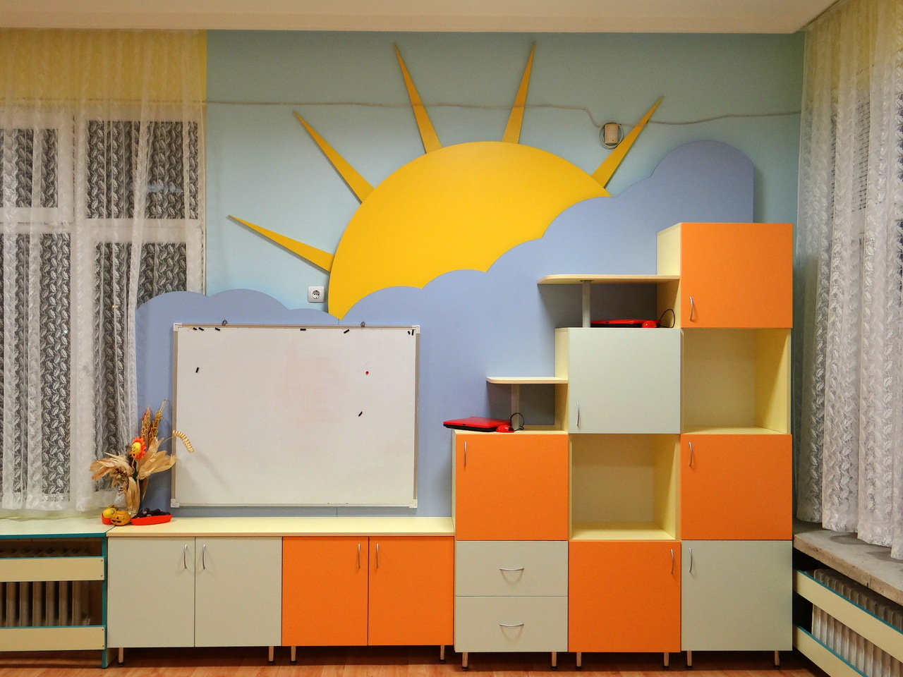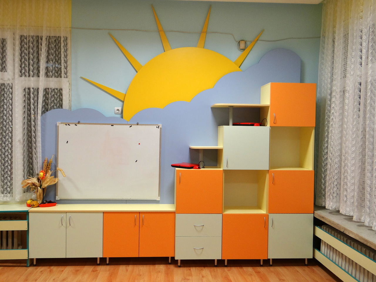 Шкафа е стъпаловидно изграден е редуващи се отворени и затворени части за повече удобство и разчупеност на линиите. Зад шкафа е поставено пано с облак и слънце тъй като групата в детсакта градина се казва Слънце. Моделът е много функционален и същевременно много атрактивен. Изработката е само по поръчка в богата цветова гама и размери на клиента.