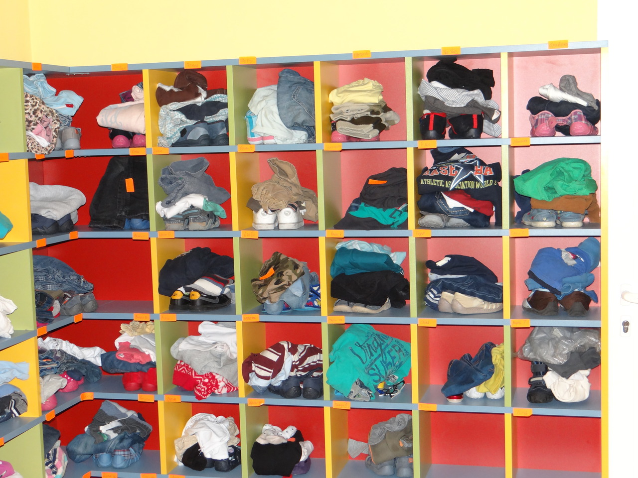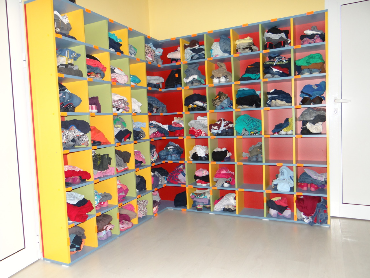 Етажерката е направена така че максимално функционално и практично да съхранява детските дрехи, които децата събличат преди да легнат да спят следобеден сън. Етажерката заема максимално малко място и всяко дете има своя клетка за дрехите си. Това улеснява както педагозите, така и самите деца и пести много място. Изработката е изцяло по поръчка на клиента в богата цветова гама и индивидуални размери.