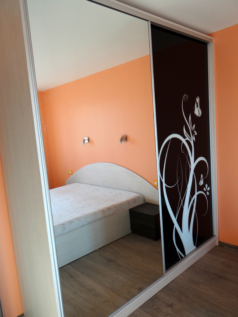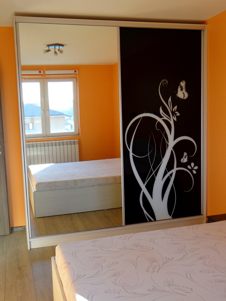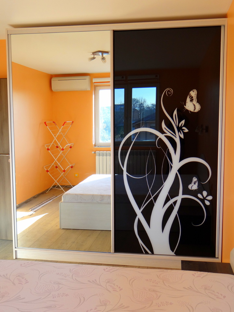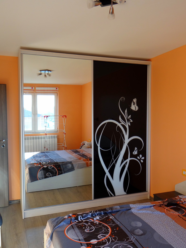 Градероба е изработен от висококачествено ПДЧ е практично вътрешно разпределение изцяло по желание на клиентите. Едната от плъзгащите врати е изцяло огледална, докато другата е решена с принт стъкло с нежни мотиви. Механизмите за плъзгащите врати и кантдръжките са метални с цел постигане на по добро качество и по дълъг живот. Модела може да бъде изработен по ваши размери в богата цветова гама.