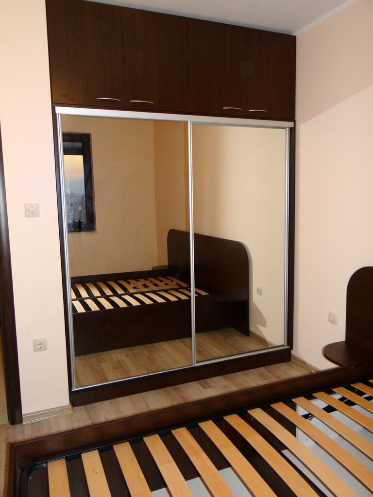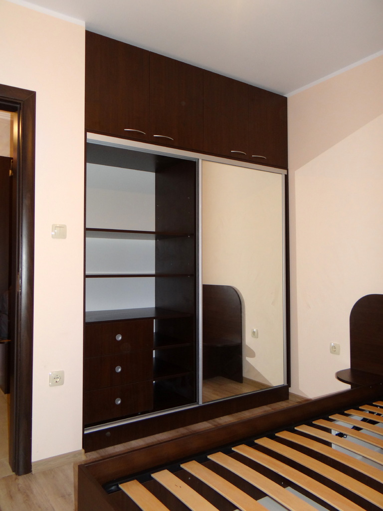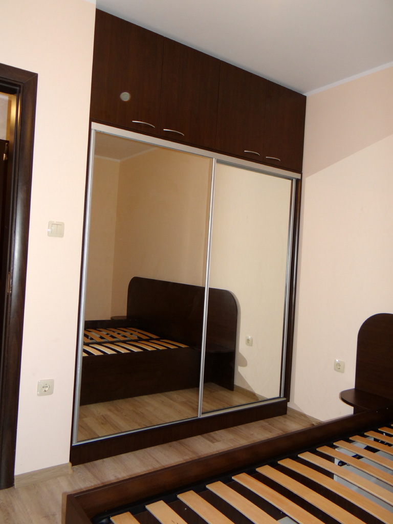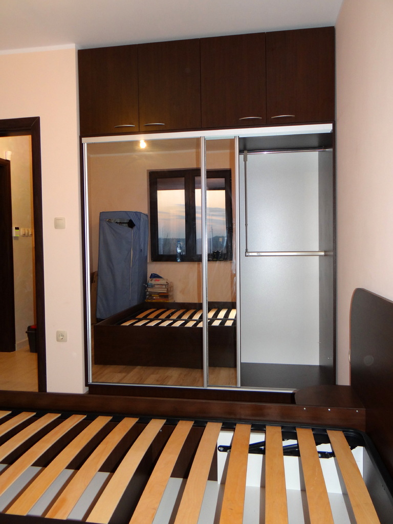 Гардероба е двукрилен с огледални плъзгащи врати, алуминиеви кантдръжки и висококачествени метални механизми. Гардероба има и надствойка с обикновенни варти за допълнително удобство. Вътрешното разпределение е много удобно и функционално и изцяло съобразено с желанието на клиента.