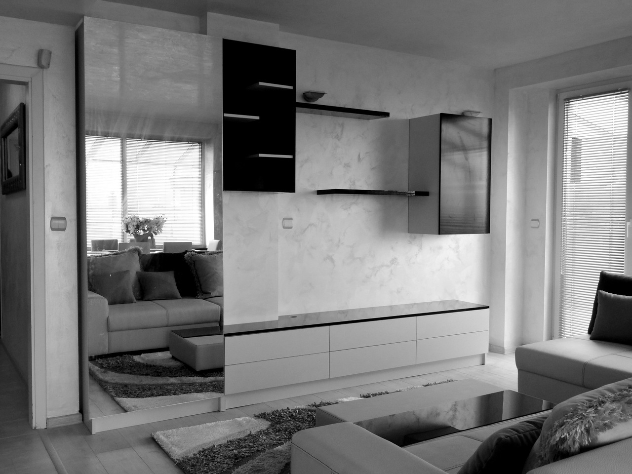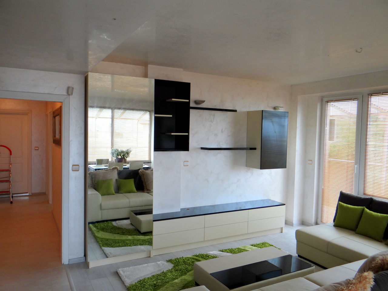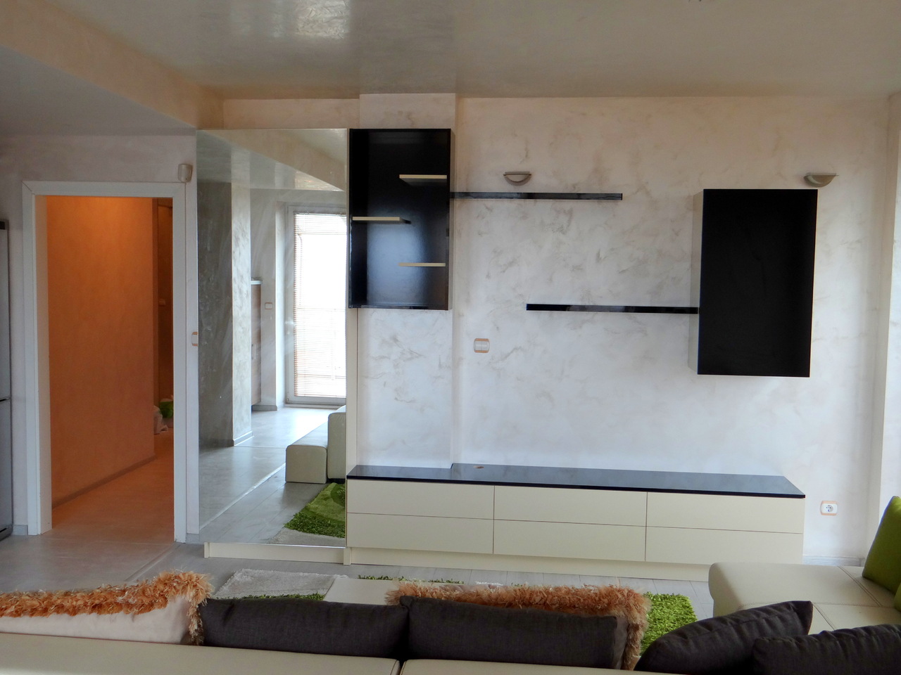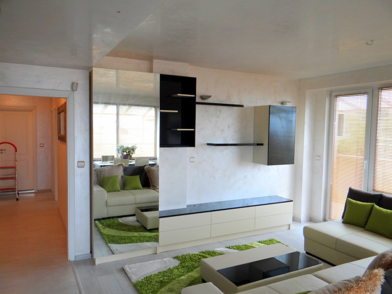 Секцията се състои от нисък тв шкаф с чекмеджета, допълнителни шкафчета с етажерки на стената и колона с огледална врата. Линиите са изчистени и семпли, но в крак с новите тенденции като освен това е много функционална. Моделът може да се изработи в различни размери, според пространството и в богата цветова гама.