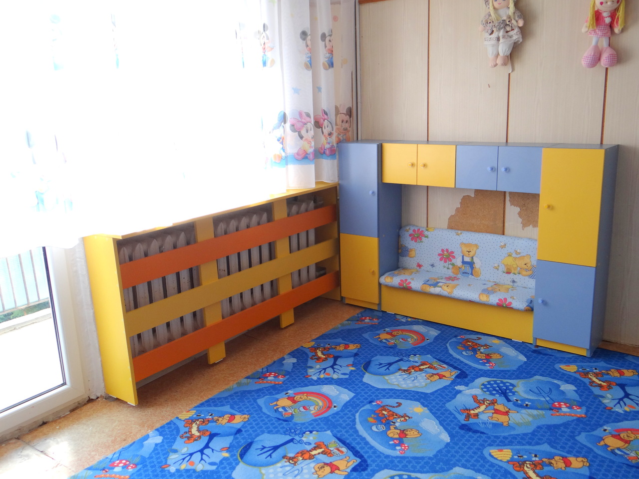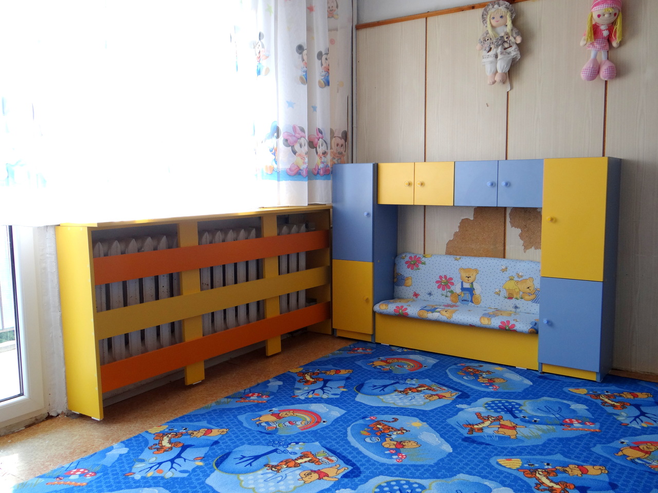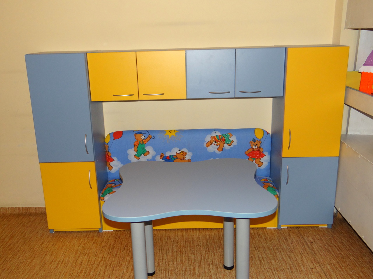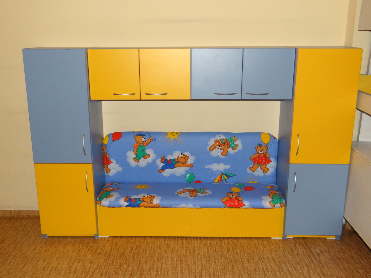 Този вариант на детски кът за игра представлава секцийка с диванче във весели цветове. Изработва се изцяло от ПДЧ по размери на клиента и възможностите на пространството в богата цветова гама. Обикновенно този модел е част от цялостна композиция с детска кухничка например, но се изработва и отделно.