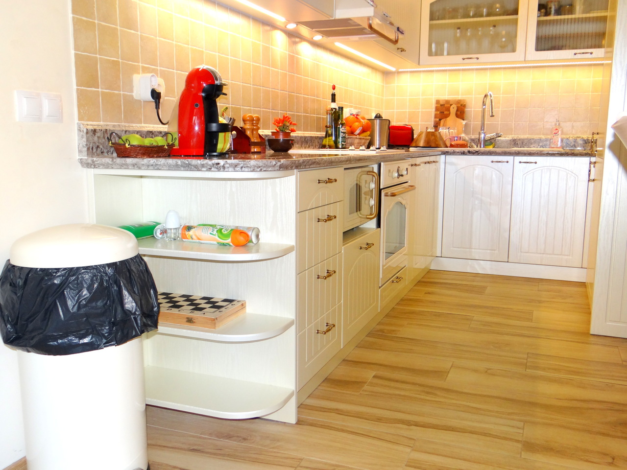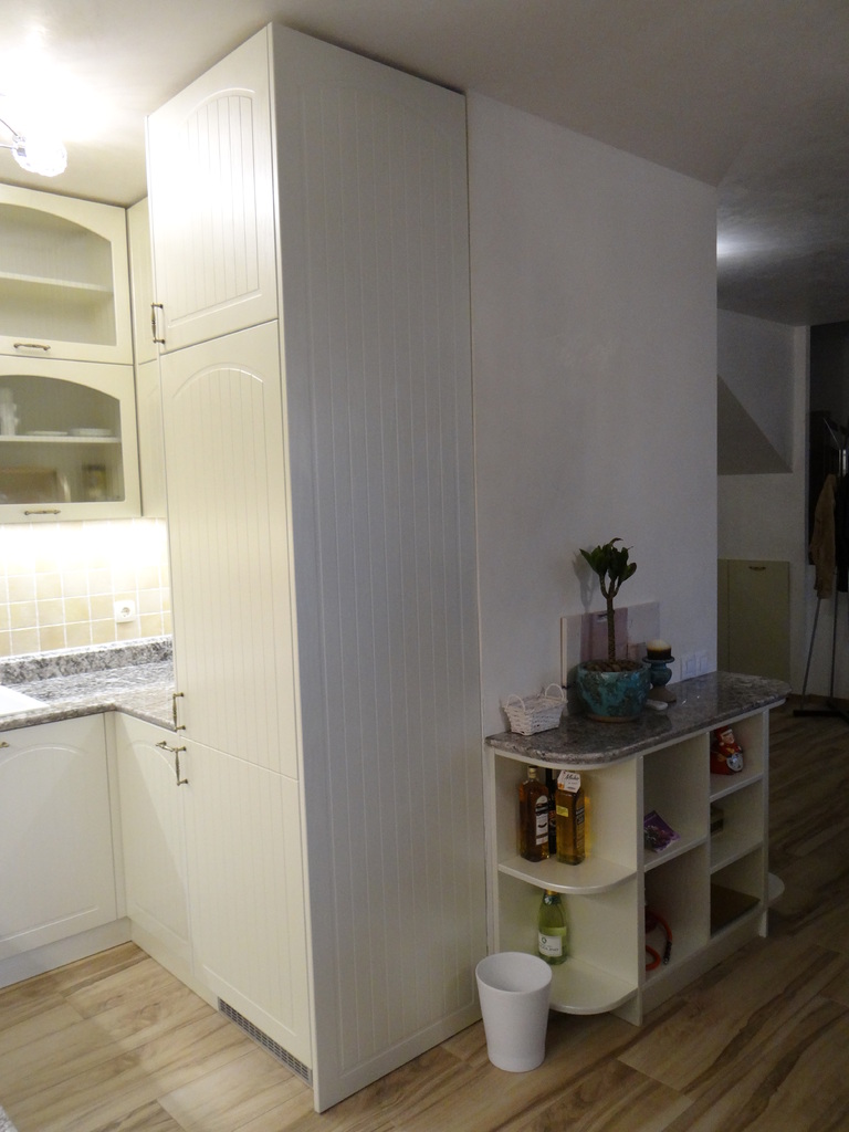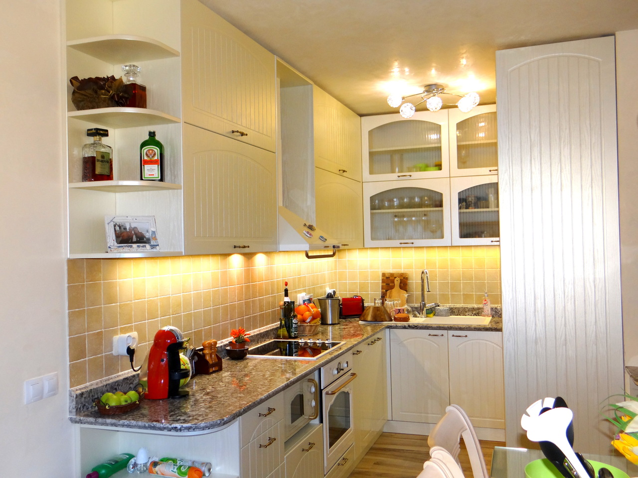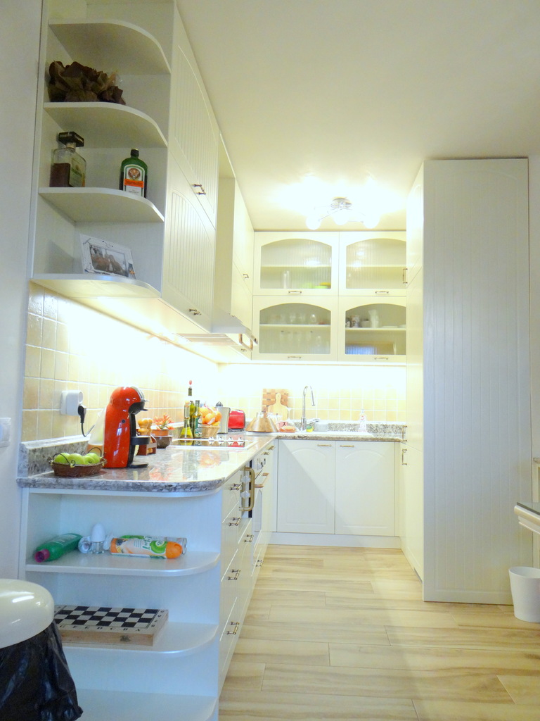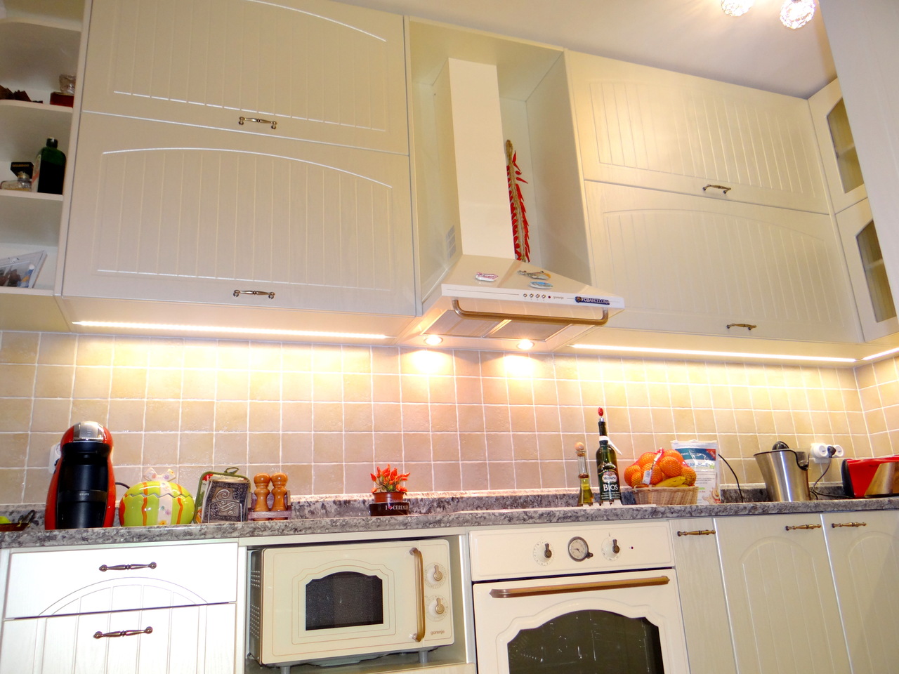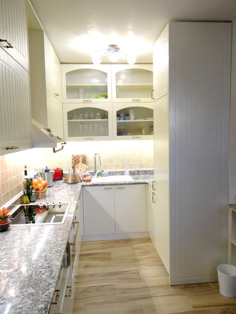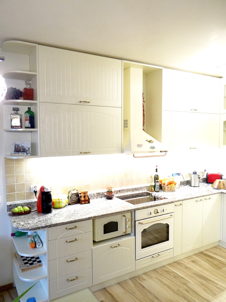 Кухненското обзавеждане е висок клас луксозна изработка като корпусите са от ПДЧ, а всички видими части, облицовки и вратички са изработени от 3D мембранен МДФ, работния плот на кухнята е камък. Електроуредите естествено са ретросерията на Gorenje, което подсилва класическия дизайн на кухнята. Покритието на МДФ вратичките имитира фладер, който е в нежен сатенен отблясък на цват слонова кост. Витрините, класическите дръжки, отворените етажерки и всички декоративни елементи придават уют и раздвижват линията. Моделът може да се израбти по размери на клиента в различна цветова гама.
