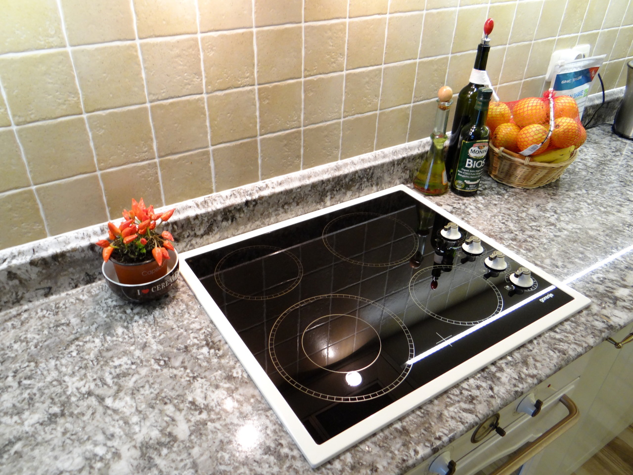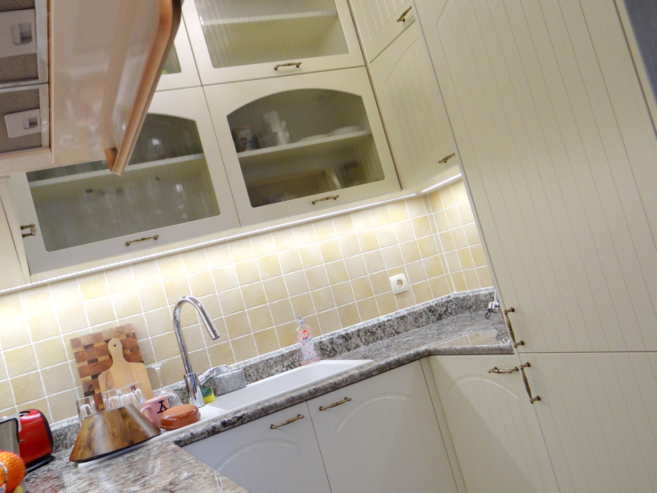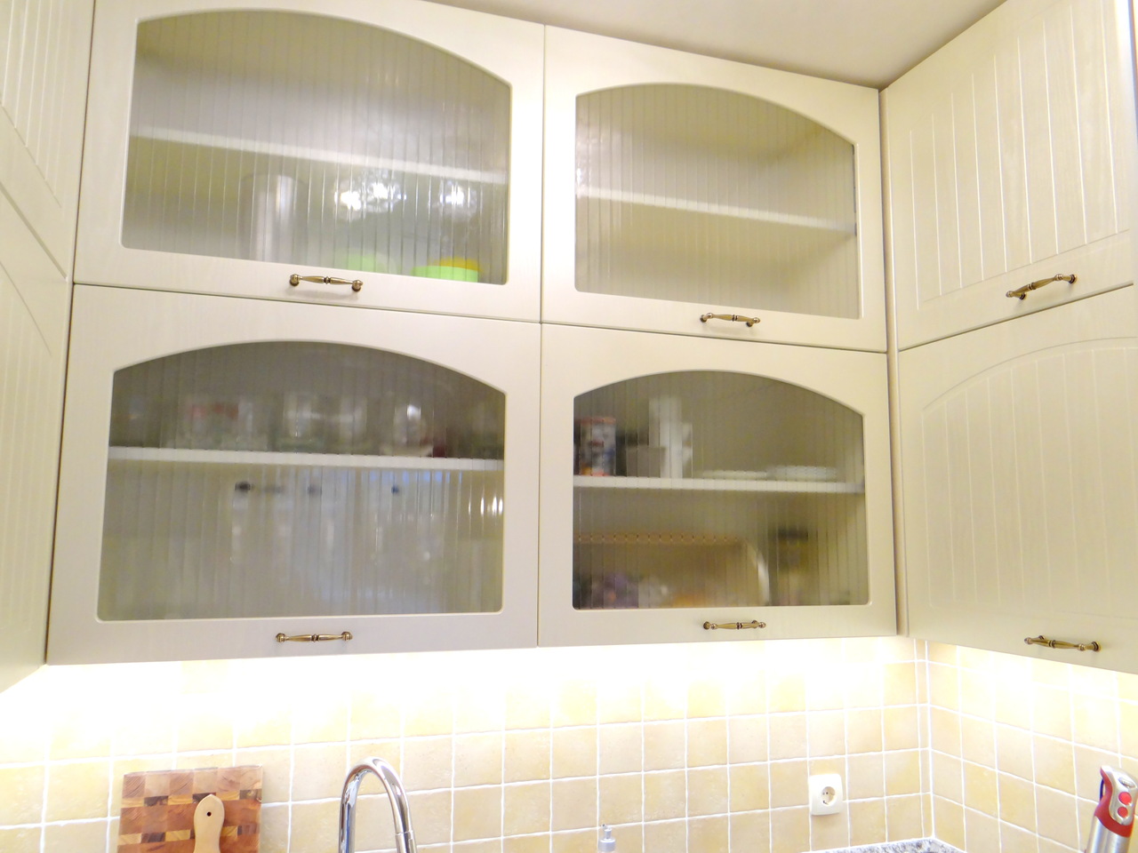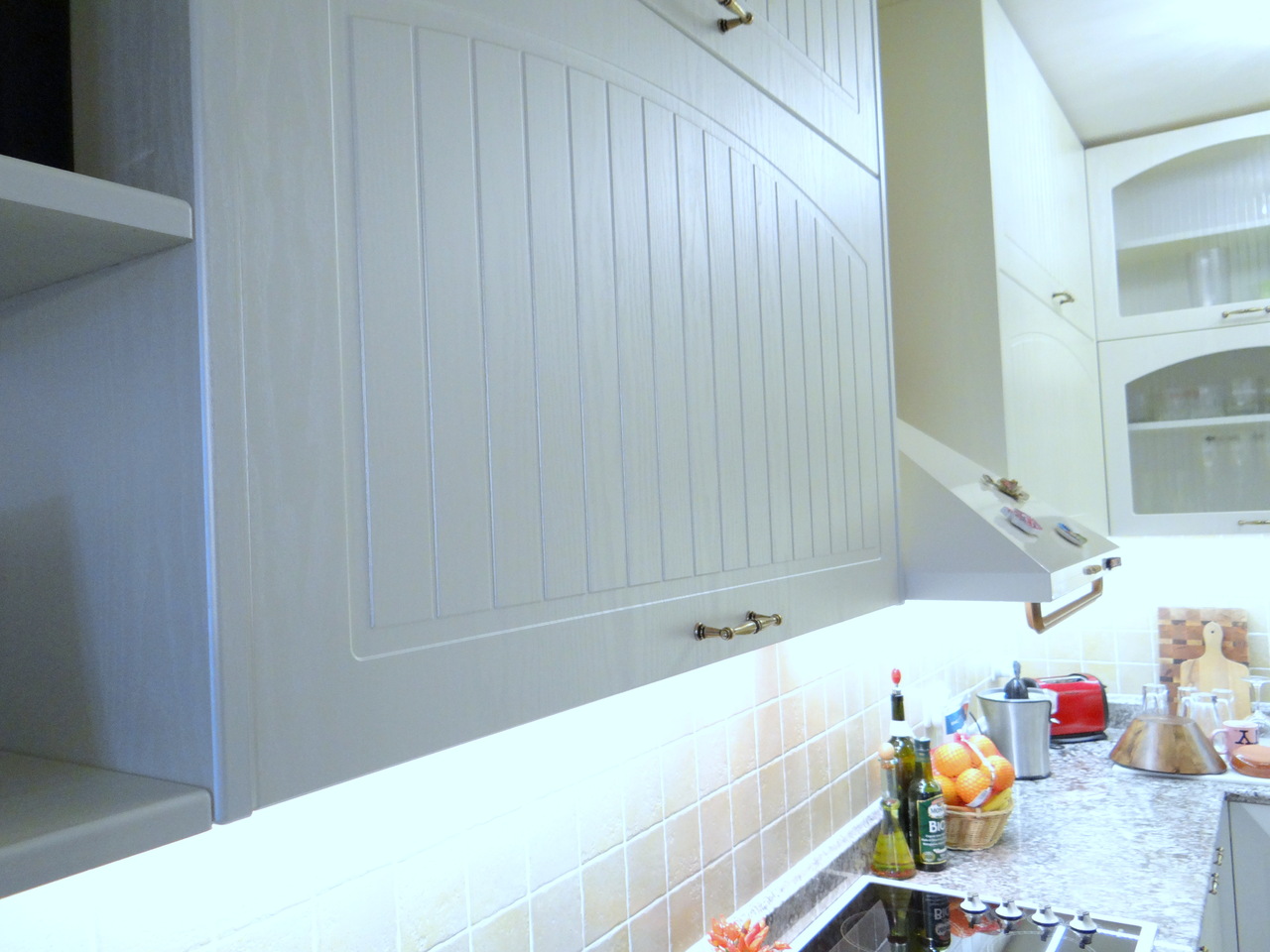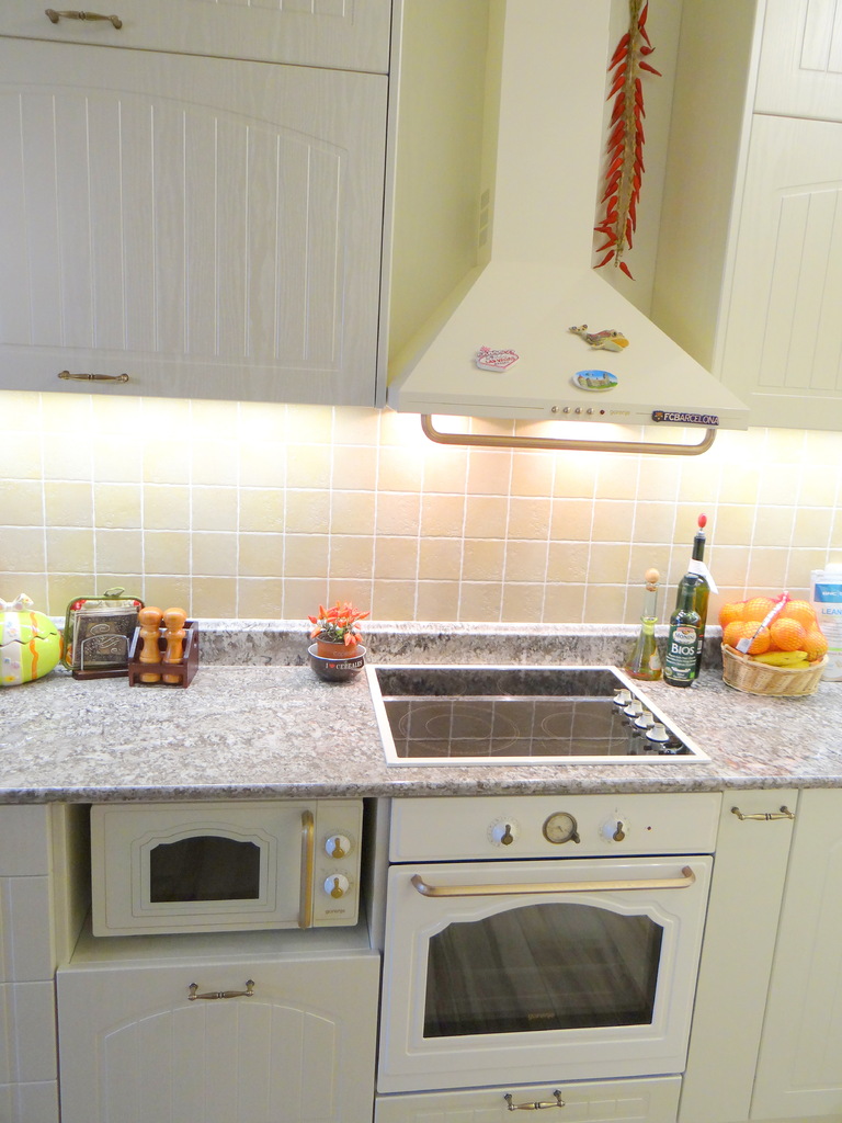 Кухненското обзавеждане е висок клас луксозна изработка като корпусите са от ПДЧ, а всички видими части, облицовки и вратички са изработени от 3D мембранен МДФ, работния плот на кухнята е камък. Електроуредите естествено са ретросерията на Gorenje, което подсилва класическия дизайн на кухнята. Покритието на МДФ вратичките имитира фладер, който е в нежен сатенен отблясък на цват слонова кост. Витрините, класическите дръжки, отворените етажерки и всички декоративни елементи придават уют и раздвижват линията. Моделът може да се израбти по размери на клиента в различна цветова гама.