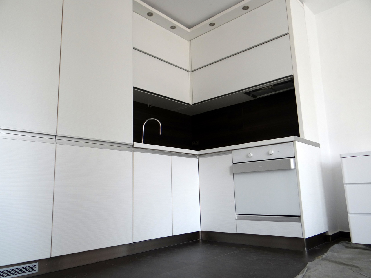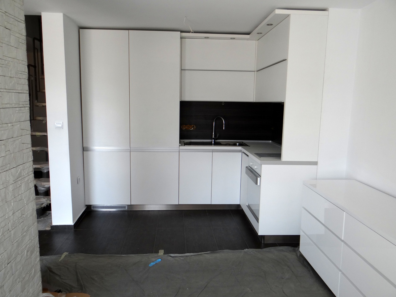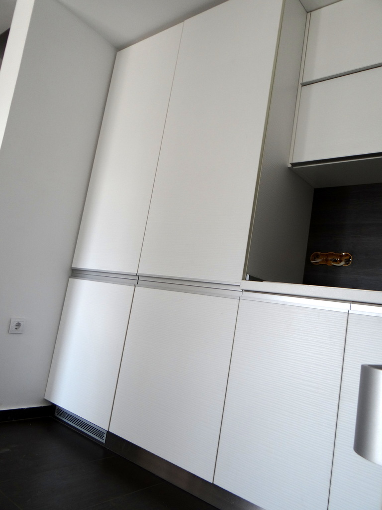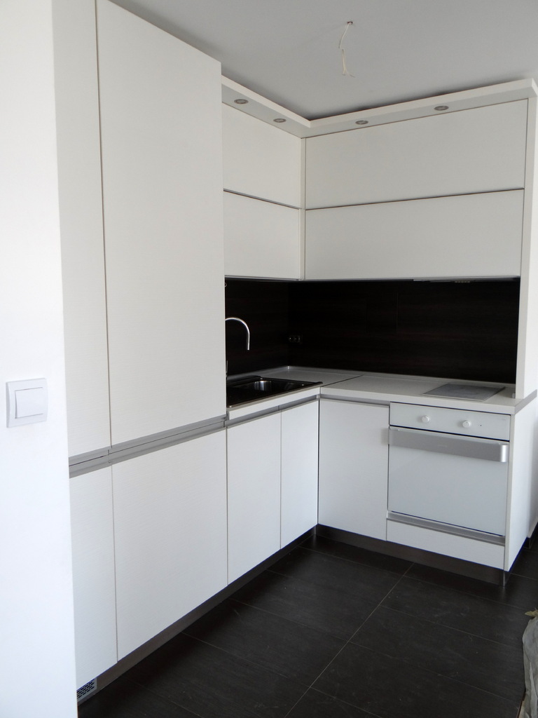 Кухненско обзавеждане с функционално разпределение и изчистени линии. Шкафовете са изцяло в бяло, като акцент е използван дървесен декор във вертикалния плот. Хоризонталния плот също е бял. Дръжките на вратичките са алуминиеви кантдръжки, допълнени с алуминиевия цокъл. Хладилника, фурната, съдомиалната и пералната са вградени. Фурната и котлоните също са бели. Модерна и елегантна визия и функционалност на атрактивна цена. Моделът се изработва в богата цветова гама и по размери на клиента.