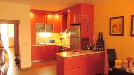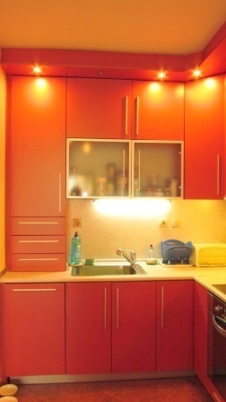 Керемидения оттенък на кухнята се подсилва от добре насочените луни и осветителни тела. Осветлението омекотява визията и и придава елегантност и чар. Кухненските шкафове са малко по високи от стандарта и много функционални. Декоративния абсорбатор, хладилника и фурната за вграждане са в инокс, кореспондиращ с дръжките на кухненските шкафове и балансиращ мекотата на декора. Островната част увеличава площа на работния плот и обема на шкафовете, а освен това разделя пространството между двете зони, тази на всекидневната и тази на кухнята. Моделът се изработва изцяло по поръчка от висококачествени материали по индивидуални размери и в богата цветова гама.