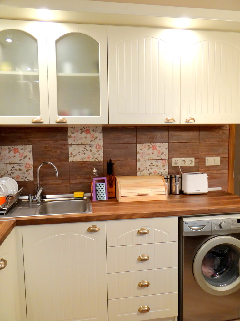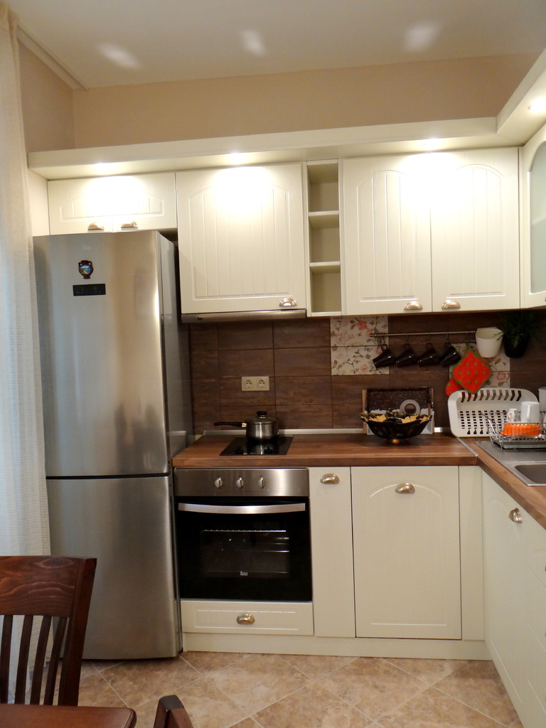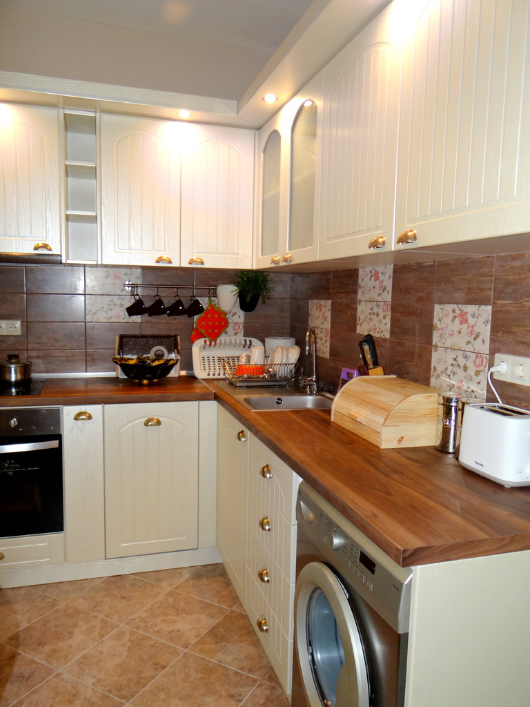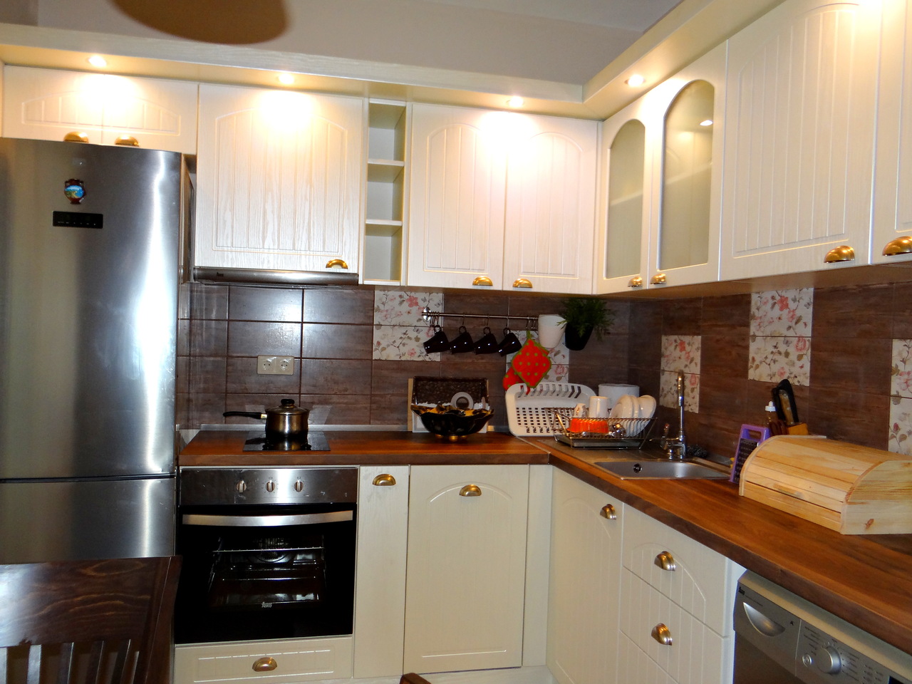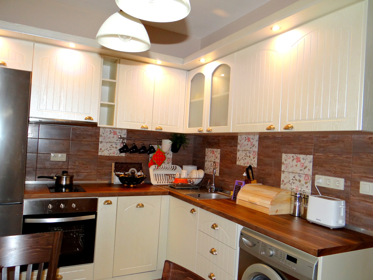 Красива, стилна и функционална кухня, в класически стил и модерно изпълнение. Удобство и уют за всяка домакиня. Кухнята е решена в седефени цветове с имитиращ фурнир ламиниран МДФ, по най-съвремемнна технология. Плота е Термопал, имитиращ отново натурално дърво. Нежните витринки и раздвижени етажерки придават кокетност на класическата кухня. Вертикалния плот - гръб е решен в плочки. Моделът може да се изработи изцяло по размери на клиента, в богата цветова гама - всички наши модели се изработват само по поръчка.