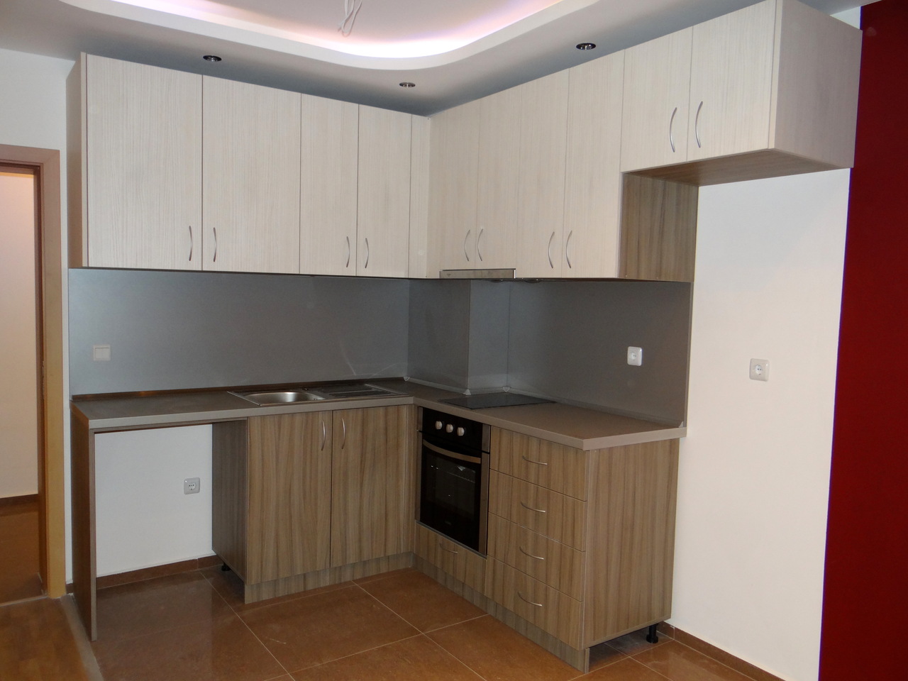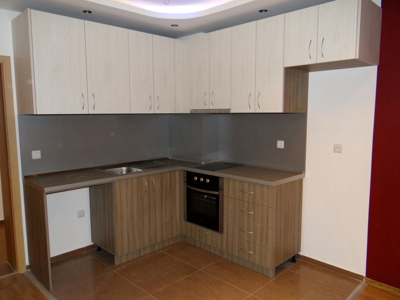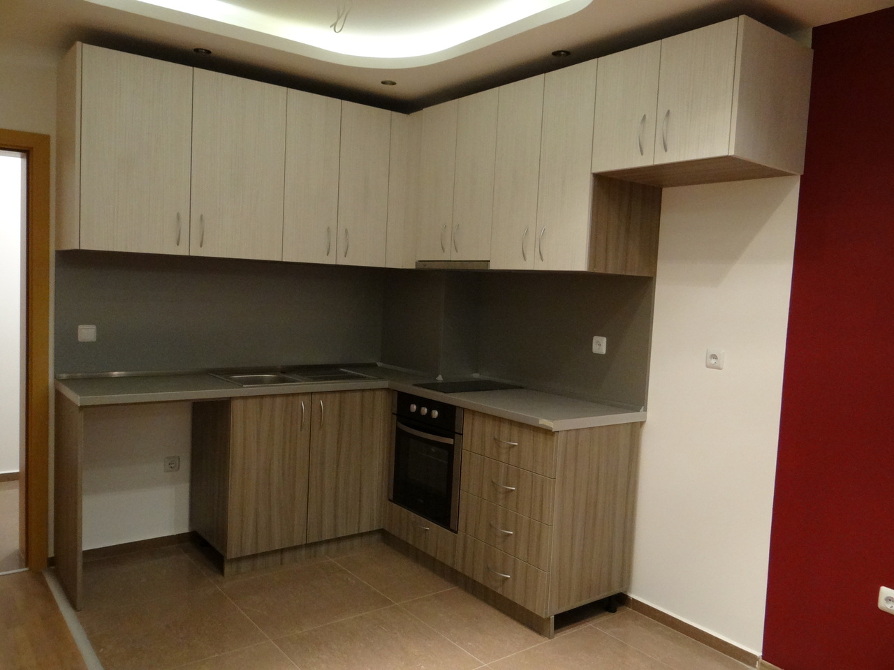 Кухненския сет е семпъл и изчистен с максимална функционалност, предвид малките размери. Горния ред е решен в светъл тон, а долния в по-тъмен дървесен декор. Вертикалния и хоризонтален плот са титан. Фурната и готварския плот са вградени. Оставените свободни места са за пералня и хладилник, които са свободно стоящи. Кухнята се изработва в богата цветова гама и размери на клиента.