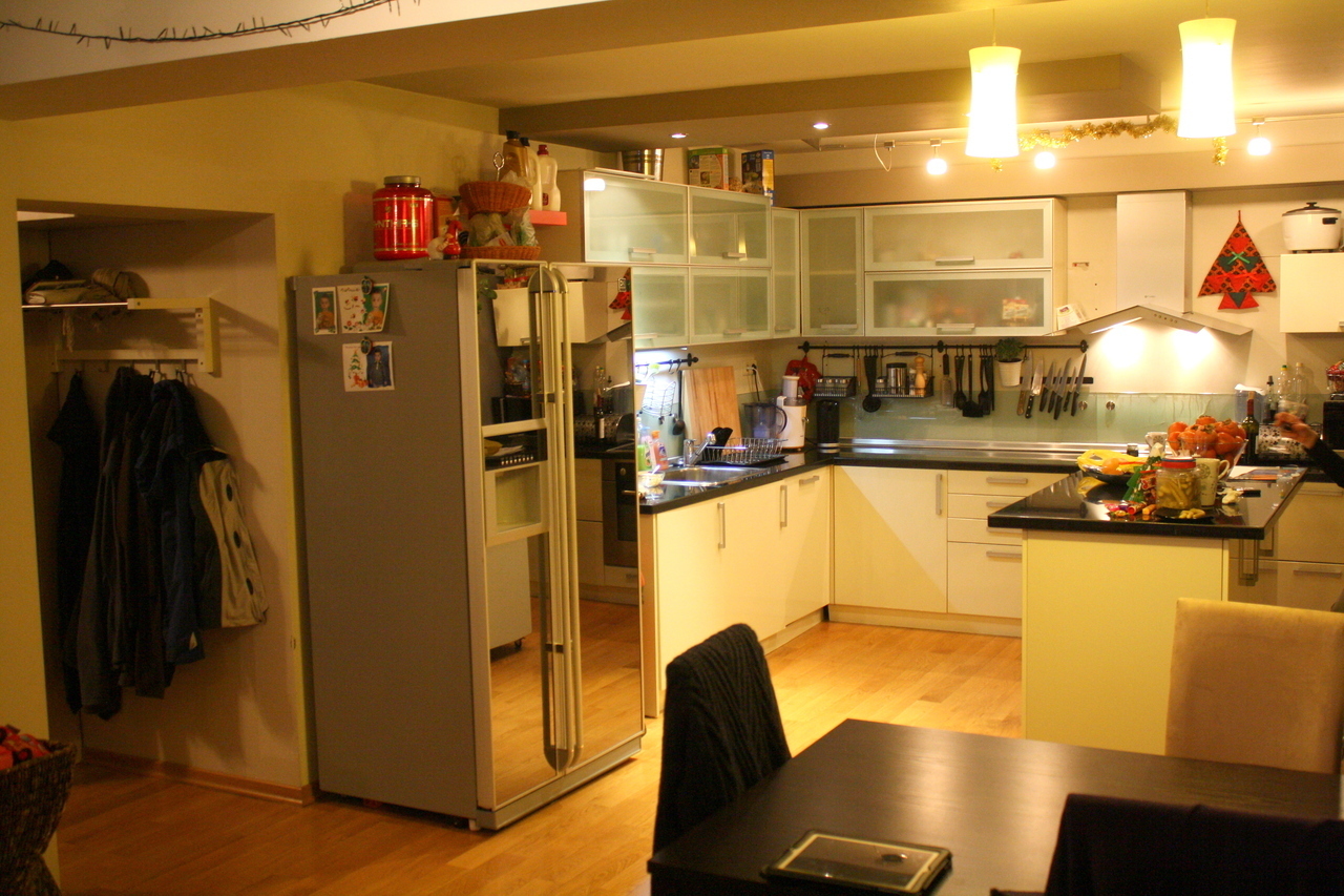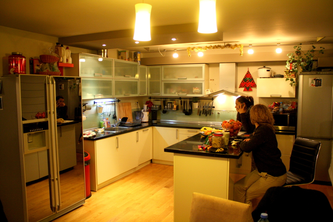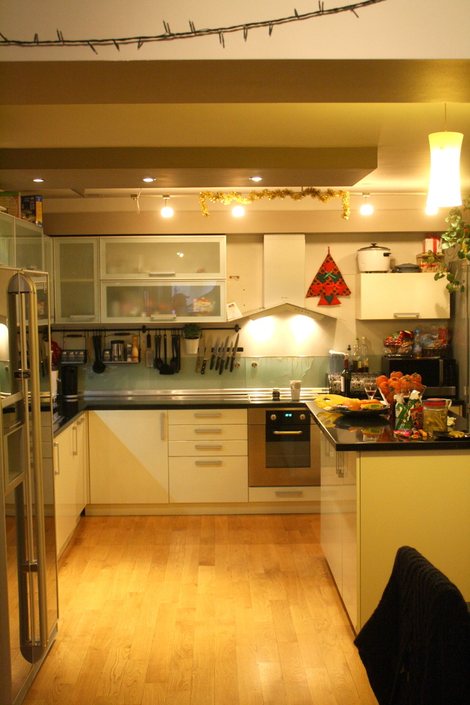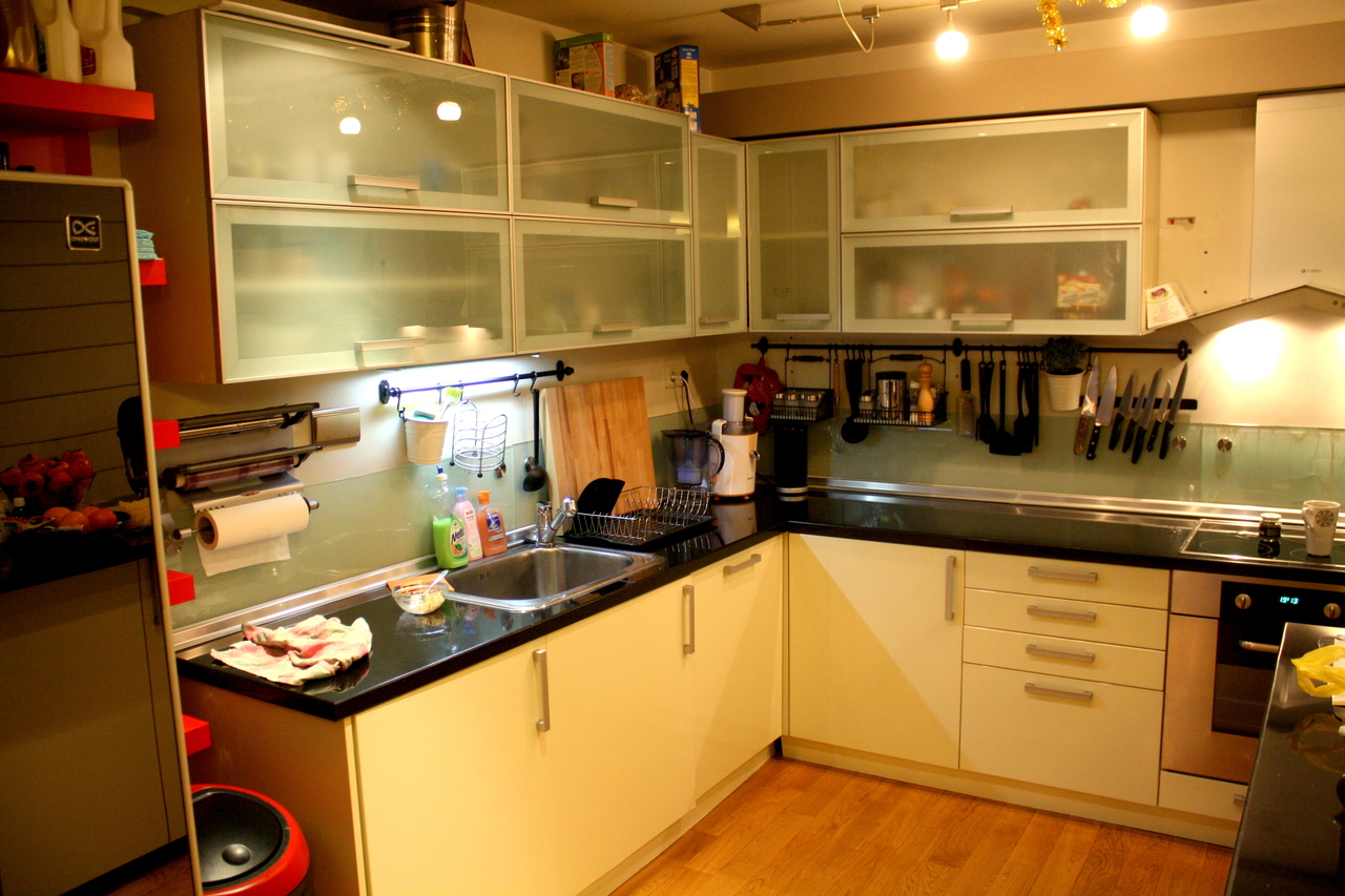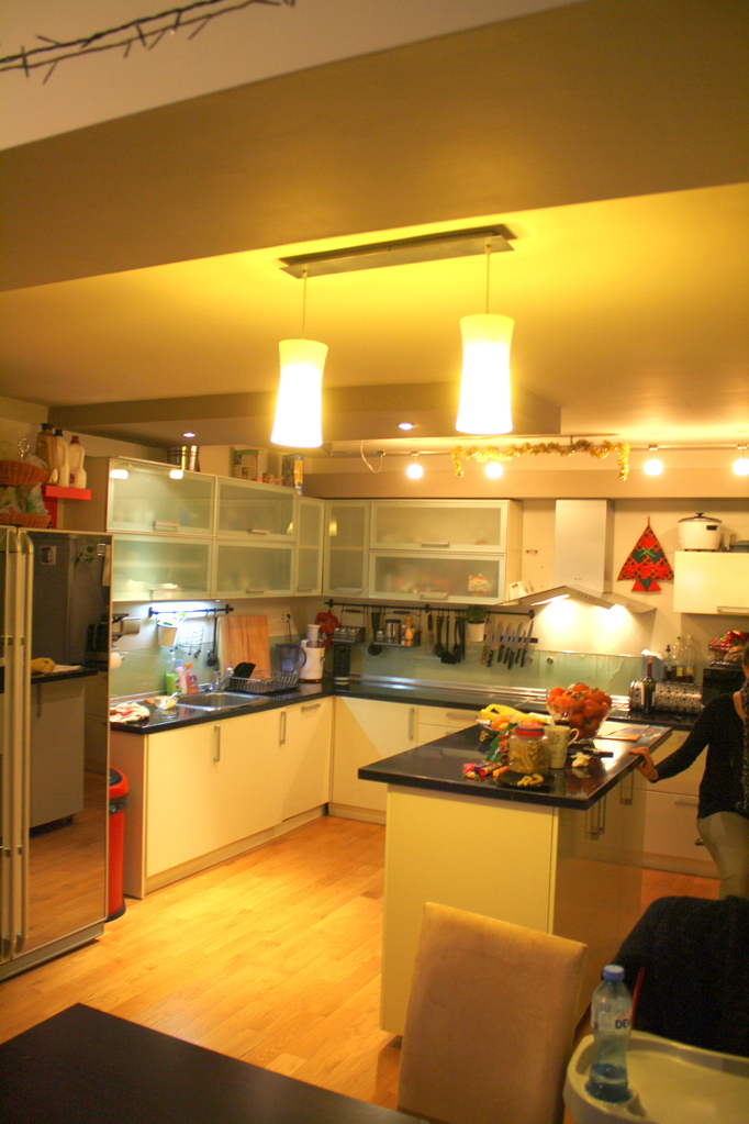 Кухнята е Г-образна с разположен срещу една от стените островна част. Мекия бял гланц на вратите на шкафовете, графитения каменен плот, стъклените витрини и вертикален плот се допълват идеално, като превръщат контраста в темата, която дава характерен облик на кухнята. Долния ред на кухненските шкафове е изцяло от вратички МДФ в бял гланц, докато горния ред е реaлизиран в стъклени витрини с алуминиев обков. Имемно затова вертикалния плот е стъклен. Прехода от прекрасния каменен плот към горния ред е деликатен и не натрапчив. Декоратиwния аспиратор също е мотив разчупваш строгите линии на тази модерна кухня. Островната част служи както за шкаф, така и за импровизирана маса за хапване. Островът дава завършеност на интериора. Кухнята е изработена от висококачествени материали, като при дизайна изключително много е наблегнато на светлината и осветителните тела. Реализирането на тази кухня може да бъде изцяло по ваши размери, в богата цветова гама. Възможно е да се замени обикмовеното матирано стъкло при витрините и вертикалния плот с цветно стълко в различни нюанси. Дайте воля на вашето въображение и оставете на нас реализацията.