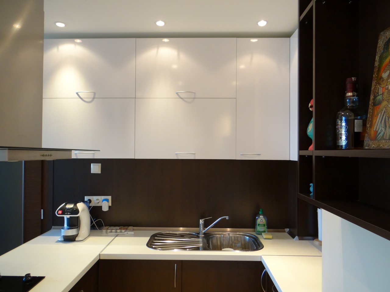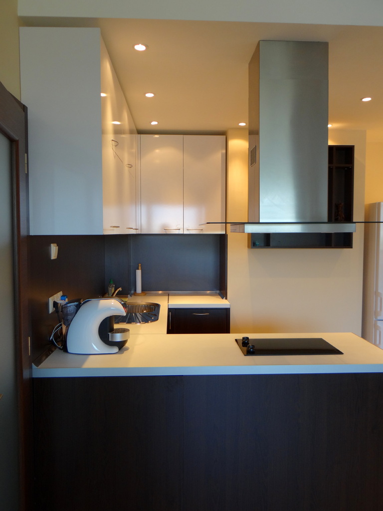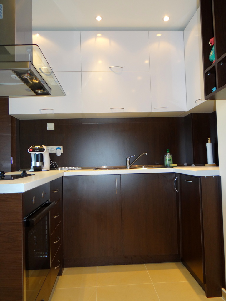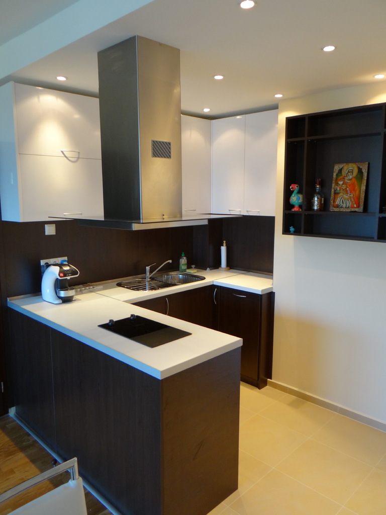 Кухнята е решена в два цвята, с елегантен дизайн и функционалност. Долния ред и вертикалния плот е венге, а горния ред е бял гланц. Белия работен плот кореспондира с шкафовете от горния ред на кухнята и контрастира с вертикалния плот и долните кухненски вратички. Акцент в кухненското обзавеждане е и островния абсорбатор. Електроуредите са вградени с висок енергиен клас. Кухнята включва и елегантна стенна етажерка. Моделът се изработва по поръчка в цветова гама и размери по избор.