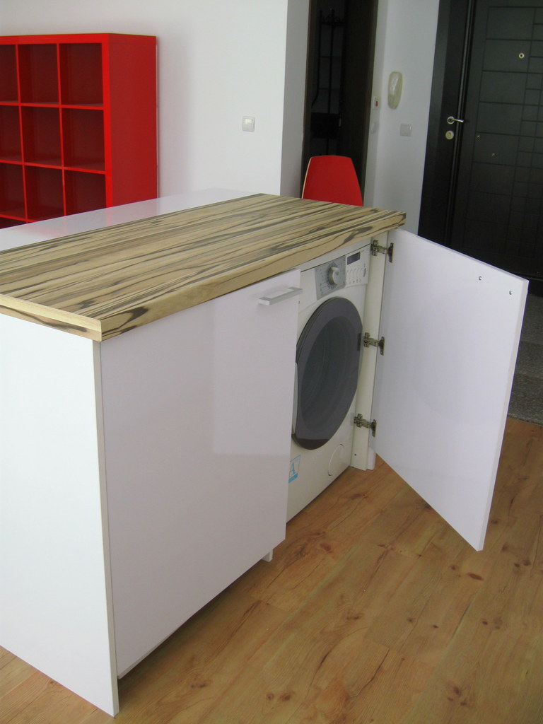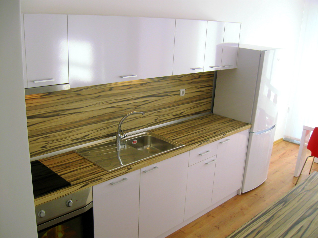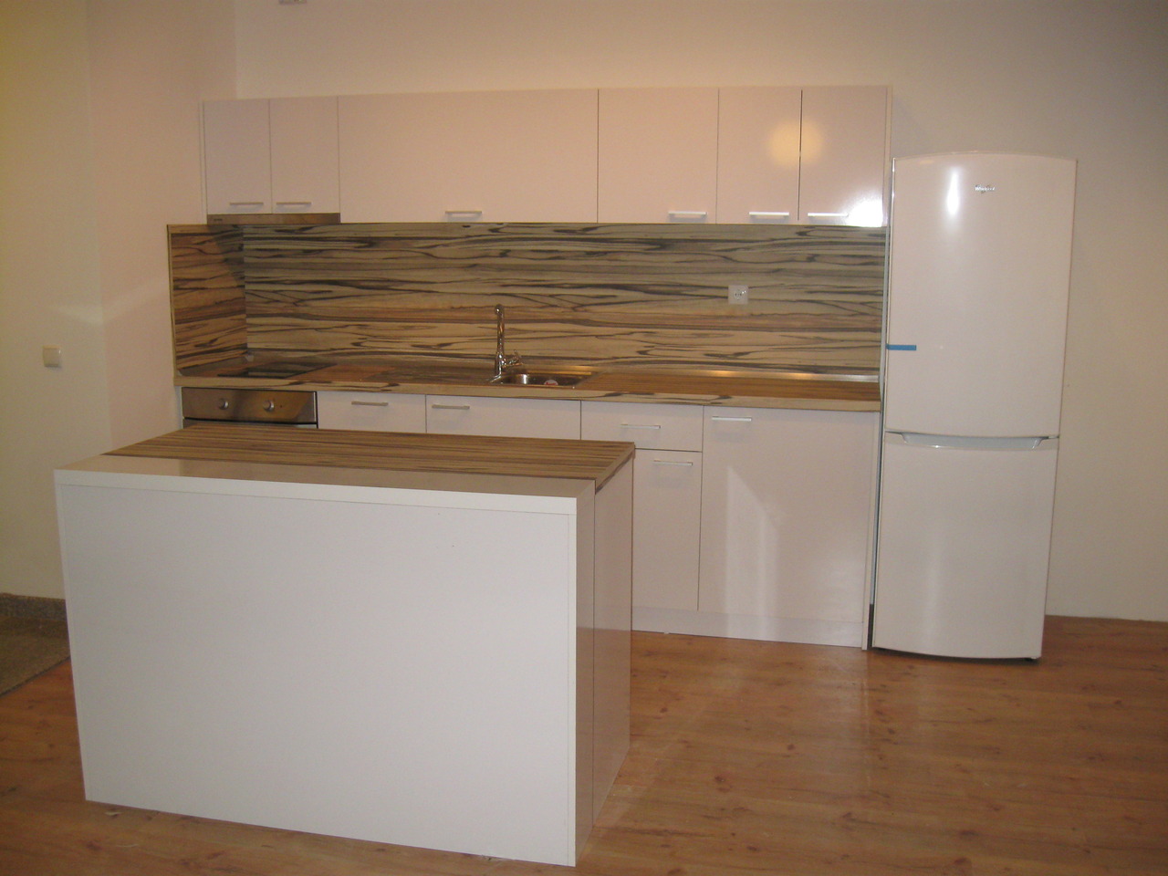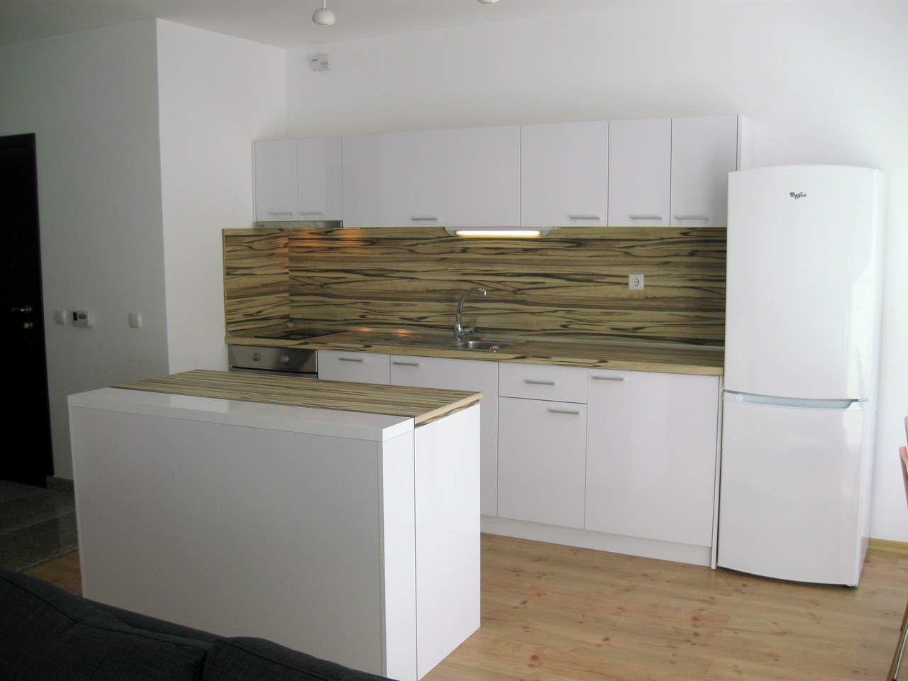 Кухнята е атрактивна и модерна с много практично разпределение. Вертикалния плот е в декора на кухненския плот и плота на сотровната част. Хоризонталния плот в Термопал - термо и водоустойчив. Абсорбатора е телескопичен и оставя повече използваемо място в горните шакафове. Острова е с два шкафа, в които са поместени пералнята и сушилнята. Тази островна част отделя кухненската част от всекидневната като разширява и работния плот. Кухнята може да се изработи в богата цветова гама и размери на клиента.
