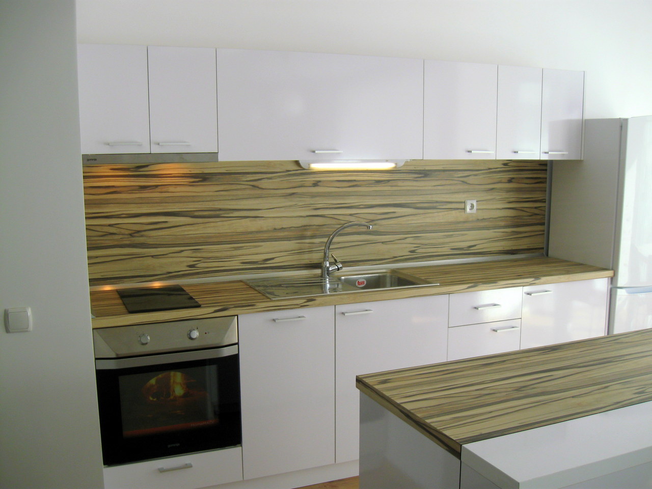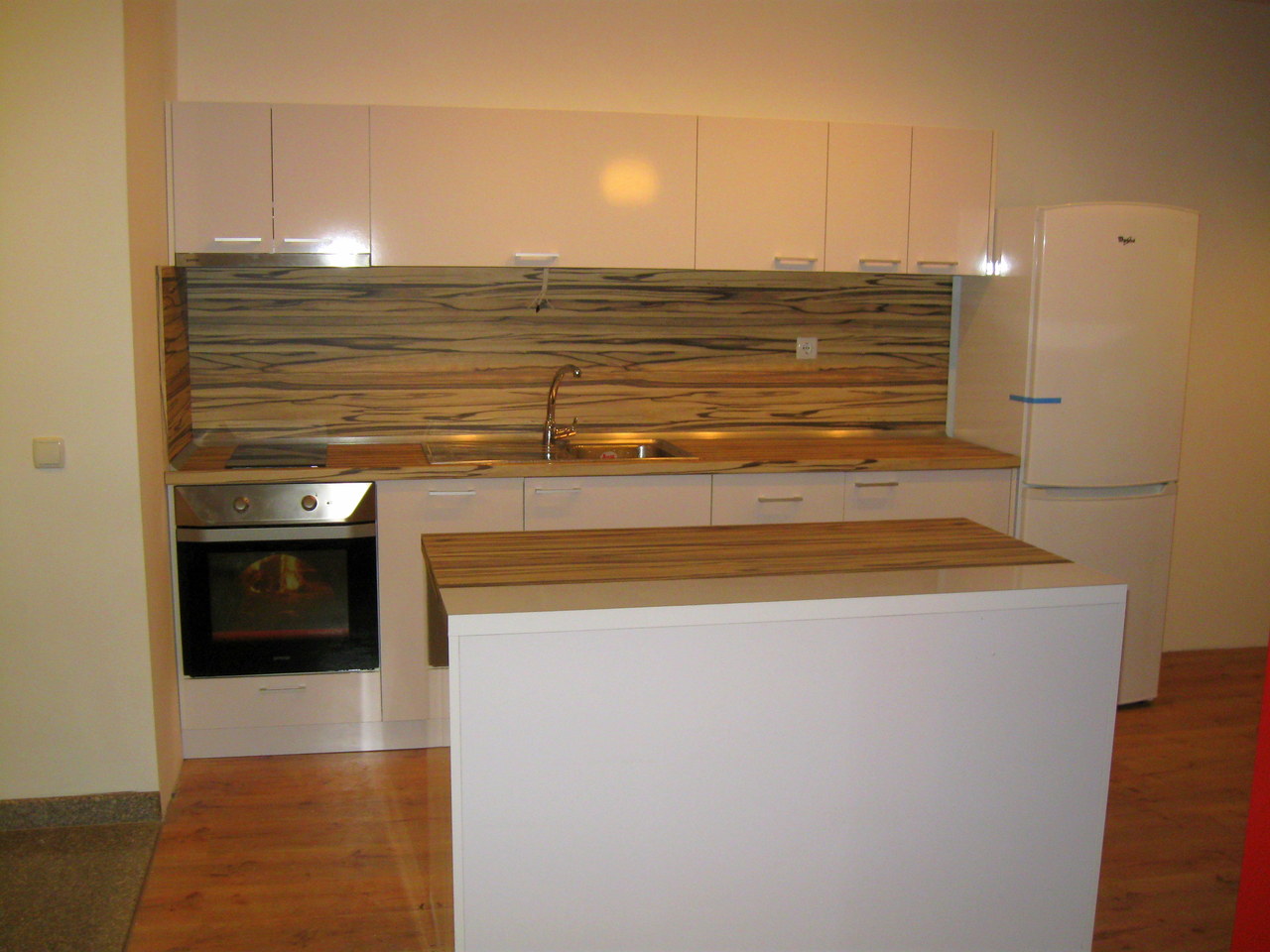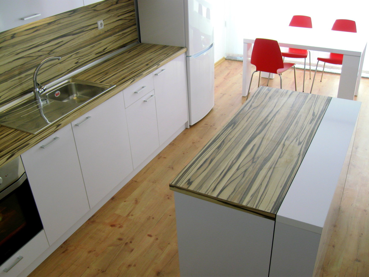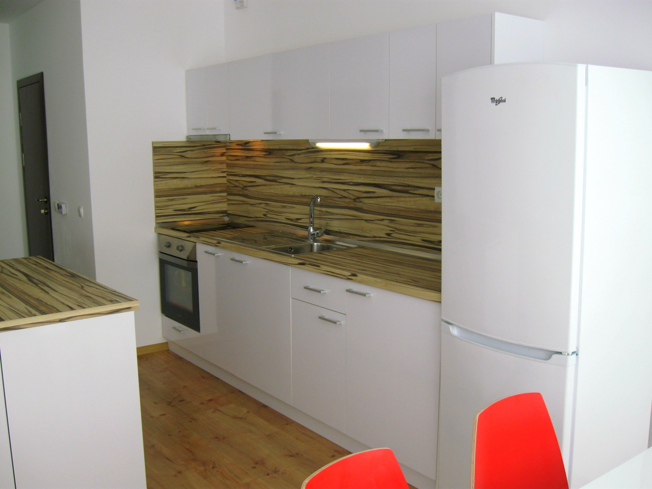 Кухнята е атрактивна и модерна с много практично разпределение. Вертикалния плот е в декора на кухненския плот и плота на сотровната част. Хоризонталния плот в Термопал - термо и водоустойчив. Абсорбатора е телескопичен и оставя повече използваемо място в горните шакафове. Острова е с два шкафа, в които са поместени пералнята и сушилнята. Тази островна част отделя кухненската част от всекидневната като разширява и работния плот. Кухнята може да се изработи в богата цветова гама и размери на клиента.