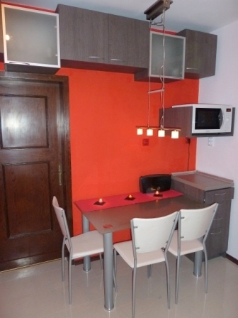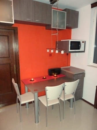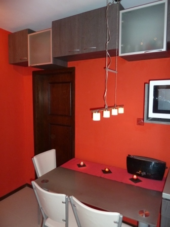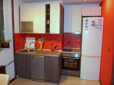 Тези кухненски шкафове са разположени в кухненския бокс и в помещението ползвано за трапезария. Нестандартните архитектурни решения при новото строителство предполагат и нестандартни решения при интериора. Нишата и кухненския бокс са максимално усвоени чрез горен и долен ред кухненски шкафове с вградени фурна и съдомиална и свободностоящ хладилник. В трапезарната част има същи шкаф с чекмеджета, стойка за микровълнова фурна и горен ред шкафчета в раздвижена конфигурация. В цената влизат същи механизъм за бутилки и сушило за чинии. Този модел може да бъде изработен в богата цветова гама и индивидуални размери.