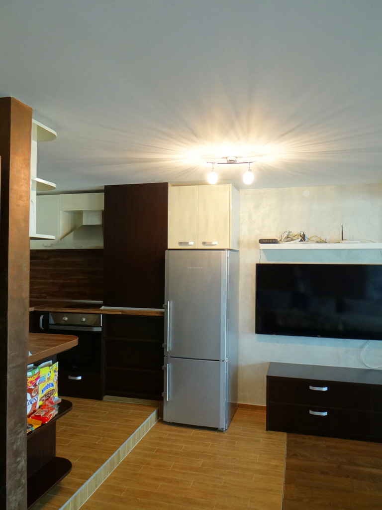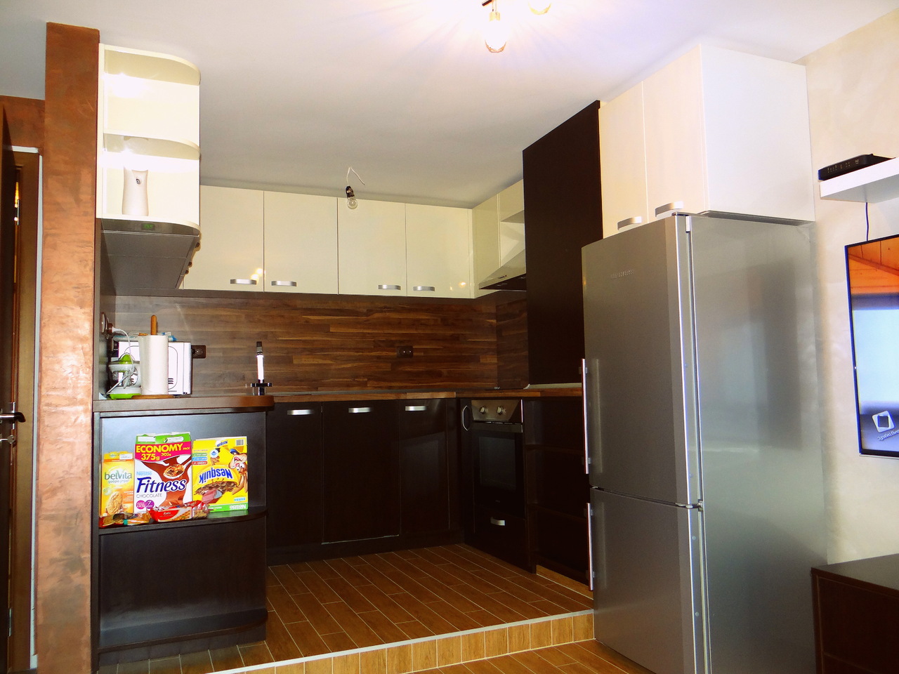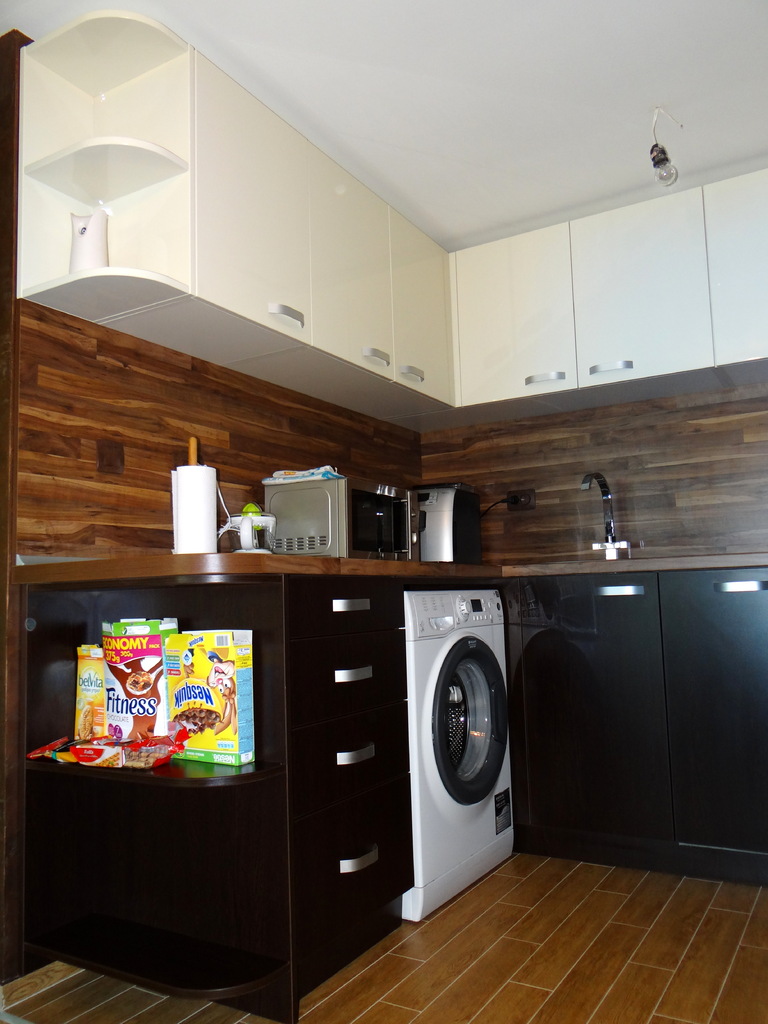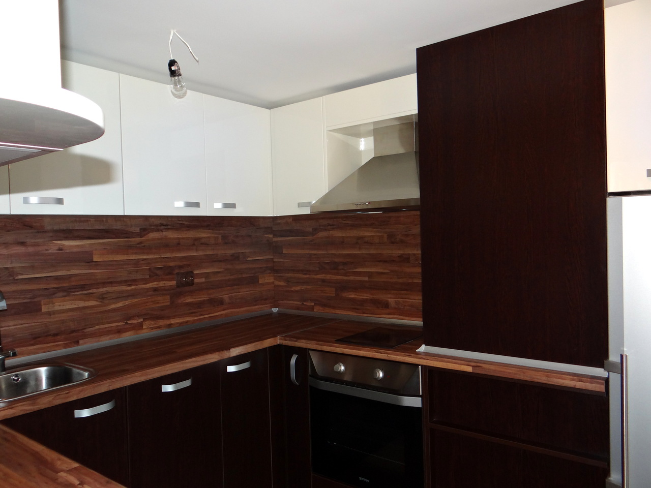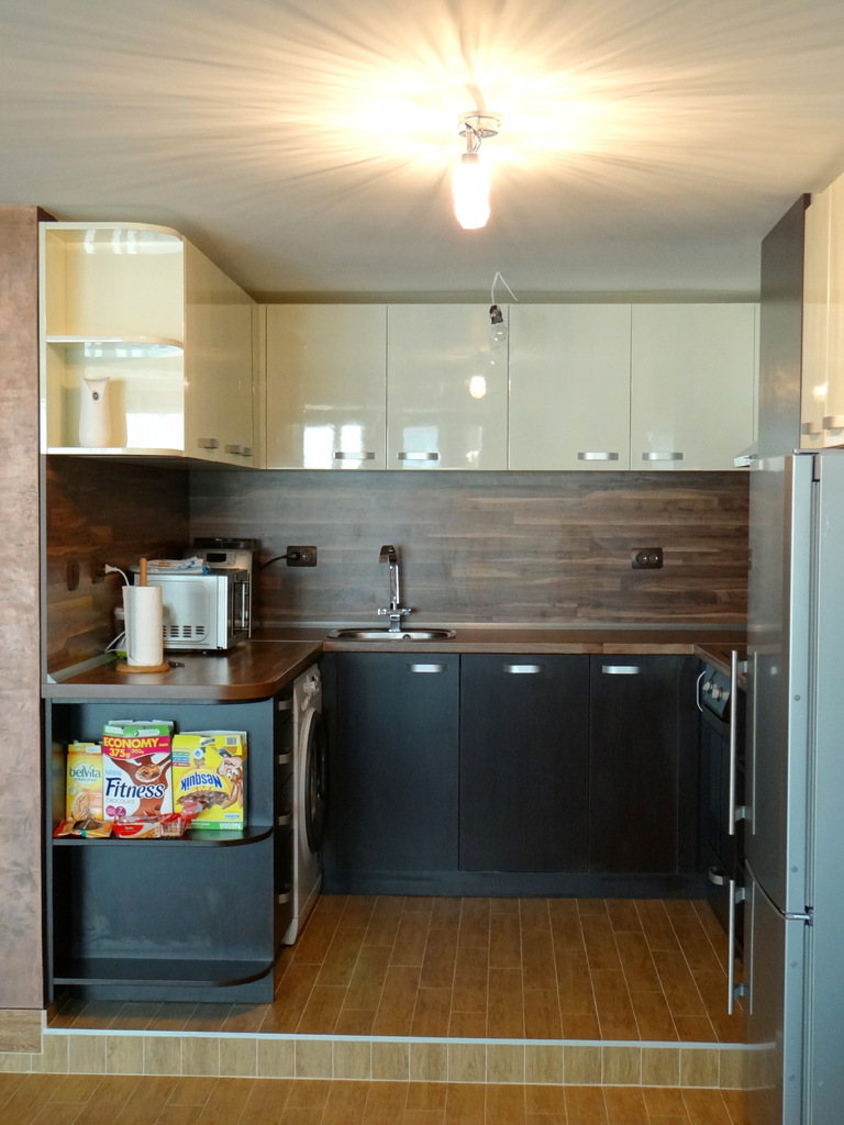 Елегантна кухня решена като съчетание на два вида материал - корусите и вратите на долния са изработени от ПДЧ, а вртатите на горния ред са изработени от боядисан МДФ. Плотовете са с характерен дървесен декор, контрастиращ на лъскавата визия на шкафовете като внасят баланс в цялостната линия. Кухнята е функционална, но същевременно с модерен, луксозен дизайн. Моделът може да бъде изработен в различни цветови съчетания, както и по размери на клиента.