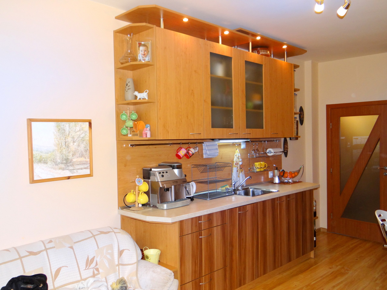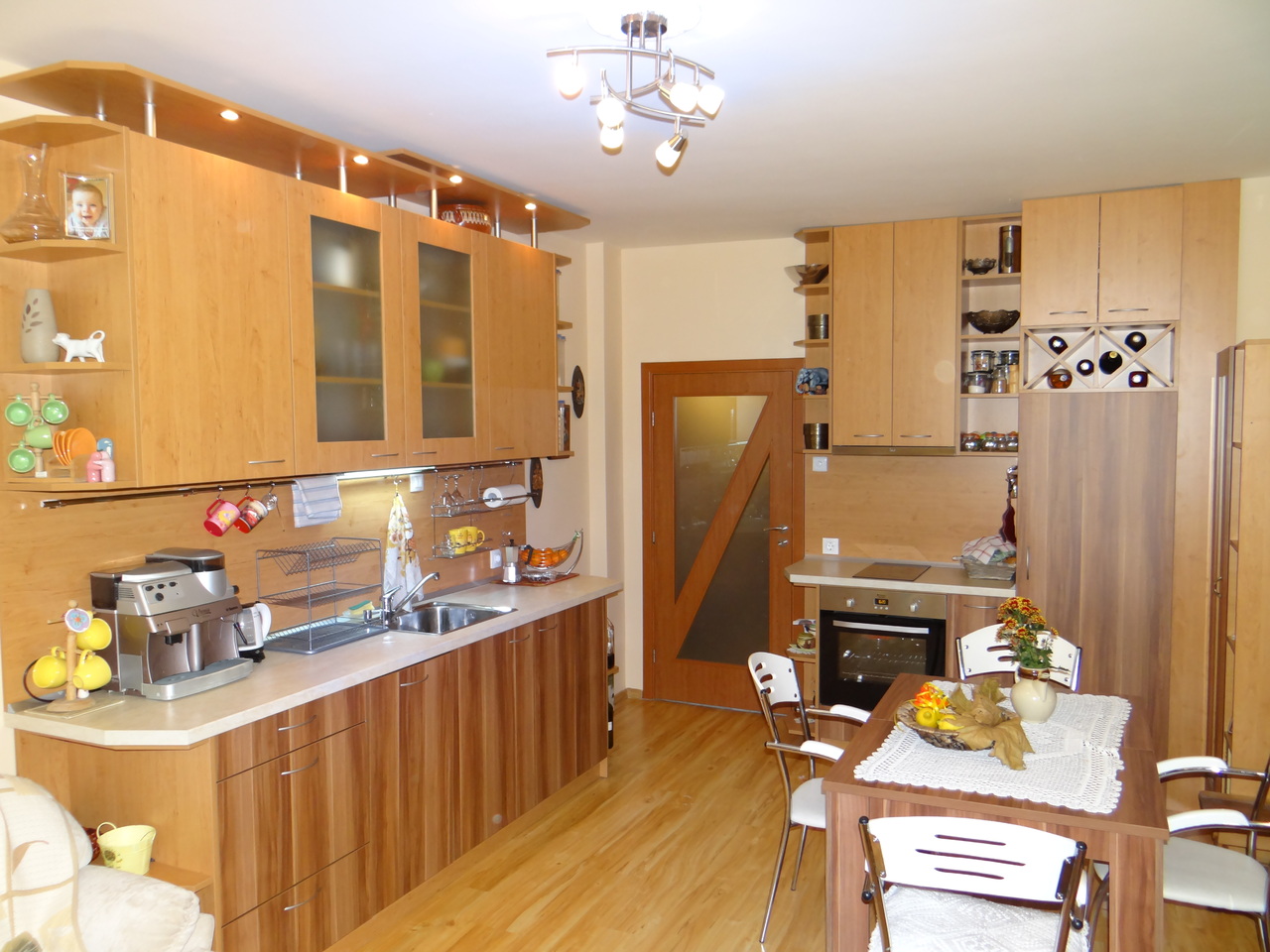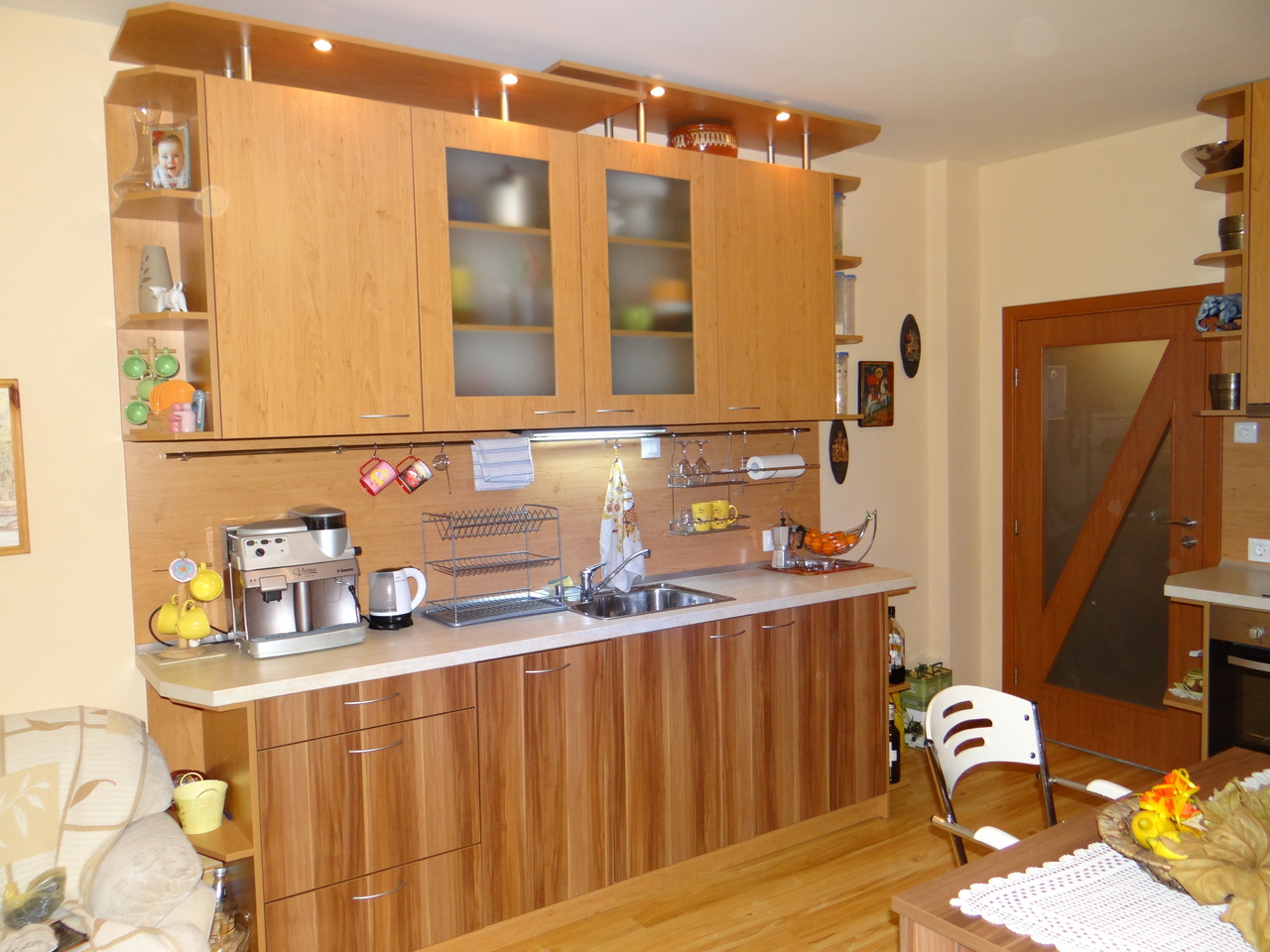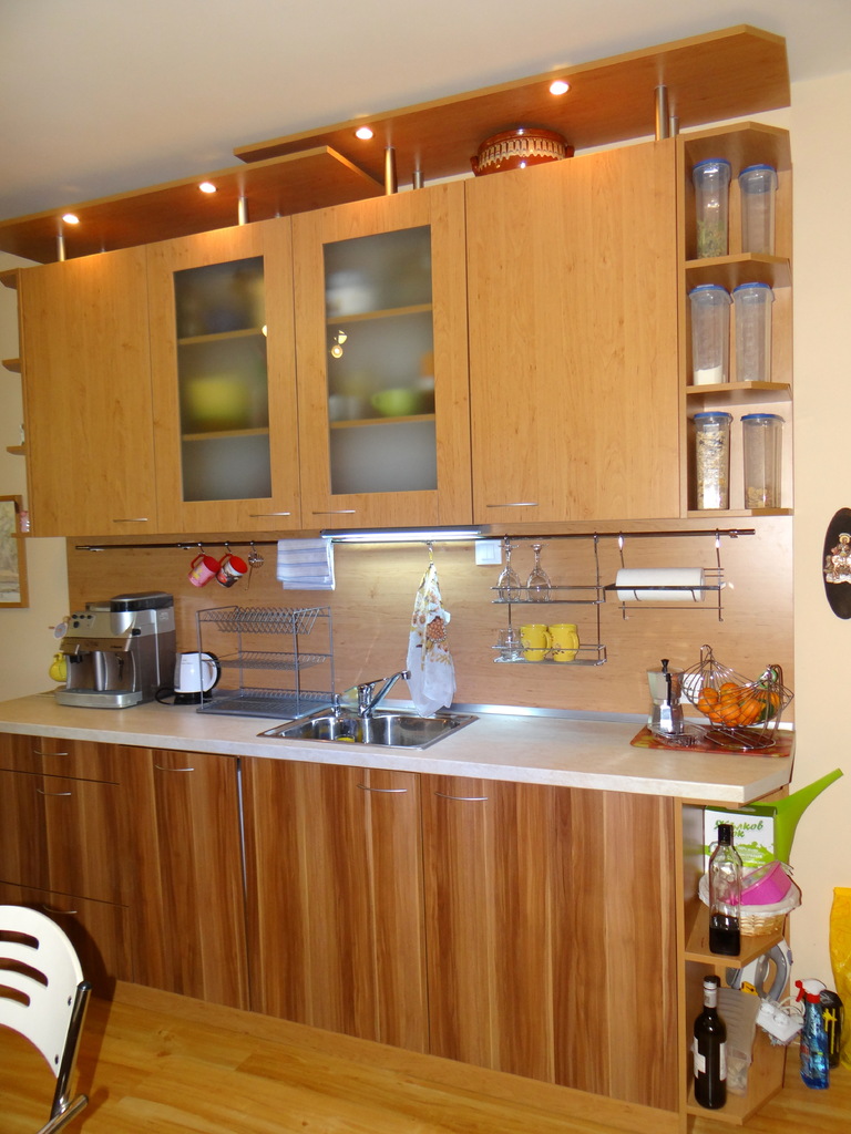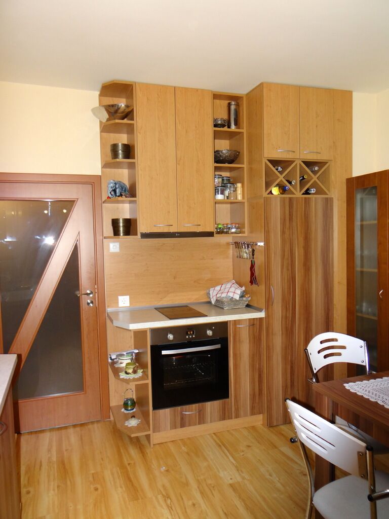 Кухненските шкафове са стандартни изпълнени в съчетание на два дървесни декора и елементи на завършващите етажерки и пана с лунички и етажерка за вино са акцентите, които придават характер на кухнята. Шкафовете на горния ред са високи до тавана на едната стена и високи над стандарта на другата стена с декоративни пана с лунички. Това прави кухнята много функционална и същевременно елегантна. Модела се изработва по индивидуални размери, в богата цветова гама.