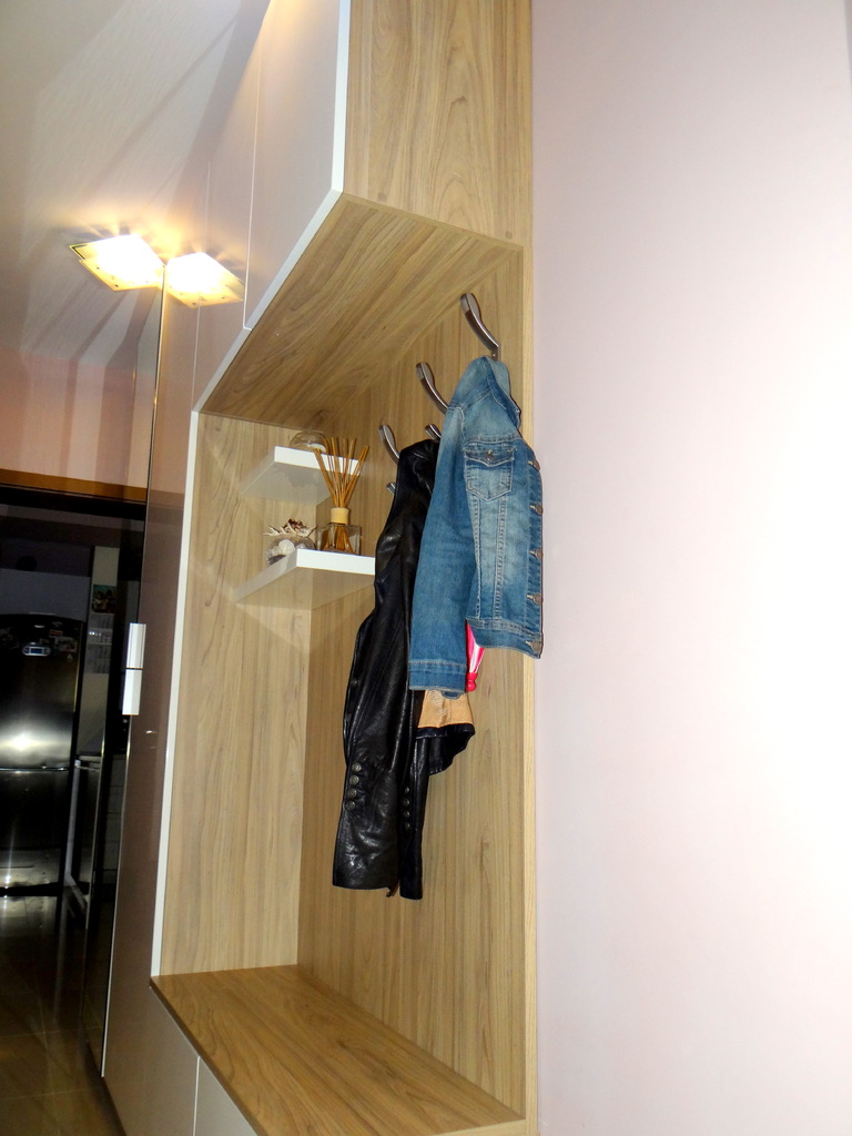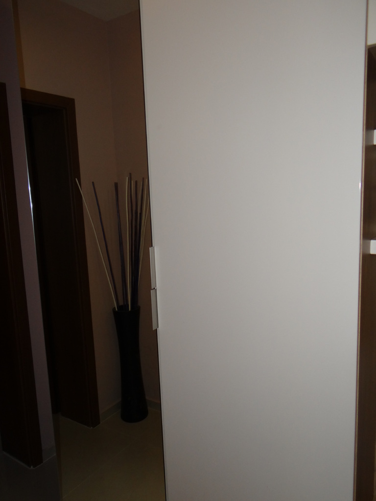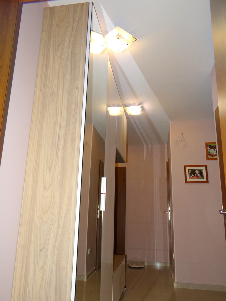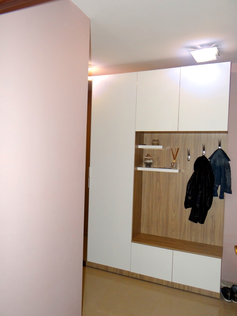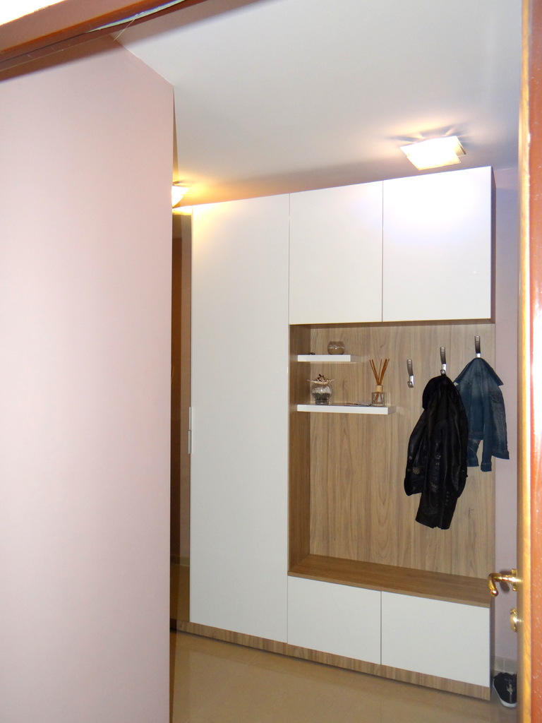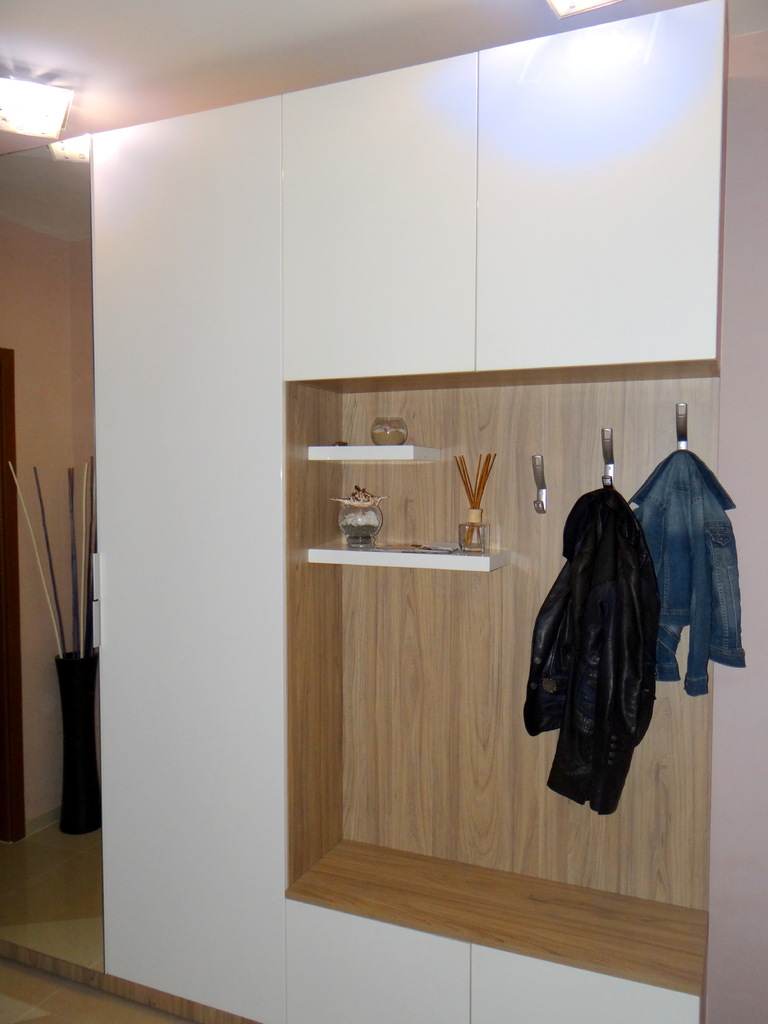 Белия гланц и огледалното крило дават дълбочина и светлина на малкото пространство в коридора. Портмантото е решено в два гардеробни модула единия с огледална, а другия с врата бял гланц. Надстройката и шкафа за обувки също са бял гланц, както и декоратичните рафтчета. Материала използван за всички бели елементи е МДФ- боядисън с гланцово покритие. Корпусите са изработени от ламинирано ПДЧ в дървесен декор. Гардеробните врати са с нежни кантдръжки, а всички малки врати са на пуш системи за изчистена линия. Функционално, елегантно и модетно решение за апартамента. Моделът се изработва само по поръчка, в богата цетова гама и размери на клиента.