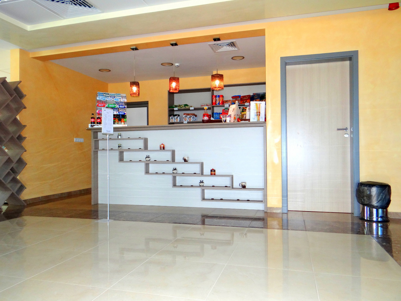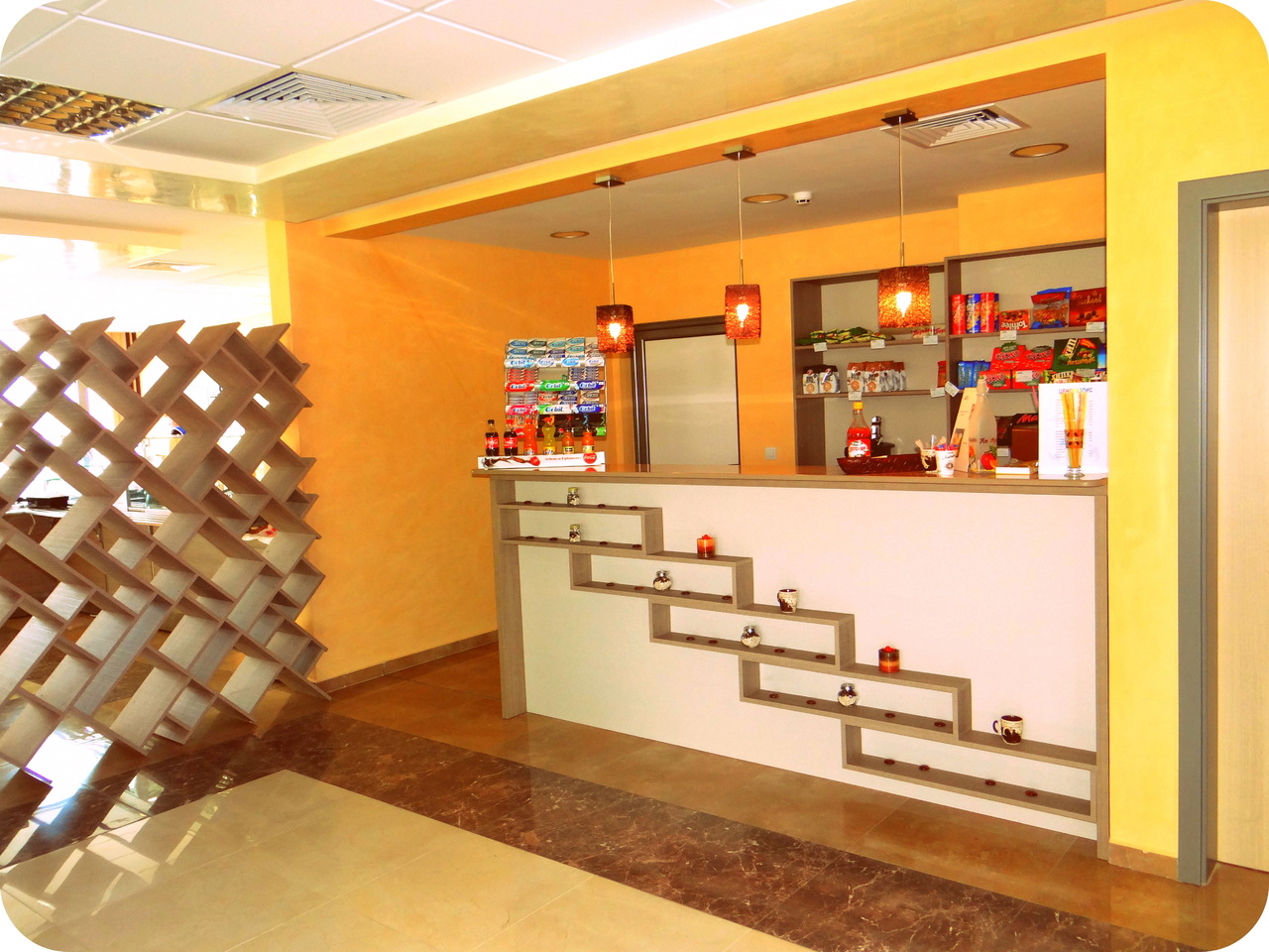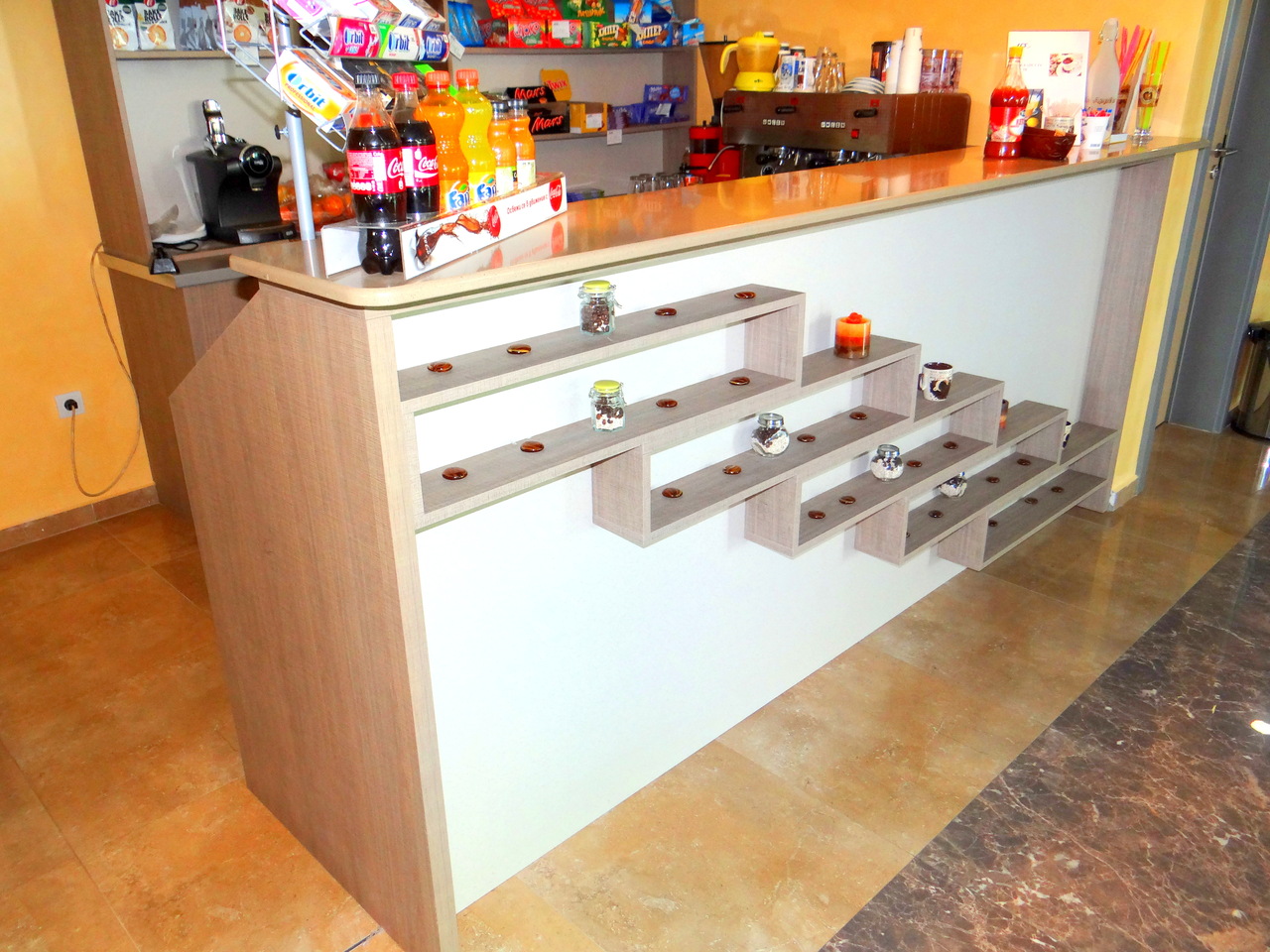 Изработка на барове, рукванд, маси и цялостни интериорни решения за кафенета. Тук пространството на трапезарната част за хранене е отделена от кафенето с атрактивна решетка, повтаряща елементите, които обличат колоните. Плотовете за масите са с богат избот на декори, основите също имат разнообразни форми и различни материали. Столовете са подбрани в съответствие с цялостния интериор.