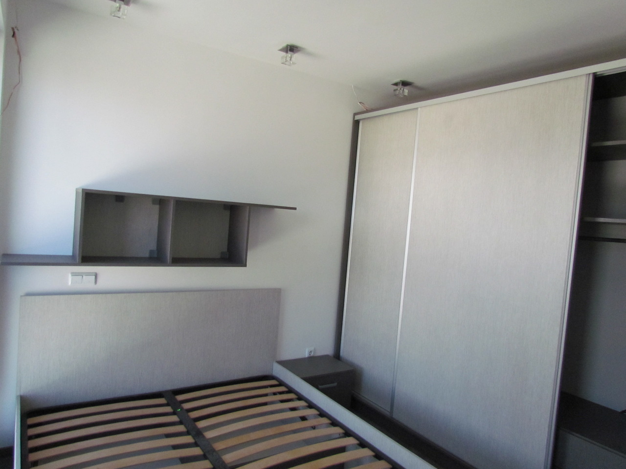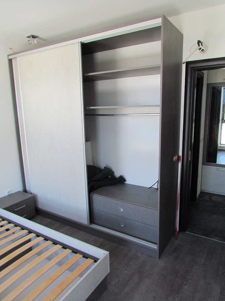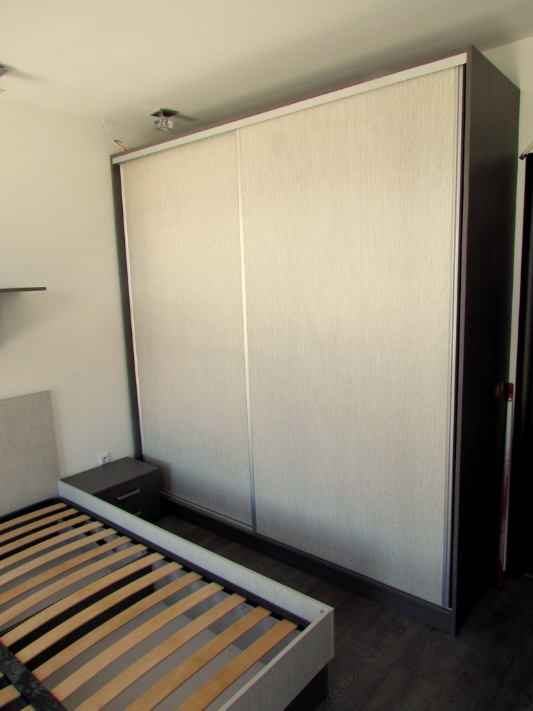 Спалнята е част от цялостно обзавеждане за дома от серията Ням филм. Спалното обзавеждане включва спланя с подматрачна рамка и повдигащ мехенизъм, двукрилен гардероб с плъзгащи врати, нощно шкафче и стенна етажерка. Всички компоненти от бозавеждането могат да се изработят по индивидуални размери в богата цветова гама. Мебелите, които ние предлагаме се изработват изцяло по поръчка, което ни дава възможност да оползотворим максимално пространството, с което разполагате и да създадем мебели, носещи вашия личен почерк.