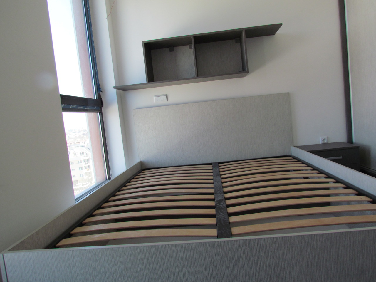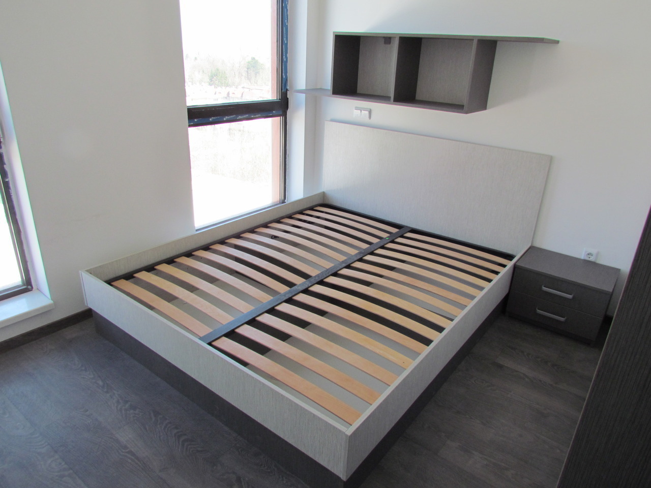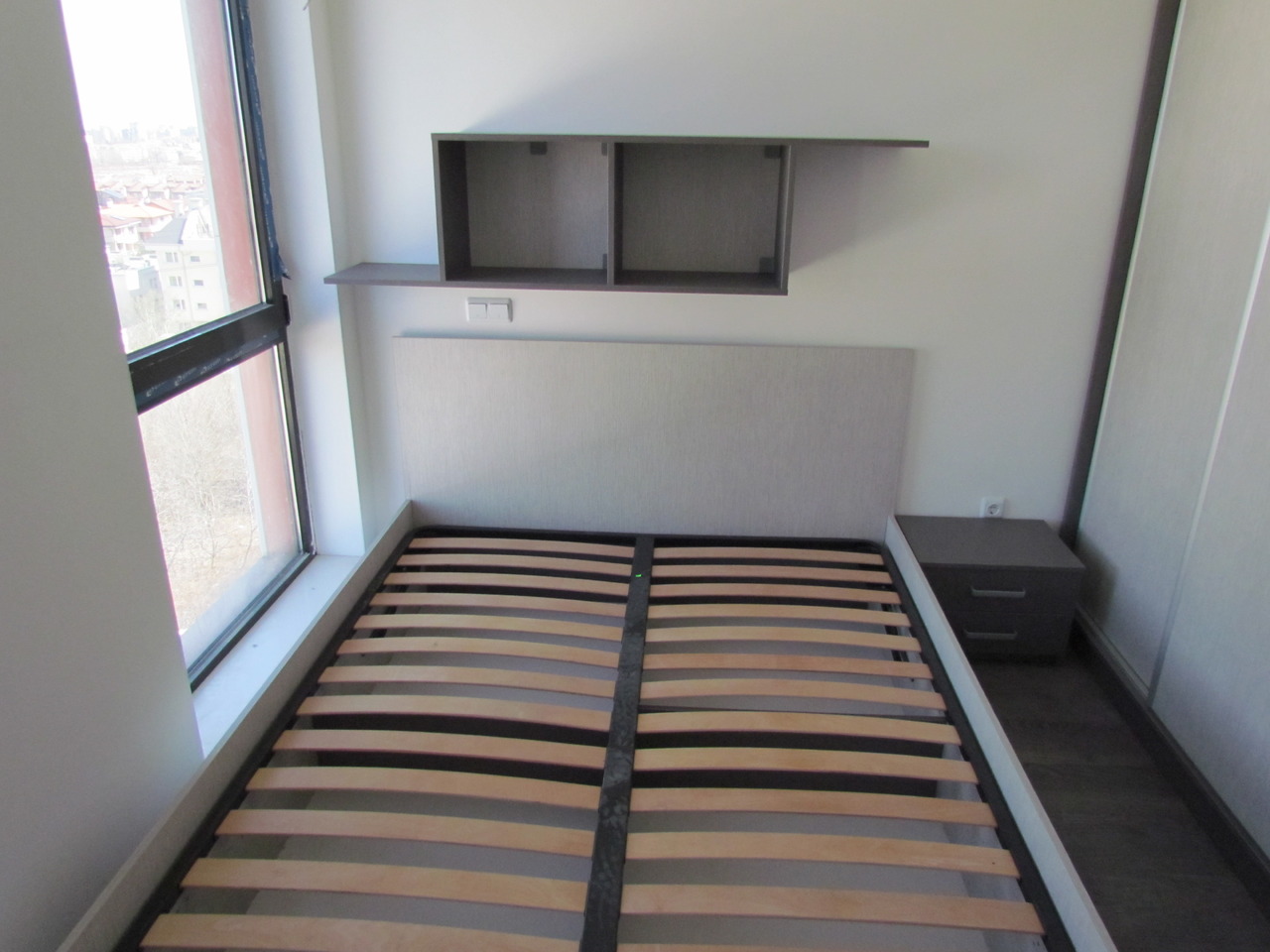Спалнята е част от цялостно обзавеждане за дома от серията Ням филм. Спалното обзавеждане включва спланя с подматрачна рамка и повдигащ мехенизъм, двукрилен гардероб с плъзгащи врати, нощно шкафче и стенна етажерка. Всички компоненти от бозавеждането могат да се изработят по индивидуални размери в богата цветова гама. Мебелите, които ние предлагаме се изработват изцяло по поръчка, което ни дава възможност да оползотворим максимално пространството, с което разполагате и да създадем мебели, носещи вашия личен почерк.