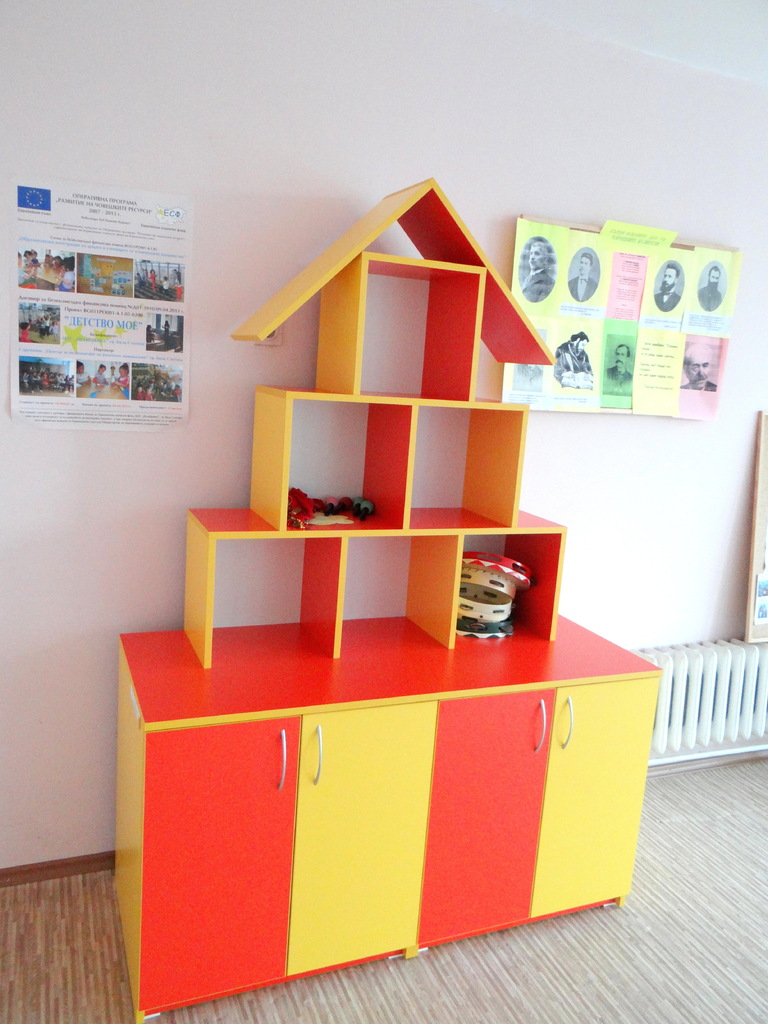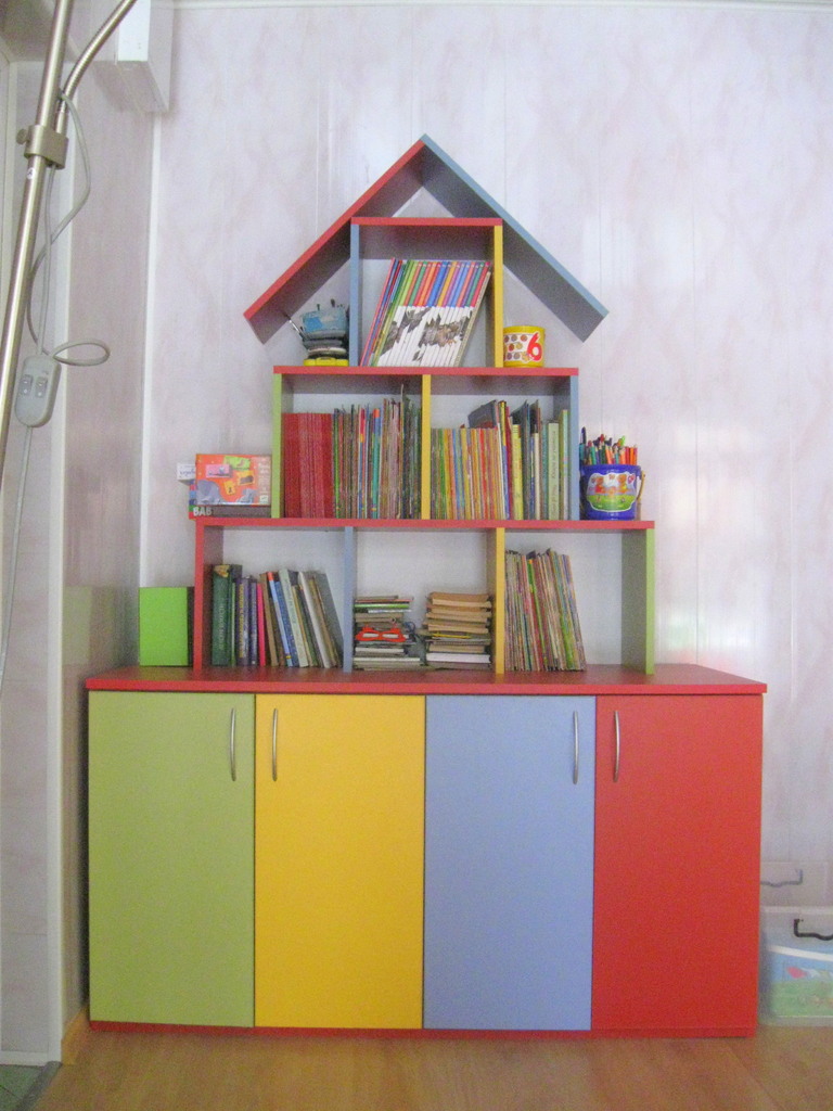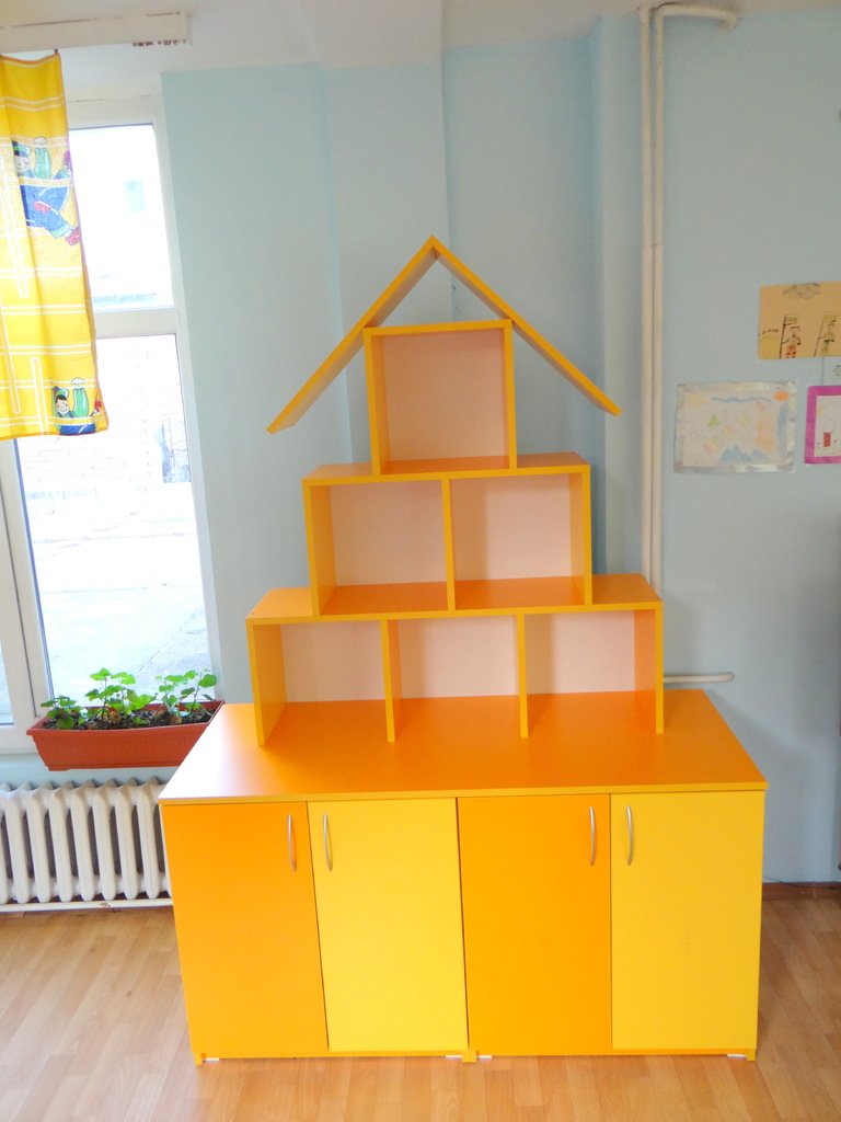 Шкафът е изработен във свежи детски цветове във формата на къщичка, следвайки цялостната линия на обзавеждането. Къщичката е много функционален и забавен шкаф, който може да бъде изработен в разнообразни цветове по индивидуални размери на клиента. Доставката и монетажа на мебелити по поръчка са напълно безплатни за София.