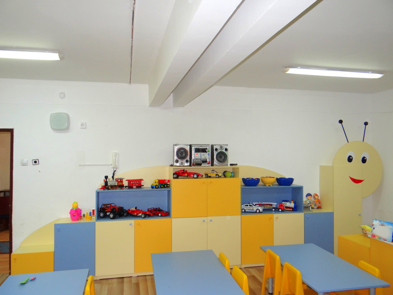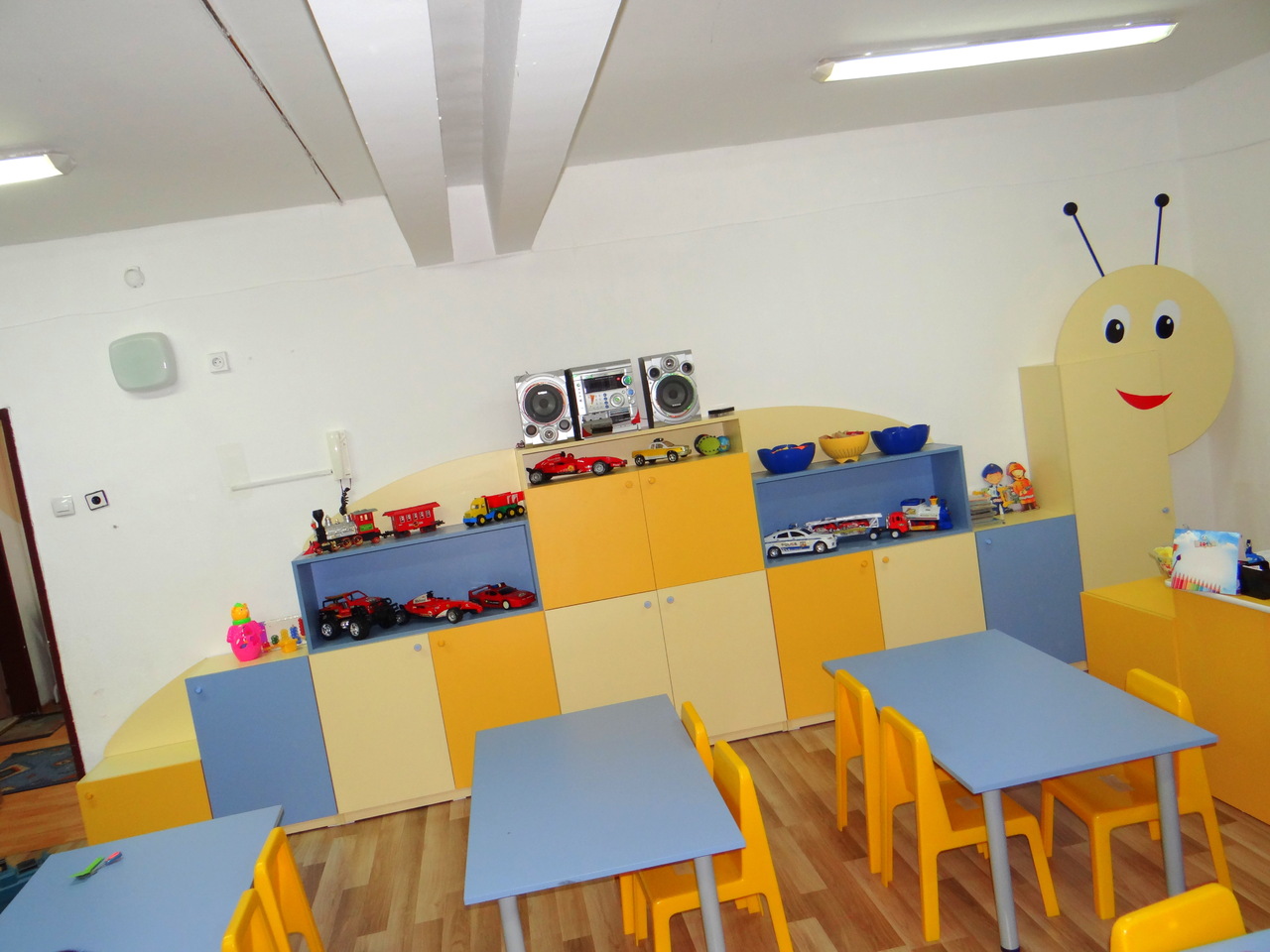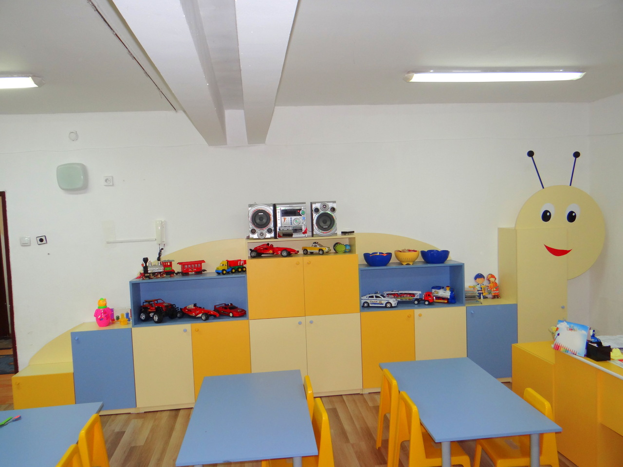 Шкафа е проектиран и изработен като охльовче, създавайки настроение в групата. Той е съобразен изцяло с нуждите на градинска група, като е разделена на модули с врати изцяло затворени за прибиране на консумативи, отворени части за играчки и рафт за телевизора и останалата техника. Всички дидактични шкафове се изработват изцяло по поръчка с богат избор на цветови решения.