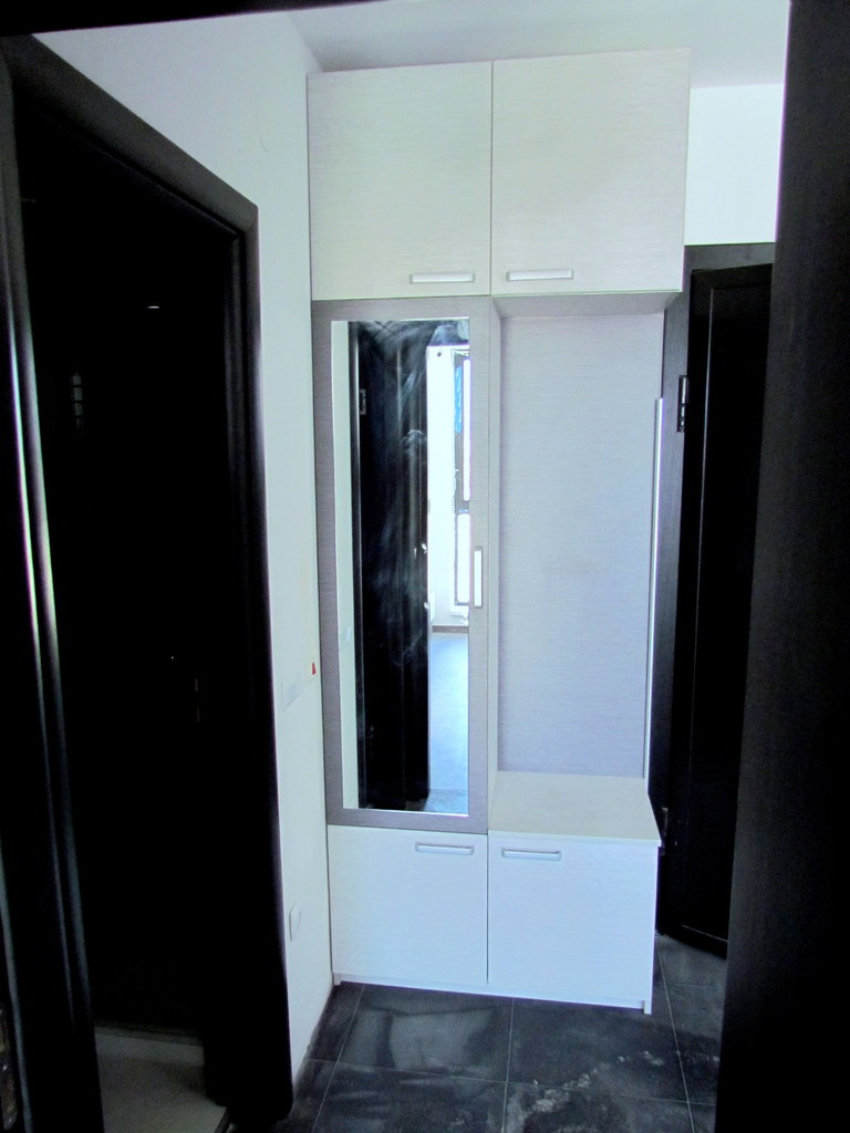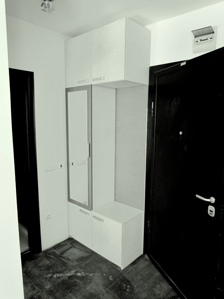 Изключително стилизираните линии, подсилени от чистотата на белия декор правят това портманто една функционална мебел, която придава на входа на жилището свежест и я озарява със светлина. Моделът се състои от шкаф за обувки, върху който може да се седне, за да си обуем обувките, еднокрилно гардеробче за дрехи и надстройка за шапки например. Огледалото е поставено върху вратата на гардероба. Моделът е изработен от Ламинирано ПДЧ и висококачествен мебелен обков. Всеки модел мебели за антре се изработва по поръчка в богата цветова гама и размери на клиента.