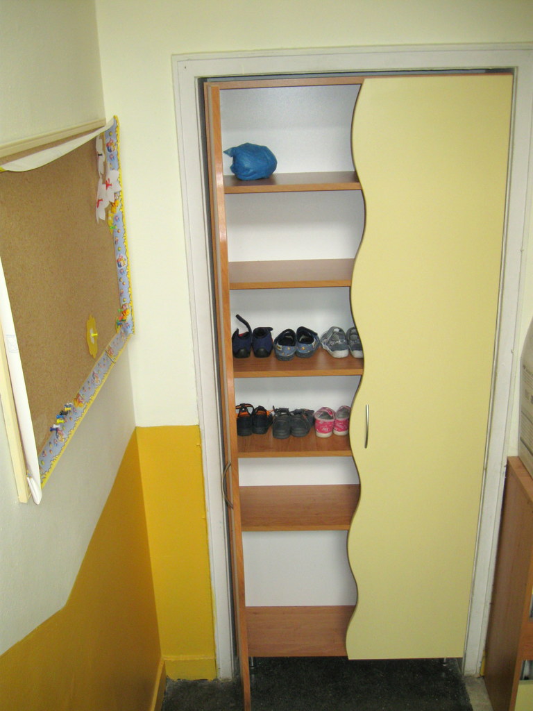 Практичен и интригуващ шкаф за обувки с вълнообразни врати. Щкафа се изработва изцяло по поръчка в богата палитра от декори и размери по поръчка на клиента.
