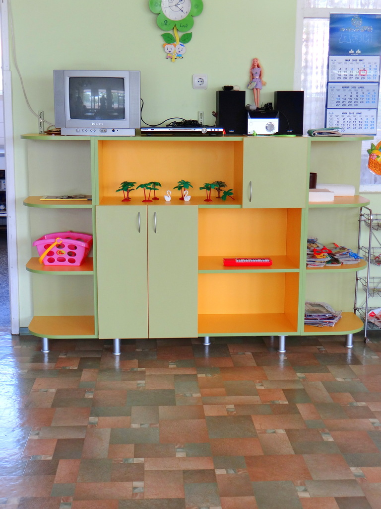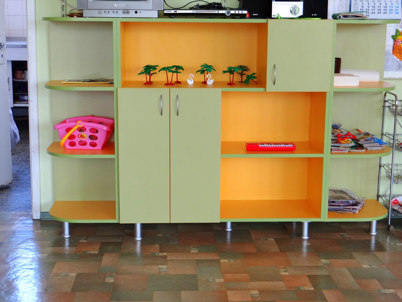 Шкафа е изработен, така че да има максимално финкционално съчетание на отворени и затворени части, добра визия и да пасва в атмосферата на групата в детската градина. Свежите цветове правят шкафа много симпатичен. Металните крачета позволяват да се мие пода безпрепятствено. Моделът може да се изработи в богата цвтова гама и индивидуални размери.