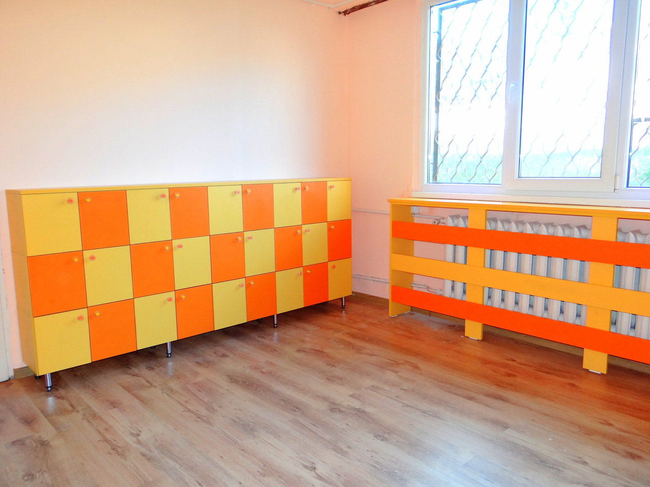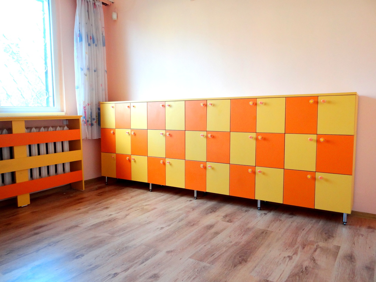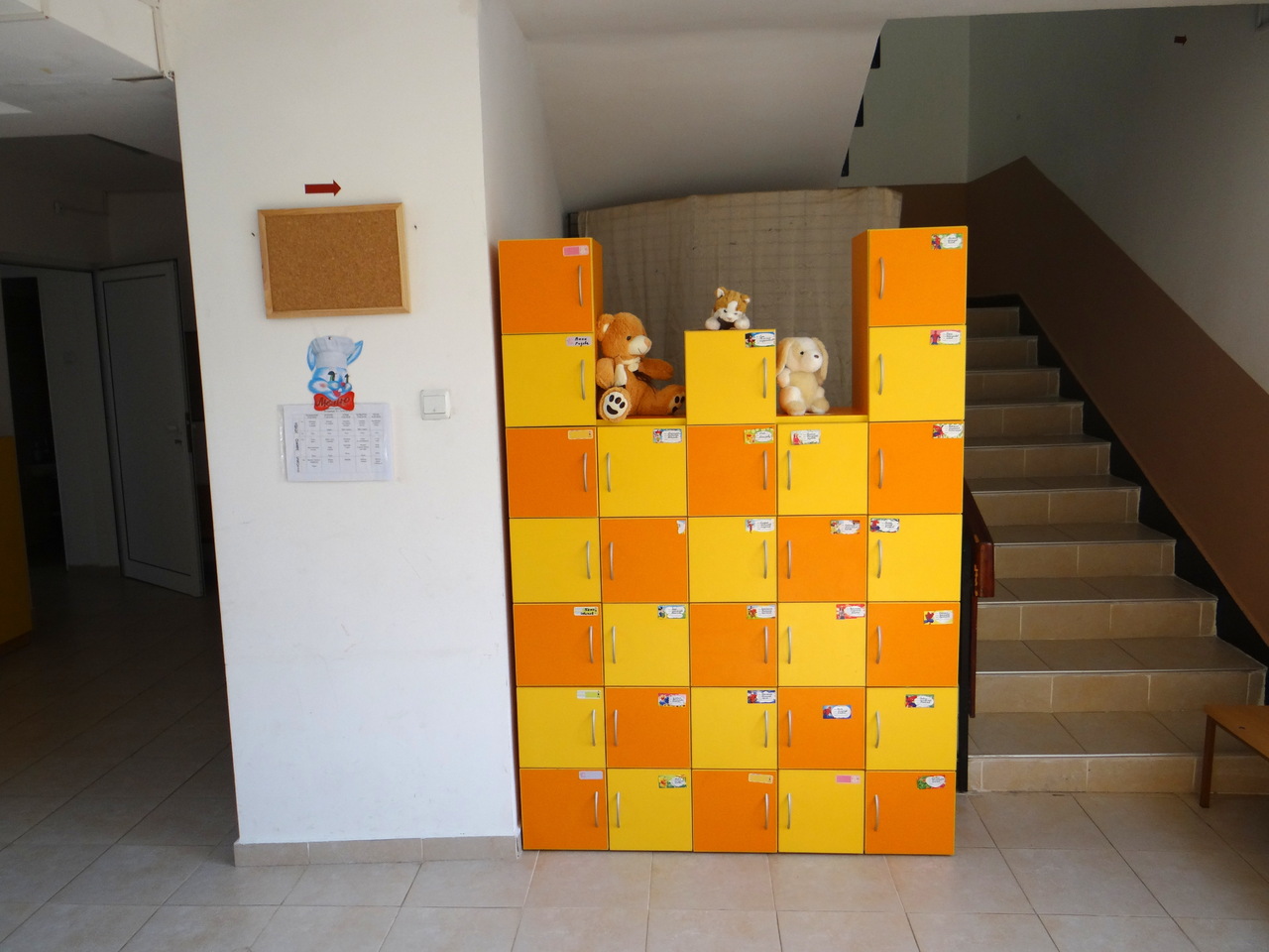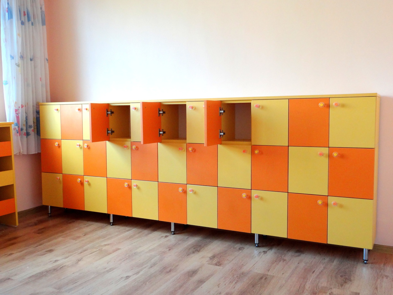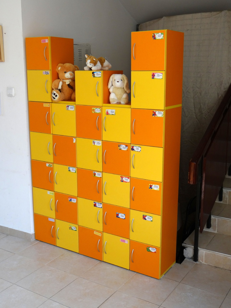 Шфчетата следва забавна шахматна схема на редуване на цветовете, за да внесе повече настроение. Шкафчетата за обувки могат да бъдат в най-разнообразни конфигурации, на няколко реда височина, или по дължина като пейка. Всичко това зависи изцяло от вашите желания, ресурси и възможностите на помещението, където ще се разположат шкафчетата. Този начин за съхранение на обувките в детските заведения е много практичен и от хигиенна гледна точка, защото щкафчетата са затворени. Цената е за една клетка с вратичка.