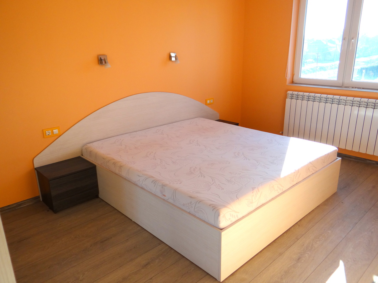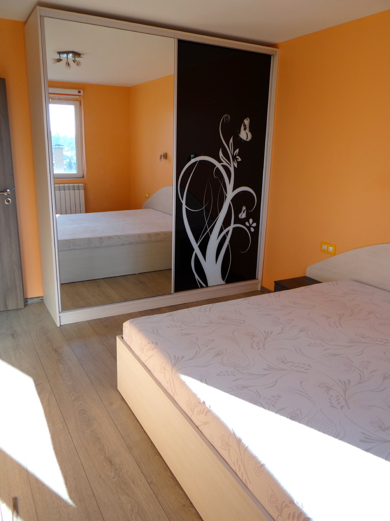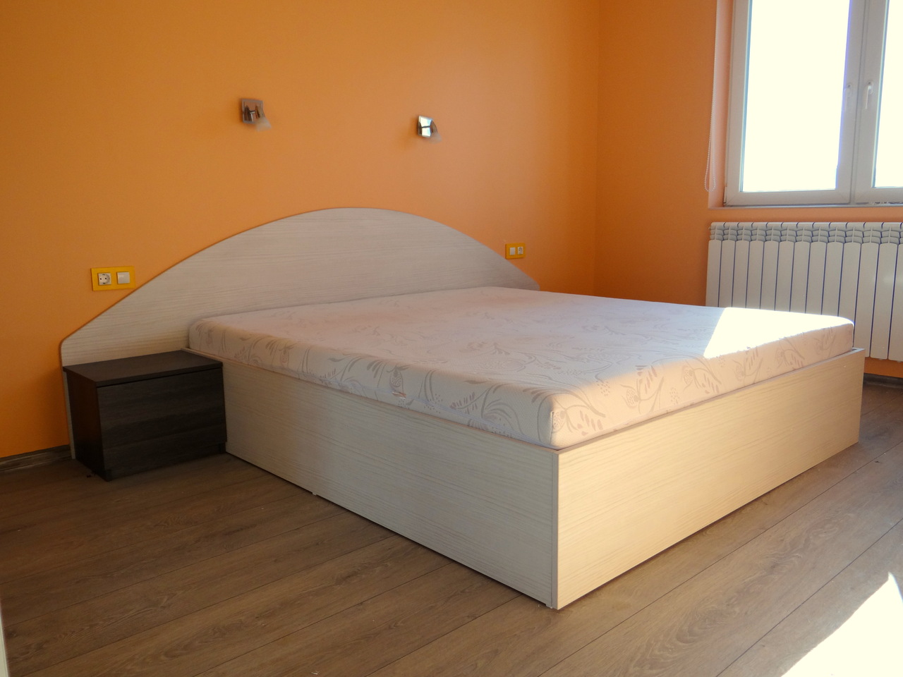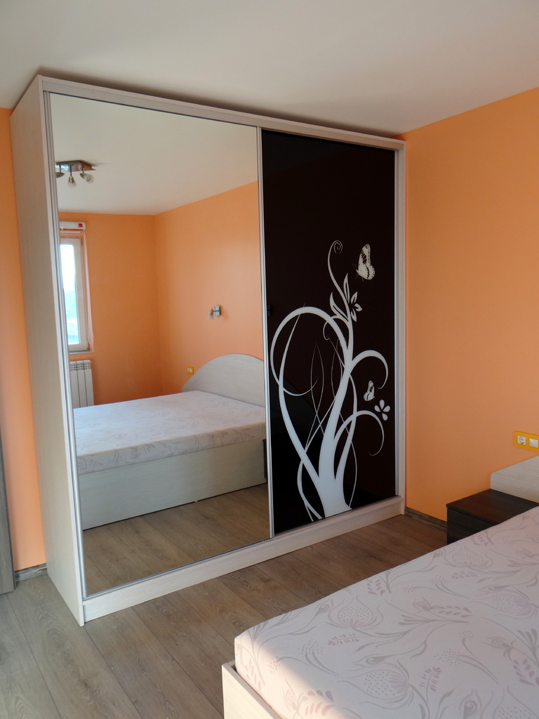 Спалното обзавеждане е изработено от висококачествено ПДЧ изцяло според размерите и възможностите на помещението. Гардероба е двукрилен с плъзгащи врати, като едната е изцяло огледална, а другата е принтстъкло с мотиви избрани от собственичката. Спалнята е с подматрачна рамка и повдигащ меганизъм и с две компактни нощни шкафчета. Цялостната линия е изчистена и стилна, като принтстъклото.