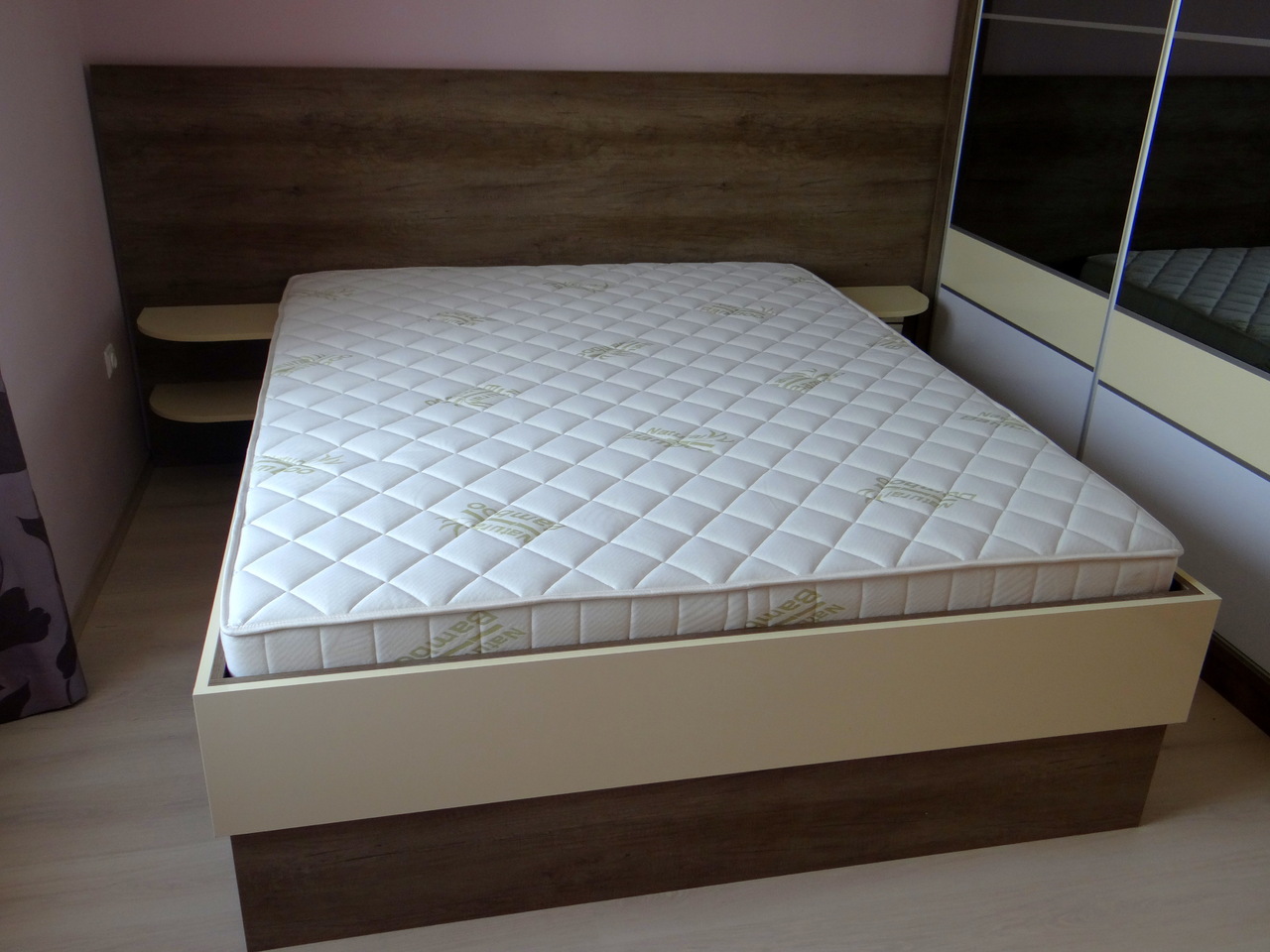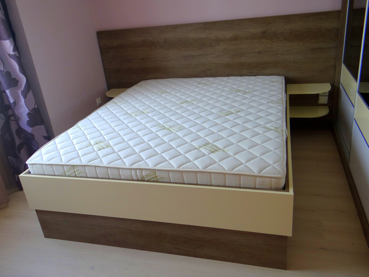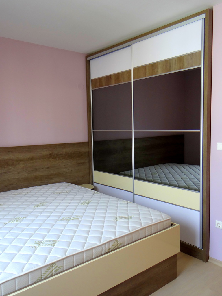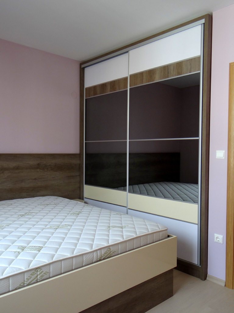 Комплекта включва спалня с повдигащ се матрак, комбинация от гланц и декор тип фладер. От двете страни има заоблени рафтчета вместо нощни шкафчета. Гардероба е с две плъзгащи се врати с комбинация от ПДЧ гланц в бяло и ванилия и затъмнени огледала. Алуминиевите кантдръжки кореспондират добре с алуминиевите лайсни свързващи отделните ивици на вартите. Моделът е много елегантен и същевременно много функционален, възможно е изработката му в богата цветова гама и размери на клиента.