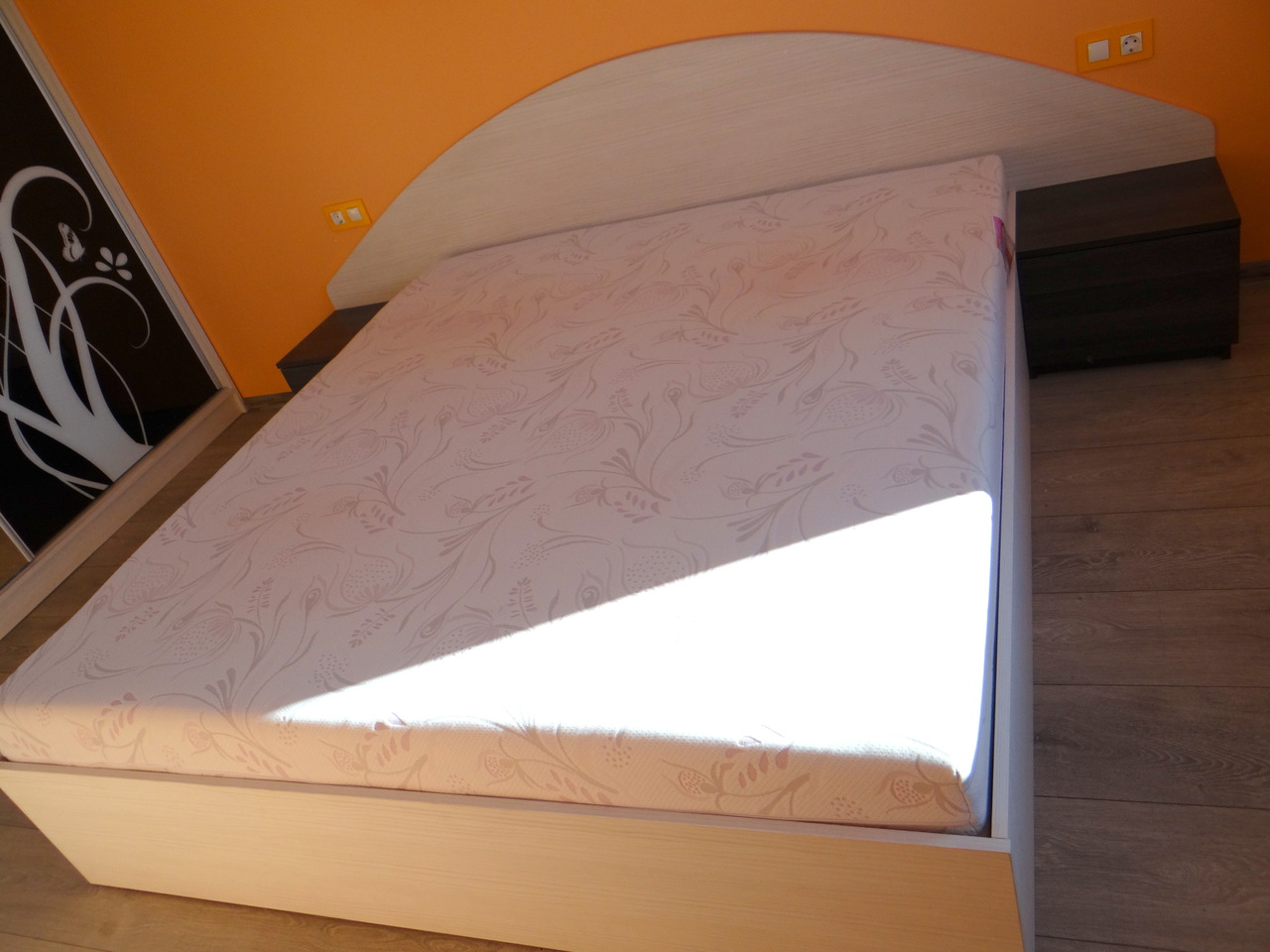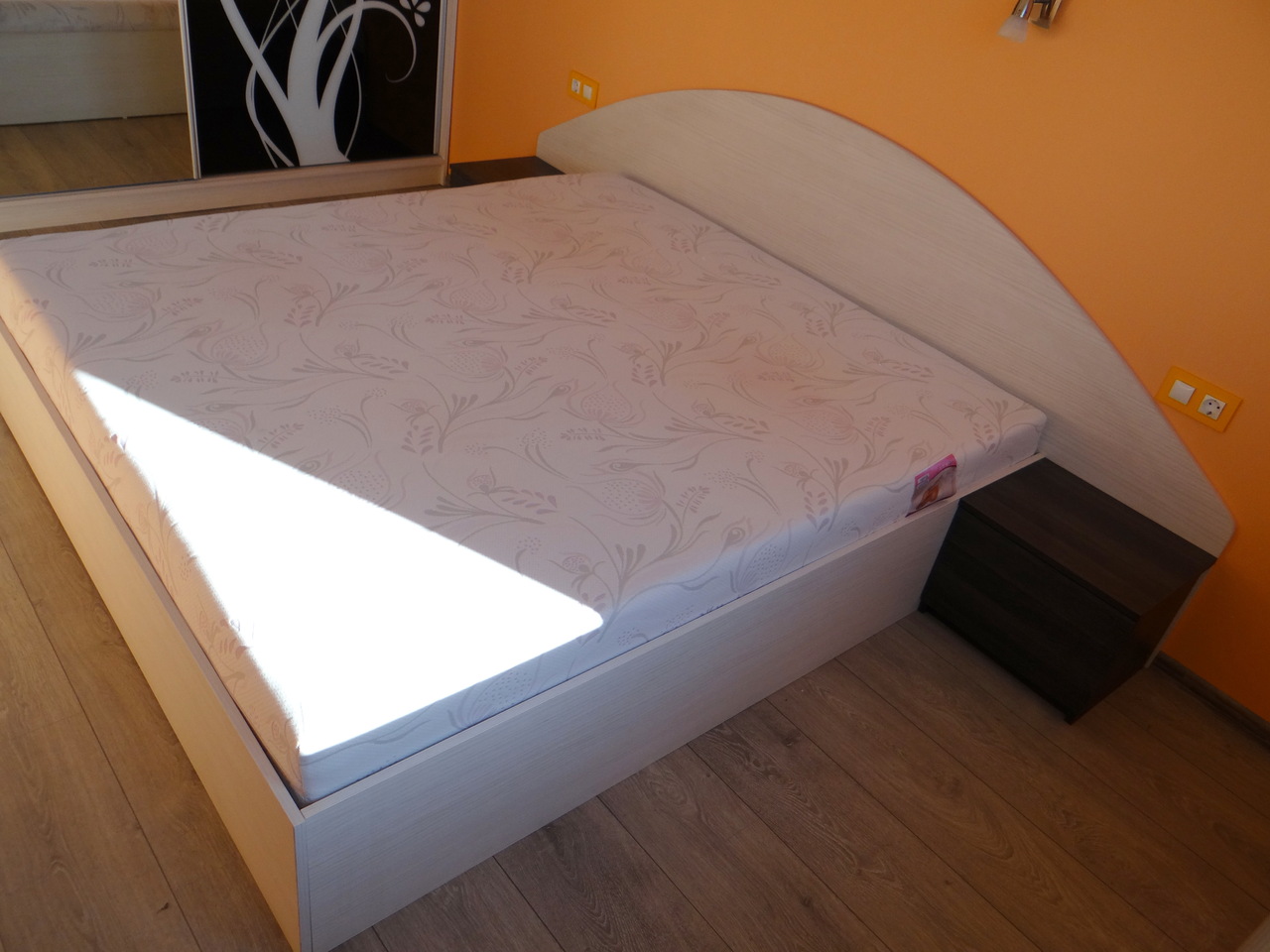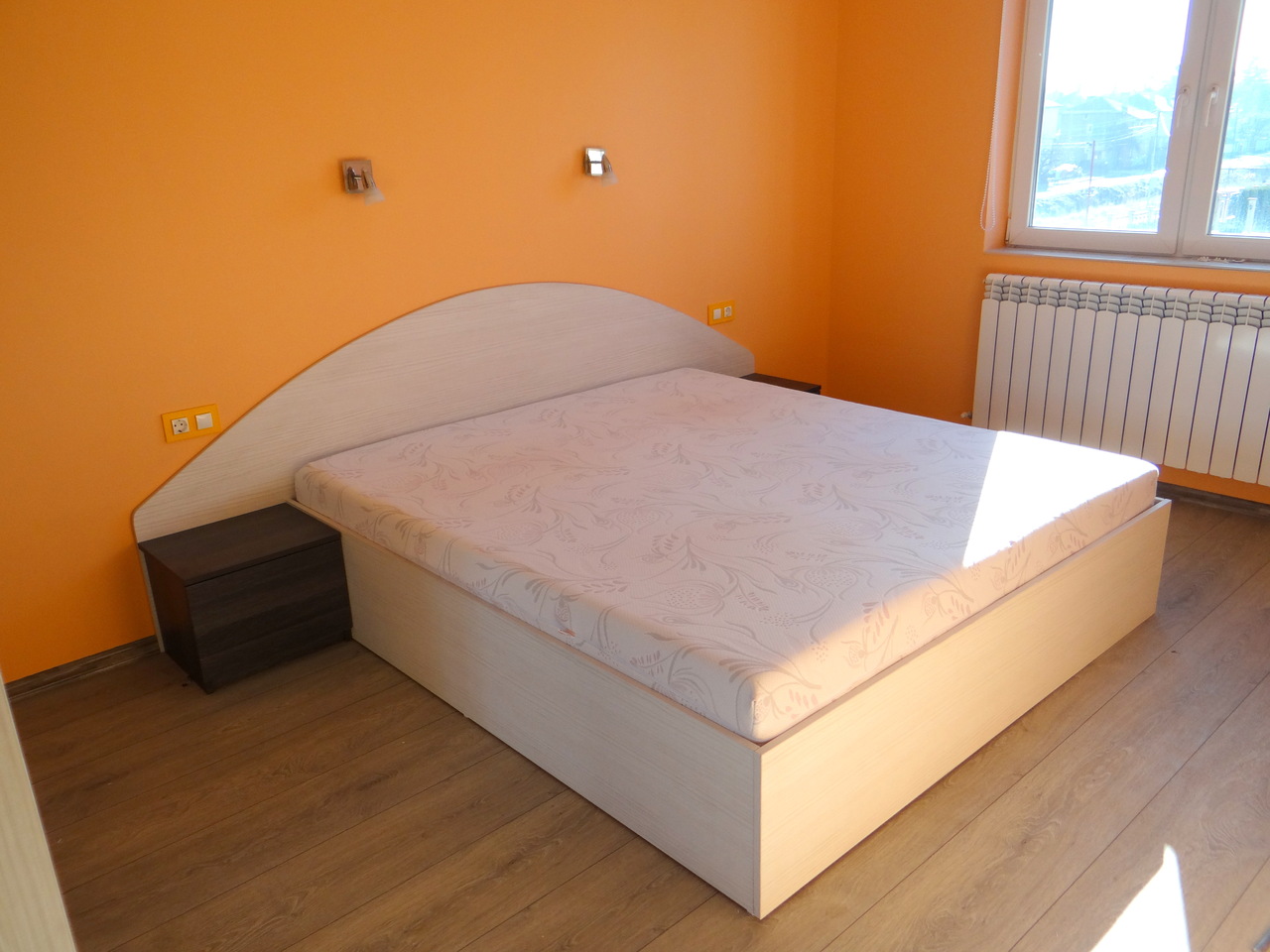Спалнята е изработено от висококачествено ПДЧ изцяло според размерите и възможностите на помещението и желанията на клиента. Спалнята е с подматрачна рамка и повдигащ меганизъм и с две компактни нощни шкафчета. Моделът се изработва по индивидуални размери в богат ацветова гама.