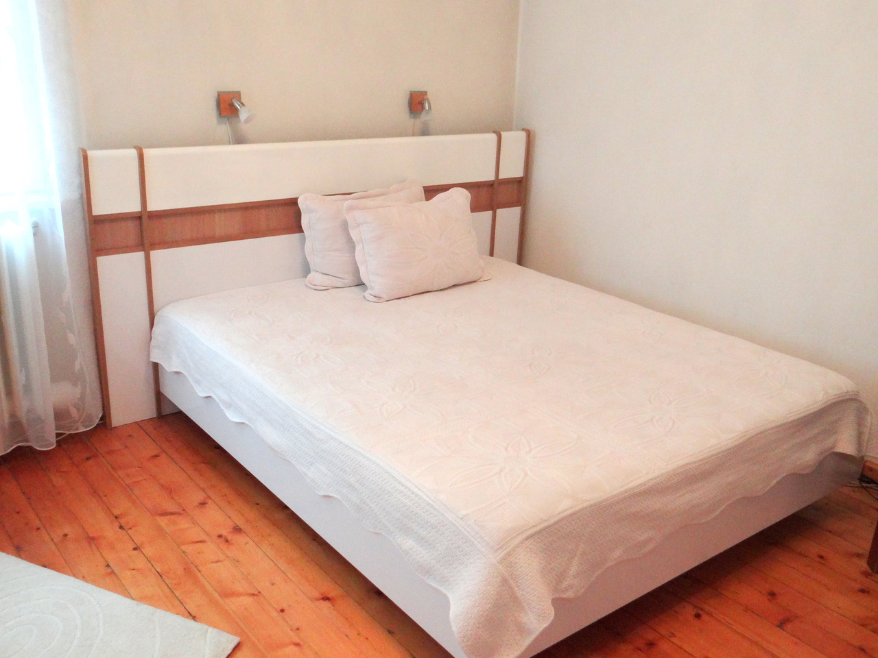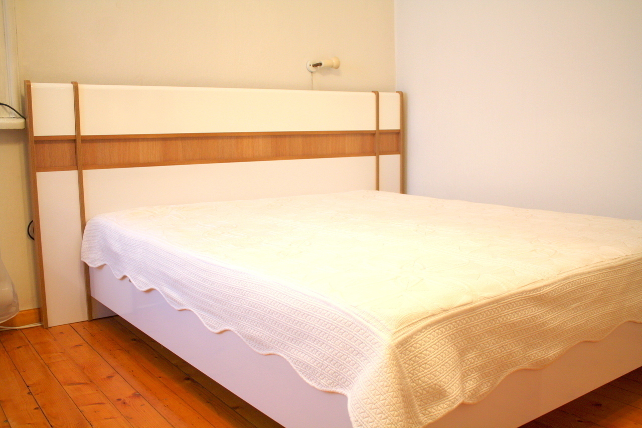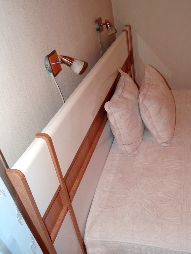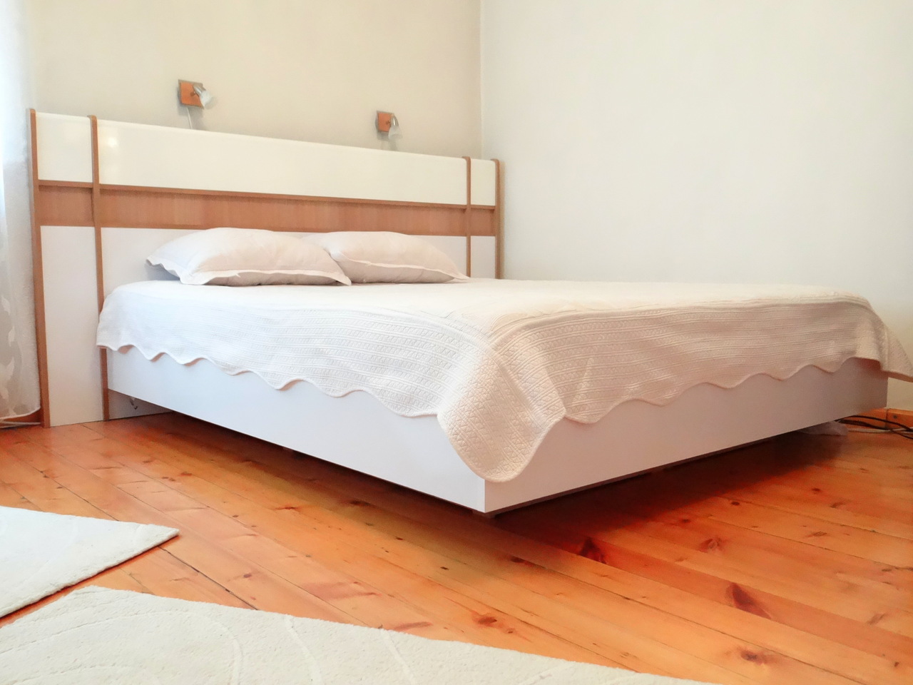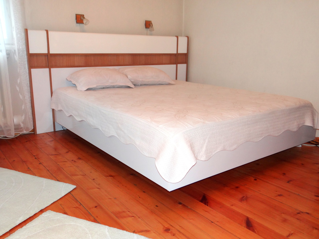 Спалнята е изработена от комбинация на ПДЧ като корпус и МДФ за таблата, която е леко извита с декоративни релефни елементи. Гланцовото покритие на спалнята позволява на светлината да се отразява и да придава на визията и още по нежно излъчване. Спалнята е с механизъм за повдигане на матрака и ракла за съхранение на дрехи под него. Спалнята се изработва по поръчка в богата цветова гама и индивидуални размери.