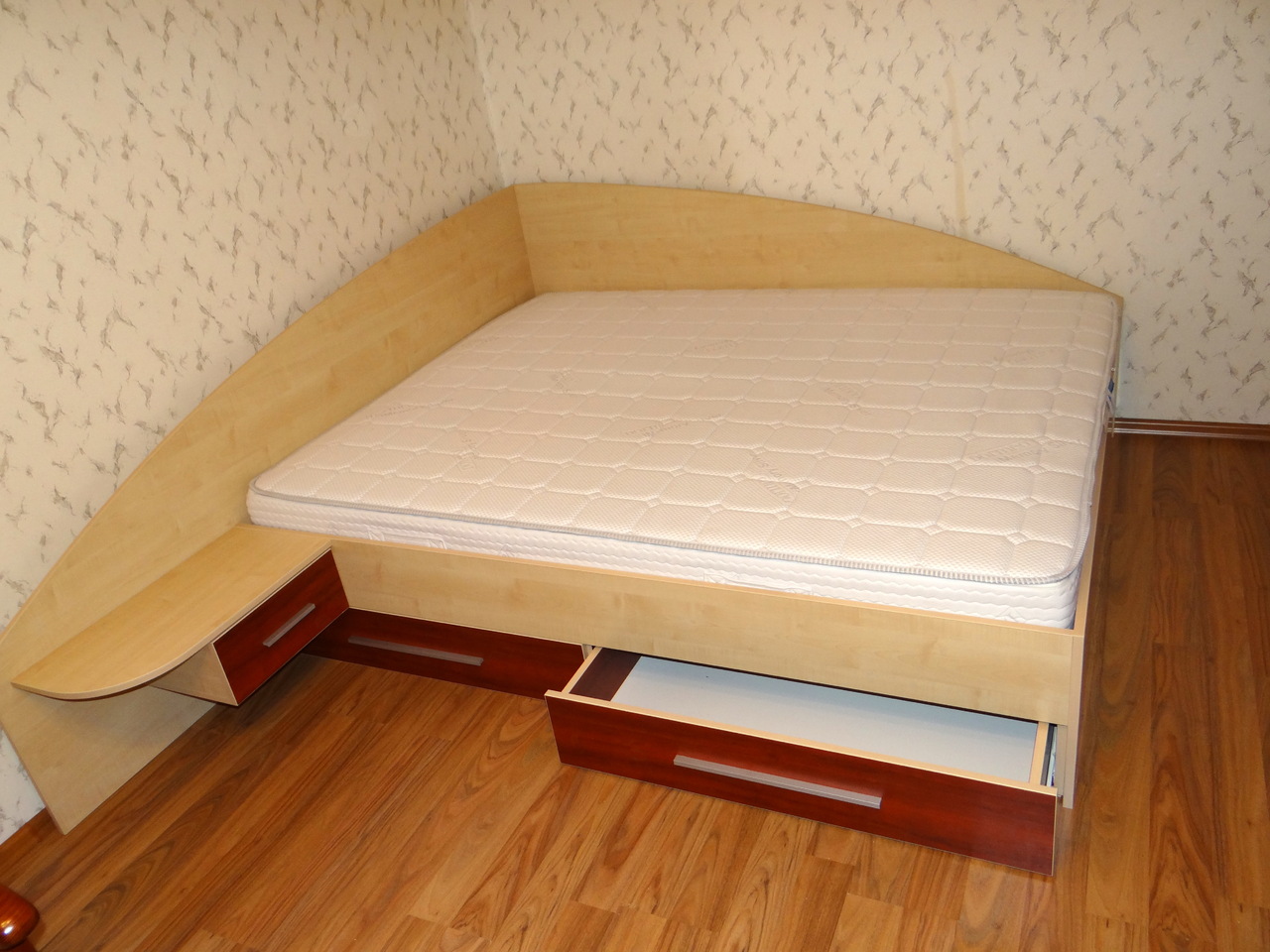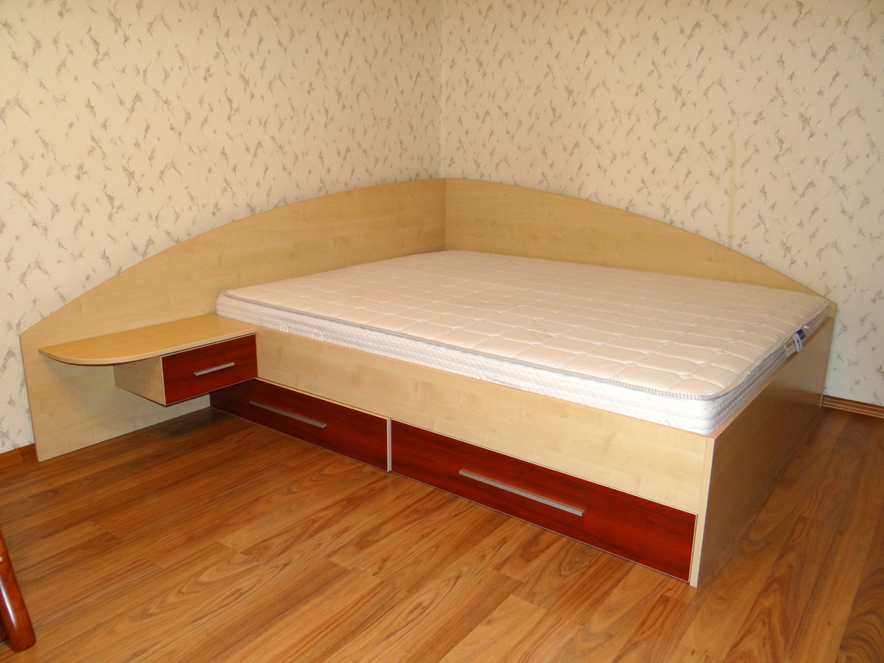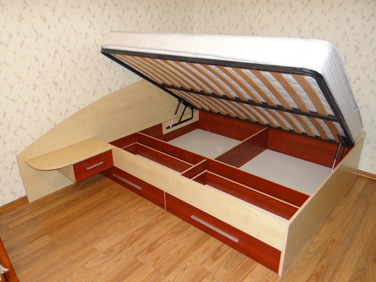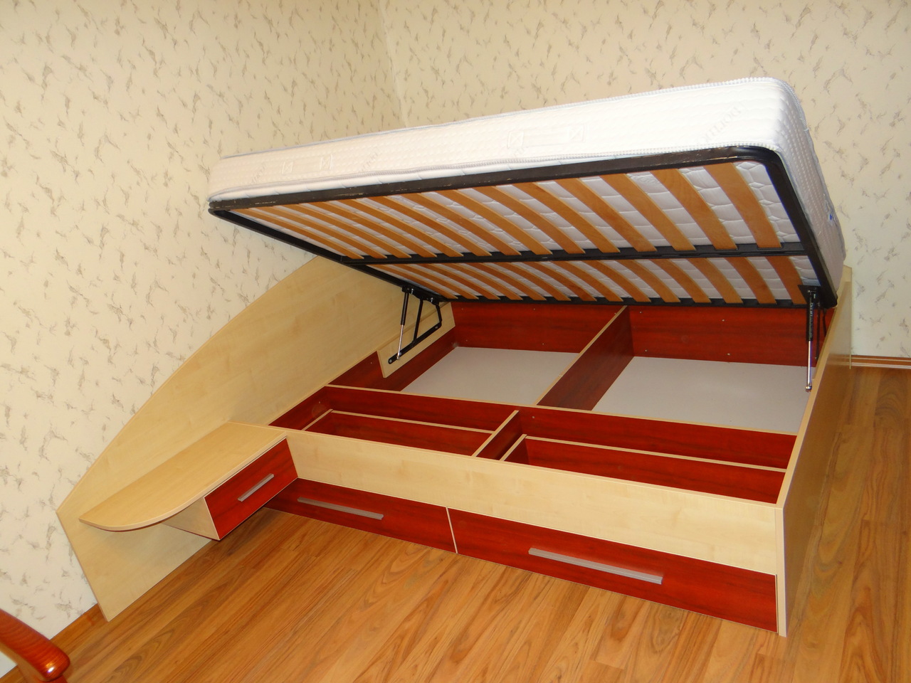 Спалнята е решена с чекмаджета под матрака и механизъм за подматарчната рамка, така че да се оползотвори максимално пространството под матрака. Подматрачната рамка е ламелна с метален корпус. Спалнята е с едно нощно шкафче. Моделът се изработва в богата цветова гама и по индивидуални размери на клиента.